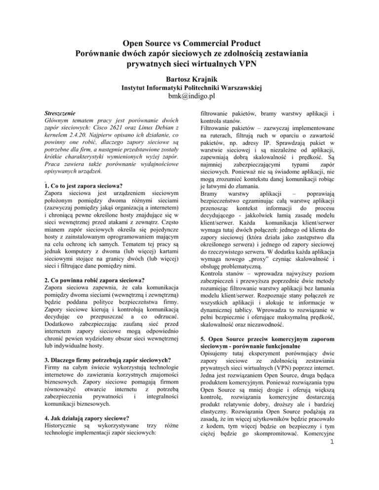 Open Source vs Commercial Product Porównanie dwóch zapór sieciowych ze zdolnością zestawiania prywatnych sieci wirtualnych VPN Bartosz Krajnik Instytut Informatyki Politechniki Warszawskiej [email protected] Streszczenie Głównym tematem pracy jest porównanie dwóch zapór sieciowych: Cisco 2621 oraz Linux Debian z kernelem 2.4.20. Najpierw opisano ich działanie, co powinny one robić, dlaczego zapory sieciowe są potrzebne dla firm, a następnie przedstawione zostały krótkie charakterystyki wymienionych wyżej zapór. Praca zawiera także porównanie wydajnościowe opisywanych urządzeń. 1. Co to jest zapora sieciowa? Zapora sieciowa jest urządzeniem sieciowym położonym pomiędzy dwoma różnymi sieciami (zazwyczaj pomiędzy jakąś organizacją a internetem) i chroniącą pewne określone hosty znajdujące się w sieci wewnętrznej przed atakami z zewnątrz. Często mianem zapór sieciowych określa się pojedyncze hosty z zainstalowanym oprogramowaniem mającym na celu ochronę ich samych. Tematem tej pracy są jednak komputery z dwoma (lub więcej) kartami sieciowymi stojące na granicy dwóch (lub więcej) sieci i filtrujące dane pomiędzy nimi. 2. Co powinna robić zapora sieciowa? Zapora sieciowa zapewnia, że cała komunikacja pomiędzy dwoma sieciami (wewnętrzną i zewnętrzną) będzie poddana polityce bezpieczeństwa firmy. Zapory sieciowe kierują i kontrolują komunikacją decydując co przepuszczać a co odrzucać. Dodatkowo zabezpieczając zaufaną sieć przed internetem zapory sieciowe mogą odpowiednio chronić pewien wydzielony obszar sieci wewnętrznej lub indywidualne hosty. 3. Dlaczego firmy potrzebują zapór sieciowych? Firmy na całym świecie wykorzystują technologie internetowe do zawierania korzystnych znajomości biznesowych. Zapory sieciowe pomagają firmom równoważyć otwarcie internetu z potrzebą zabezpieczenia prywatności i integralności komunikacji biznesowych. 4. Jak działają zapory sieciowe? Historycznie są wykorzystywane trzy technologie implementacji zapór sieciowych: różne filtrowanie pakietów, bramy warstwy aplikacji i kontrola stanów. Filtrowanie pakietów – zazwyczaj implementowane na ruterach, filtrują ruch w oparciu o zawartość pakietów, np. adresy IP. Sprawdzają pakiet w warstwie sieciowej i są niezależne od aplikacji, zapewniają dobrą skalowalność i prędkość. Są najmniej zabezpieczającymi typami zapór sieciowych. Ponieważ nie są świadome aplikacji, nie mogą zrozumieć kontekstu danej komunikacji robiąc je łatwymi do złamania. Bramy warstwy aplikacji – poprawiają bezpieczeństwo egzaminując całą warstwę aplikacji przenosząc kontekst informacji do procesu decydującego - jakkolwiek łamią zasadę modelu klient/serwer. Każda komunikacja klient/serwer wymaga tutaj dwóch połączeń: jednego od klienta do zapory sieciowej (która działa jako zastępstwo dla określonego serwera) i jednego od zapory sieciowej do rzeczywistego serwera. W dodatku każda aplikacja wymaga nowego „proxy” czyniąc skalowalność i obsługę problematyczną. Kontrola stanów – wprowadza najwyższy poziom zabezpieczeń i przewyższa poprzednie dwie metody rozumiejąc filtrowanie warstwy aplikacji bez łamania modelu klient/serwer. Rozpoznaje stany połączeń ze wszystkich aplikacji i alokuje te informacje w dynamicznej tablicy. Wprowadza to rozwiązanie w pełni bezpiecznie i oferujące maksymalną prędkość, skalowalność oraz niezawodność. 5. Open Source przeciw komercyjnym zaporom sieciowym - porównanie funkcjonalne Opisujemy tutaj eksperyment porównujący dwie zapory sieciowe ze zdolnością zestawiania prywatnych sieci wirtualnych (VPN) poprzez internet. Jedna jest rozwiązaniem Open Source, druga będąca produktem komercyjnym. Ponieważ rozwiązania typu Open Source są mniej drogie i oferują większą kontrolę, rozwiązania komercyjne dostarczają produkt relatywnie dobry, droższy ale i bardziej elastyczny. Rozwiązania Open Source podążają za zasadą, że im więcej użytkowników będzie pracowało z kodem, tym więcej będzie on bezpieczny i tym ciężej będzie go skompromitować. Komercyjne 1 rozwiązania argumentują ukrywanie kodu źródłowego jako zmniejszenie prawdopodobieństwa na złamanie systemu. Dane dotyczące zapory sieciowej Cisco pochodzą z „Illinois State University - Department of Applied Computer Science”. 6. Porównanie wybranych zapór sieciowych Pierwsza zapora sieciowa użyta w tym porównaniu jest skonstruowana używając rozwiązania Open Source dostępnego dla systemu Debian Woody 3.0 GNU/Linux i na procesorze Pentium z dwoma kartami sieciowymi. Druga zapora sieciowa była zbudowana używając routera Cisco 2621 z systemem Cisco IOS. Całe oprogramowanie użyte na systemie Linux jest wolno dostępne na zasadzie Open Source i może być używane na różnych platformach sprzętowych, podczas gdy Cisco jest produktem komercyjnym obejmującym zarówno sprzęt jak i oprogramowanie. 7. Filtrowanie danych sieciowych w systemie Linux System Linux z kernelem 2.4 ma zaimplementowany filtr pakietów netfilter - nazywany iptables. Użyto wersji iptables-1.2.6a w połączeniu z systemem Debian GNU/Linux w wersji Woody 3.0. Iptables dokonywało rewizji wg następujących kryteriów: adres IP żródłowy/przeznaczenia, protokół, nazwa DNS, interfejs i stan połączenia. 8. Filtrowanie danych sieciowych w systemach Cisco Cisco IOS ma wbudowaną obsługę filtrowania trzech typów: statyczne filtrowanie pakietów (może być użyte przy użyciu standardowej/rozszerzonej listy dostępu do filtrowania innych protokołów), zwrotnej listy dostępu (jest używane do prowadzenia filtrowania w oparciu o stany pakietów przy użyciu Content Based Access Control - CBAC). Zwrotne listy dostępu są używane aby zezwolić użytkownikom w zabezpieczonej sieci elastycznie wysyłać dane i odpowiednio przepuszczać pakiety przychodzące w odpowiedzi. System Cisco IOS ma w