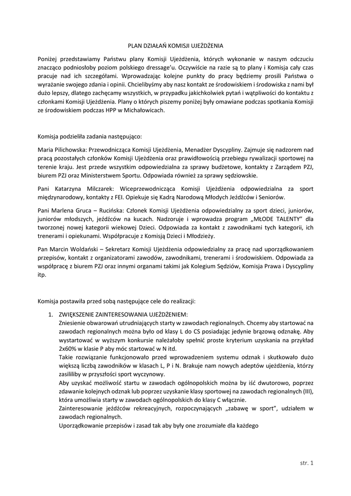 str. 1 PLAN DZIAŁAŃ KOMISJI UJEŻDŻENIA Poniżej przedstawiamy