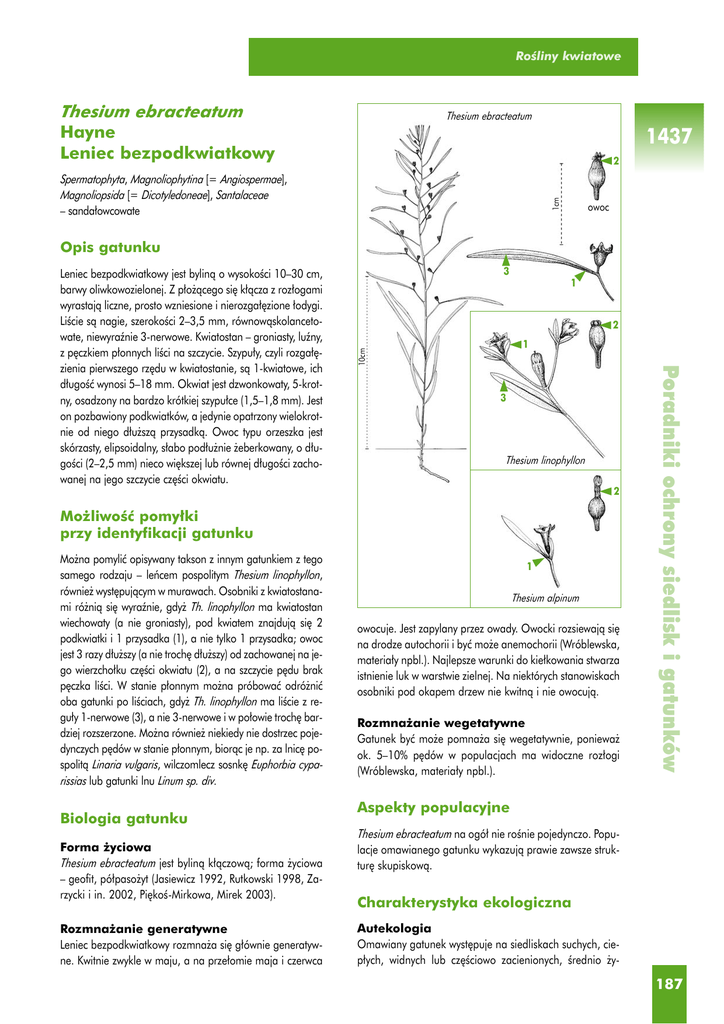 RoÊliny kwiatowe Thesium ebracteatum Hayne Leniec bezpodkwiatkowy Thesium ebracteatum 1437 2 1cm Spermatophyta, Magnoliophytina [= Angiospermae], Magnoliopsida [= Dicotyledoneae], Santalaceae – sanda∏owcowate owoc Opis gatunku 3 1 2 10cm 1 3 Thesium linophyllon 2 Mo˝liwoÊç pomy∏ki przy identyfikacji gatunku Mo˝na pomyliç opisywany takson z innym gatunkiem z tego samego rodzaju – leƒcem pospolitym Thesium linophyllon, równie˝ wyst´pujàcym w murawach. Osobniki z kwiatostanami ró˝nià si´ wyraênie, gdy˝ Th. linophyllon ma kwiatostan wiechowaty (a nie groniasty), pod kwiatem znajdujà si´ 2 podkwiatki i 1 przysadka (1), a nie tylko 1 przysadka; owoc jest 3 razy d∏u˝szy (a nie troch´ d∏u˝szy) od zachowanej na jego wierzcho∏ku cz´Êci okwiatu (2), a na szczycie p´du brak p´czka liÊci. W stanie p∏onnym mo˝na próbowaç odró˝niç oba gatunki po liÊciach, gdy˝ Th. linophyllon ma liÊcie z regu∏y 1-nerwowe (3), a nie 3-nerwowe i w po∏owie troch´ bardziej rozszerzone. Mo˝na równie˝ niekiedy nie dostrzec pojedynczych p´dów w stanie p∏onnym, bioràc je np. za lnic´ pospolità Linaria vulgaris, wilczomlecz sosnk´ Euphorbia cyparissias lub gatunki lnu Linum sp. div. Biologia gatunku Forma ˝yciowa Thesium ebracteatum jest bylinà k∏àczowà; forma ˝yciowa – geofit, pó∏paso˝yt (Jasiewicz 1992, Rutkowski 1998, Zarzycki i in. 2002, Pi´koÊ-Mirkowa, Mirek 2003). Rozmna˝anie generatywne Leniec bezpodkwiatkowy rozmna˝a si´ g∏ównie generatywne. Kwitnie zwykle w maju, a na prze∏omie maja i czerwca 1 Thesium alpinum owocuje. Jest zapylany przez owady. Owocki rozsiewajà si´ na drodze autochorii i byç mo˝e anemochorii (Wróblewska, materia∏y npbl.). Najlepsze warunki do kie∏kowania stwarza istnienie luk w warstwie zielnej. Na niektórych stanowiskach osobniki pod okapem drzew nie kwitnà i nie owocujà. Rozmna˝anie wegetatywne Gatunek byç mo˝e pomna˝a si´ wegetatywnie, poniewa˝ ok. 5–10% p´dów w populacjach ma widoczne roz∏ogi (Wróblewska, materia∏y npbl.). Poradniki ochrony siedlisk i gatunków Leniec bezpodkwiatkowy jest bylinà o wysokoÊci 10–30 cm, barwy oliwkowozielonej. Z p∏o˝àcego si´ k∏àcza z roz∏ogami wyrastajà liczne, prosto wzniesione i nierozga∏´zione ∏odygi. LiÊcie sà nagie, szerokoÊci 2–3,5 mm, równowàskolancetowate, niewyraênie 3-nerwowe. Kwiatostan – groniasty, luêny, z p´czkiem p∏onnych liÊci na szczycie. Szypu∏y, czyli rozga∏´zienia pierwszego rz´du w kwiatostanie, sà 1-kwiatowe, ich d∏ugoÊç wynosi 5–18 mm. Okwiat jest dzwonkowaty, 5-krotny, osadzony na bardzo krótkiej szypu∏ce (1,5–1,8 mm). Jest on pozbawiony podkwiatków, a jedynie opatrzony wielokrotnie od niego d∏u˝szà przysadkà. Owoc typu orzeszka jest skórzasty, elipsoidalny, s∏abo pod∏u˝nie ˝eberkowany, o d∏ugoÊci (2–2,5 mm) nieco wi´kszej lub równej d∏ugoÊci zachowanej na jego szczycie cz´Êci okwiatu. Aspekty populacyjne Thesium ebracteatum na ogó∏ nie roÊnie pojedynczo. Populacje omawianego gatunku wykazujà prawie zawsze struktur´ skupiskowà. Charakterystyka ekologiczna Autekologia Omawiany gatunek wyst´puje na siedliskach suchych, ciep∏ych, widnych lub cz´Êciowo zacienionych, Êrednio ˝y- 187 Gatunki roÊlin Poradniki ochrony siedlisk i gatunków 1437 znych. Preferuje gleby o odczynie oboj´tnym lub zasadowym (Oberdorfer 1990, Fija∏kowski 1994, Zarzycki i in. 2002). Ekologiczne liczby wskaênikowe Êwiat∏a, temperatury, reakcji (odczynu gleby) i trofizmu (azotu) wynoszà odpowiednio: wg Ellenberga i in. (1992): L = 7, T = 6, R = 2, N = 2; wg Zarzyckiego i in. (2002): L = 4, T = 4–3, R = 4, Tr = 3. Zbiorowiska roÊlinne, z którymi gatunek jest zwiàzany Leniec bezpodkwiatkowy zwiàzany jest z ciep∏olubnà roÊlinnoÊcià murawowà, okrajkowà, zaroÊlowà i leÊnà; zasiedla widne skraje lasów i zaroÊli, kserotermiczne zbocza, pobocza leÊnych dróg (Fija∏kowski 1959, 1994, G∏owacki 1985, Za∏uski 1988, Wróblewska 2000, Kucharczyk 2001). Znany jest jego udzia∏ w zespo∏ach Geranio-Trifolietum alpestris z klasy Trifolio-Geranietea sanguinei (K´pczyƒski, Za∏uski 1991, Paszek 2002), Potentillo-Stipetum capillatae z klasy Festuco-Brometea (Ceynowa 1968) oraz Arctostaphyllo-Callunetum z klasy Nardo-Callunetea (Soko∏owski 1988). Gatunek notowany by∏ te˝ w kserotermicznym zbiorowisku z dominacjà Medicago falcata (Soko∏owski 1988) oraz na suchych ∏àkach z Armeria maritima subsp. elongata (Fija∏kowski 1962). Ze zbiorowisk leÊnych preferuje najbardziej Êwietlistà dàbrow´ Potentillo albae-Quercetum z klasy Querco-Fagetea (Kobendza 1933, Soko∏owski 1988, Kacprzak 1991). Siedliska (wg Za∏àcznika I Dyrektywy Siedliskowej) 4030 – subatlantyckie i subkontynentalne Êródlàdowe suche wrzosowiska (najprawdopodobniej pochodzenia antropogenicznego); 6210 – murawy kserotermiczne na pod∏o˝u zasobnym w wapƒ, nawiàzujàce do zbiorowisk stepowych; 91I0 – Êwietlista dàbrowa – umiarkowanie ciep∏olubny, bogaty florystycznie las d´bowy. Rozmieszczenie geograficzne Wyst´powanie na Êwiecie Thesium ebracteatum mo˝na okreÊliç jako gatunek europejsko-kontynentalny (Oberdorfer 1990). Jego area∏ jest ograniczony zaledwie do Êrodkowej i wschodniej Europy (Hulten, Fries 1986), na zachód si´ga po Niemcy i Dani´, a na wschód – dochodzi od Uralu. Wyst´powanie w Polsce Zasi´g Th. ebracteatum obejmuje niemal ca∏à Polsk´ (z wyjàtkiem gór), jednak najwi´cej stanowisk koncentruje si´ na Lubelszczyênie, Podlasiu, Suwalszczyênie, Mazowszu i Pojezierzu Mazurskim, w pó∏nocnej cz´Êci Kujaw oraz w rejonie dolnej Wis∏y (Zajàc, Zajàc 2001). 188 W niektórych regionach stanowiska ca∏kowicie lub cz´Êciowo zanik∏y, np. na Dolnym Âlàsku i w Wielkopolsce (˚ukowski i in. 2001, Szcz´Êniak 2003), natomiast na Podlasiu i Suwalszczyênie du˝o obserwowanych jest w ostatnich latach. Status gatunku Prawo m