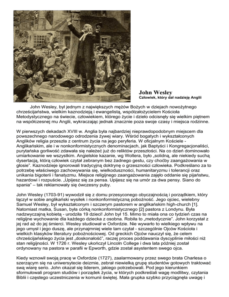 John Wesley Człowiek, który dał nadzieję Anglii John Wesley, był jednym z największych mężów Bożych w dziejach nowożytnego chrześcijaństwa, wielkim kaznodzieją i ewangelistą, współzałożycielem Kościoła Metodystycznego na świecie, człowiekiem, którego życie i dzieło odcisnęły się wielkim piętnem na współczesnej mu Anglii, wykraczając jednak znacznie poza swoje czasy i miejsca rodzinne. W pierwszych dekadach XVIII w. Anglia była najbardziej nieprawdopodobnym miejscem dla powszechnego narodowego odrodzenia żywej wiary. Wśród bogatych i wykształconych Anglików religia przeszła z centrum życia na jego peryferia. W oficjalnym Kościele Anglikańskim, ale i w nonkonformistycznych denominacjach, jak Baptyści i Kongregacjonaliści, purytańska gorliwość zdawała się należeć już do reliktów przeszłości. Na co dzień dominowało umiarkowanie we wszystkim. Angielskie kazanie, wg Woltera, było „solidną, ale niekiedy suchą dysertacją, którą człowiek czytał zebranym bez żadnego gestu, czy choćby zaangażowania w głosie”. Kaznodzieje ignorowali tradycyjną doktrynę o grzeszności człowieka. Podkreślano za to potrzebę właściwego zachowywania się, wielkoduszności, humanitaryzmu i tolerancji oraz unikania bigoterii i fanatyzmu. Miejsce religijnego zaangażowania zajęło oddanie się pijaństwu, hazardowi i rozpuście. „Upijesz się za pensa. Upijesz się na umór za dwa pensy. Siano do spania” – tak reklamowały się ówczesny puby. John Wesley (1703-91) wywodził się z domu przesyconego obyczajnością i porządkiem, który łączył w sobie anglikański wysiłek i nonkonformistyczną pobożność. Jego ojciec, wielebny Samuel Wesley, był wykształconym i szczerym pastorem w anglikańskim high-church [1]. Natomiast matka, Susan, była córką nonkonformistycznego [2] pastora z Londynu. Była nadzwyczajną kobietą - urodziła 19 dzieci! John był 15. Mimo to miała ona co tydzień czas na religijne wychowanie dla każdego dziecka z osobna. Robiła to „metodycznie”. John korzystał z jej rad aż do jej śmierci. Wesley studiował w Oxfordzie. Nie wywarło to wielkiego wpływu na jego umysł i jego duszę, ale przynajmniej wiele tam czytał - szczególnie Ojców Kościoła i wielkich klasyków literatury pobożnościowej. Od greckich Ojców nauczył się, że celem chrześcijańskiego życia jest „doskonałość”, raczej proces poddawania dyscyplinie miłości niż stan religijności. W 1726 r. Wesley ukończył Lincoln College i dwa lata później został ordynowany na pastora w parafii w Epworth, gdzie został asystentem swego ojca. Kiedy wznowił swoją pracę w Oxfordzie (1727), zaalarmowany przez swego brata Charlesa o szerzącym się na uniwersytecie deizmie, zebrał niewielką grupę studentów gotowych traktować swą wiarę serio. John okazał się liderem, jakiego potrzebowali. Pod jego kierunkiem sformułowali program studiów i porządek życia, w których podkreślali wagę modlitwy, czytania Biblii i częstego uczestniczenia w komunii świętej. Mała grupka szybko przyciągnęła uwagę i drwiny swobodnych studentów. „Entuzjazm” religijny w Oxfordzie? Nazywano ich świętym klubem, molami biblijnymi, reformatorskim klubem. Członkowie tego towarzystwa byli żarliwymi, ale niespokojnymi duszami. Byli wytrwali w poszukiwaniu dróg, które uczyniłyby ich życie podobnym do wczesnych chrześcijan. Dawali jałmużny biednym i odwiedzali uwięzionych, ale Wesley szybko odkrył, że brakuje mu wewnętrznego duchowego pokoju prawdziwego chrześcijanina. Wtedy przyszło zaproszenie do Georgii. Jego przyjaciel, dr John Burton, zasugerował, że obaj bracia mogliby służyć Bogu w nowej kolonii, zarządzanej przez gen. Johna Oglethorpe’a. Charles mógłby być jego sekretarzem, a John kapelanem kolonii. John przyjął szansę głoszenia Ewangelii Indianom i w X 1735 bracia pełni młodzieńczego idealizmu i misjonarskiej gorliwości wyruszyli w podróż. Cały epizod w Georgii okazał się wielkim fiaskiem. John odkrył, że zacni Indianie to, jak się okazało, „żarłoki, złodzieje, kłamcy i mordercy“, a jego biali koloniści głęboko obrazili się na jego nieugięte zwyczaje wyniesione z high-church. Sześć miesięcy później wyjechał rozgoryczony z Ameryki. W drodze pisał: „Przyjechałem do Ameryki nawracać Indian, ale kto powinien nawrócić mnie?“ W Anglii był znów 1 II 1738 r. - pokonany i boleśnie niepewny swej wiary i przyszłości. Przez ostatnie 12 lat z trudem wspinał się drogą dążenia do perfekcji, starając się w najlepszy sposób, jaki znał, osiągnąć prawdziwe błogosławieństwo. Misja w Georgii tylko odsłoniła jego duchowe bankructwo. Ale zdobył tam jedno pozytywne doświadczenie - kontakt z Braćmi Morawskimi. Po tym spotkaniu był zdecydowany poznać sekret ich duchowej mocy. W Londynie spotkał Petera Bohlera, młodego Morawskiego kaznodzieję (latem 1738 r. spędził trzy miesiące na odwiedzinach w Herrnhut [3], które wywarły ogromny wpływ na jego dalszą służbę), który zaszczepił mu potrzebę nowego narodzenia i mocnej, osobistej wiary w Jezusa Chrystusa, które mogłyby umożliwić mu przezwyciężenie grzechu i osiągnięcie prawdziwej świętości. Usprawiedliwienie przez wiarę - mówił Bohler - to nie tylko doktryna; to osobiste doświadczenie Bożego przebaczenia. John Wesley doświadczył tego 24 V 1738 r. „Wieczorem - pisał - bardzo niechętnie poszedłem na spotkanie społeczności przy Aldersgate Street, tam ktoś czytał komentarz Lutra do Listu do Rzymian. Około 20:45, kiedy on opisywał zmianę, której Bóg dokonuje w sercu przez wiarę w Chrystusa, poczułem w moim sercu niezwykłe ciepło. Czułem, że uwierzyłem Chrystusowi, samemu Chrystusowi, ku zbawieniu; i otrzymałem poczucie bezpieczeństwa - że On wziął moje grzechy, moje własne i uwolnił mnie od prawa grzechu i śmierci“. Odkrył swoje życiowe przesłanie
