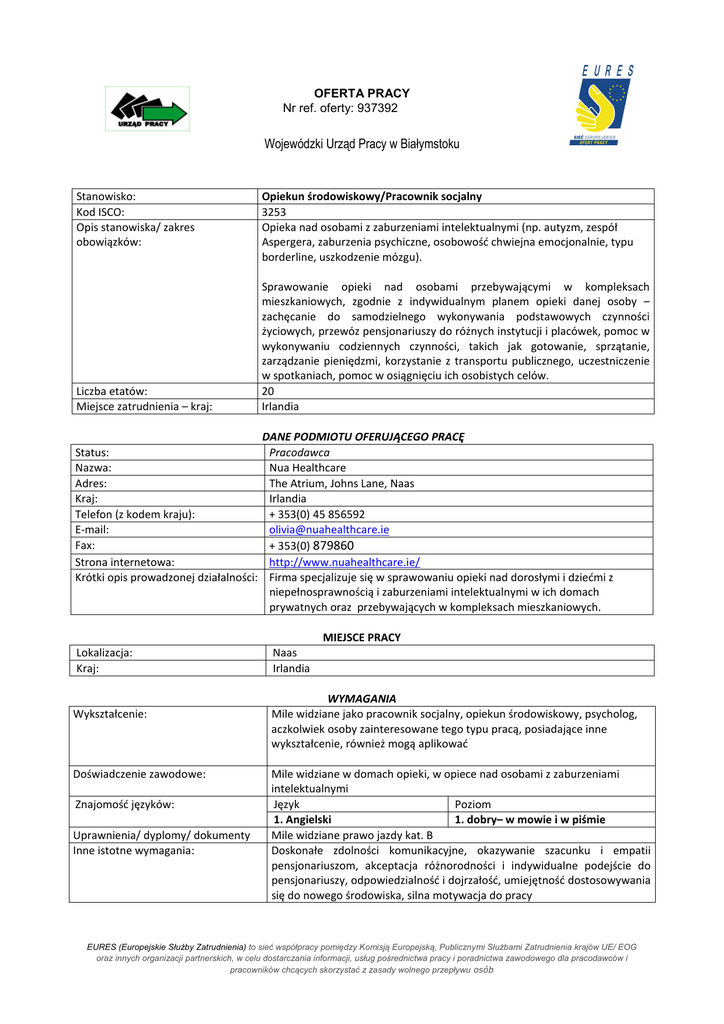 OFERTA PRACY Nr ref. oferty: 937392 Wojewódzki Urząd Pracy w Białymstoku Stanowisko: Kod ISCO: Opis stanowiska/ zakres obowiązków: Liczba etatów: Miejsce zatrudnienia – kraj: Status: Nazwa: Adres: Kraj: Telefon (z kodem kraju): E-mail: Fax: Strona internetowa: Krótki opis prowadzonej działalności: Opiekun środowiskowy/Pracownik socjalny 3253 Opieka nad osobami z zaburzeniami intelektualnymi (np. autyzm, zespół Aspergera, zaburzenia psychiczne, osobowość chwiejna emocjonalnie, typu borderline, uszkodzenie mózgu). Sprawowanie opieki nad osobami przebywającymi w kompleksach mieszkaniowych, zgodnie z indywidualnym planem opieki danej osoby – zachęcanie do samodzielnego wykonywania podstawowych czynności życiowych, przewóz pensjonariuszy do różnych instytucji i placówek, pomoc w wykonywaniu codziennych czynności, takich jak gotowanie, sprzątanie, zarządzanie pieniędzmi, korzystanie z transportu publicznego, uczestniczenie w spotkaniach, pomoc w osiągnięciu ich osobistych celów. 20 Irlandia DANE PODMIOTU OFERUJĄCEGO PRACĘ Pracodawca Nua Healthcare The Atrium, Johns Lane, Naas Irlandia + 353(0) 45 856592 [email protected] + 353(0) 879860 http://www.nuahealthcare.ie/ Firma specjalizuje się w sprawowaniu opieki nad dorosłymi i dziećmi z niepełnosprawnością i zaburzeniami intelektualnymi w ich domach prywatnych oraz przebywających w kompleksach mieszkaniowych. MIEJSCE PRACY Lokalizacja: Kraj: Wykształcenie: Doświadczenie zawodowe: Znajomość języków: Uprawnienia/ dyplomy/ dokumenty Inne istotne wymagania: Naas Irlandia WYMAGANIA Mile widziane jako pracownik socjalny, opiekun środowiskowy, psycholog, aczkolwiek osoby zainteresowane tego typu pracą, posiadające inne wykształcenie, również mogą aplikować Mile widziane w domach opieki, w opiece nad osobami z zaburzeniami intelektualnymi Język Poziom 1. Angielski 1. dobry– w mowie i w piśmie Mile widziane prawo jazdy kat. B Doskonałe zdolności komunikacyjne, okazywanie szacunku i empatii pensjonariuszom, akceptacja różnorodności i indywidualne podejście do pensjonariuszy, odpowiedzialność i dojrzałość, umiejętność dostosowywania się do nowego środowiska, silna motywacja do pracy EURES (Europejskie Służby Zatrudnienia) to sieć współpracy pomiędzy Komisją Europejską, Publicznymi Służbami Zatrudnienia krajów UE/ EOG oraz innych organizacji partnerskich, w celu dostarczania informacji, usług pośrednictwa pracy i poradnictwa zawodowego dla pracodawców i pracowników chcących skorzystać z zasady wolnego przepływu osób WYNAGRODZENIE I WARUNKI ZATRUDNIENIA Wysokość pensji brutto: 10 -12 – uzależnione od kwalifikacji i doświadczenia Wysokość pensji netto: W zależności od klasy podatkowej Waluta, w jakiej wypłacana jest pensja: Euro Rodzaj stawki wynagrodzenia: godzinowa Dodatkowe świadczenia: Pracodawca zapewnia przeszkolenie, pomoc w znalezieniu zakwaterowania, bezpłatne zakwaterowanie przez 1 miesiąc. Nazwa firmy, z którą zostanie podpisana Nua Healthcare umowa: Rodzaj umowy: Umowa o pracę Wymiar czasu pracy Pełen etat zgodnie z harmonogramem dyżurów – do uzgodnienia z pracodawcą. Czas trwania umowy: Na czas nieokreślony Liczba godzin tygodniowo: 40 Data rozpoczęcia pracy: Wymagane dokumenty Od zaraz SPOSÓB SKŁADANIA WNIOSKU CV Język, w którym muszą być sporządzone przedkładane dokumenty: Do kogo należy wysłać dokumenty: angielski Gdzie należy wysłać dokumenty: [email protected] z dopiskiem - opiekun środowiskowy – Irlandia tel. 85 7497 235 Dane kontaktowe do przedstawiciela pracodawcy: Olivia Geraghty tel. 00353( 0)45 856592 Do doradcy EURES [email protected] Data publikacji: Termin przedkładania podań o pracę / zakończenia ważności oferty: WAŻNOŚĆ 03.06.2015 Do odwołania Uprzejmie informujemy, że skontaktujemy się wyłącznie z wybranymi kandydatami. UWAGA: 1. Umowa z zagranicznym pracodawcą zostanie zawarta zgodnie z prawem kraju zatrudnienia. Oznacza to, że wszystkie roszczenia odnośnie do warunków, które obejmuje umowa, można kierować wyłącznie do odpowiedniego sądu w kraju zatrudnienia. Publiczne służby zatrudnienia (EURES) nie mogą pośredniczyć ani reprezentować pracownika w sądzie kraju zatrudnienia w przypadku sporu z pracodawcą. 2. Publiczne służby zatrudnienia (EURES) dokładają wszelkich starań, aby zapewnić rzetelność i wiarygodność ofert pracy zgłoszonych w lokalnym urzędzie pracy. Należy wyjaśnić, że oferta pracy została zgłoszona przez stronę trzecią i EURES nie odpowiada za ewentualne rozbieżności między warunkami pracy określonymi w ofercie pracy i warunkami oferowanymi przez potencjalnego pracodawcę. 3. Publiczne służby zatrudnienia (EURES) informują, że będą zbierać, przetwarzać i przekazywać potencjalnym pracodawcom zgodnie z przepisami dotyczącymi ochrony danych osobowych wszystkie dane osobowe dostarczone przez osoby poszukujące pracy. EURES (Europejskie Służby Zatrudnienia) to sieć współpracy pomiędzy Komisją Europejską, Publicznymi Służbami Zatrudnienia krajów UE/ EOG oraz innych organizacji partnerskich, w celu dostarczania informacji, usług pośrednictwa pracy i poradnictwa zawodowego dla pracodawców i pracowników chcących skorzystać z zasady wolnego przepływu osób