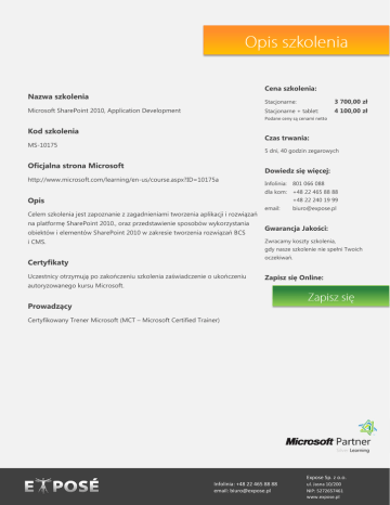 Cena szkolenia: Nazwa szkolenia Microsoft SharePoint 2010, Application Development Stacjonarne: 3 700,00 zł Stacjonarne + tablet: 4 100,00 zł Podane ceny są cenami netto Kod szkolenia Czas trwania: MS-10175 5 dni, 40 godzin zegarowych Oficjalna strona Microsoft Dowiedz się więcej: http://www.microsoft.com/learning/en-us/course.aspx?ID=10175a Infolinia: 801 066 088 dla kom: +48 22 465 88 88 Opis +48 22 240 19 99 Celem szkolenia jest zapoznanie z zagadnieniami tworzenia aplikacji i rozwiązań na platformę SharePoint 2010., oraz przedstawienie sposobów wykorzystania obiektów i elementów SharePoint 2010 w zakresie tworzenia rozwiązań BCS email: [email protected] Gwarancja Jakości: Zwracamy koszty szkolenia, i CMS. gdy nasze szkolenie nie spełni Twoich oczekiwań. Certyfikaty Uczestnicy otrzymują po zakończeniu szkolenia zaświadczenie o ukończeniu autoryzowanego kursu Microsoft. Zapisz się Online: Prowadzący Certyfikowany Trener Microsoft (MCT – Microsoft Certified Trainer) Expose Sp. z o.o. Infolinia: +48 22 465 88 88 email: [email protected] ul. Jasna 10/200 NIP: 5272657461 www.expose.pl 1. 2. 3. 4. 5. 6. 7. 8. 9. 10. 11. 12. 13. Wprowadzenie do platformy programistycznej SharePoint 2010 platforma programistyczna SharePoint 2010 hierarchia obiektów SharePoint 2010 praca z obiekrami SharePoint 2010 Wykorzystanie narzędzi programistycznych SharePoint 2010 rozbudowywanie witryn SharePoint 2010 za pomocą SharePoint Designer 2010 rozwijanie rozwiązań SharePoint 2010 za pomocą Visual Studio 2010 pakowanie i rozbudowywanie rozwiązań SharePoint 2010 Tworzenie Web Parts w SharePoint 2010 tworzenie Standard Web Parts tworzenie Connected Web Parts tworzenie Visual Web Parts Praca z obiektami SharePoint na serwerze praca programowa z witrynami SharePoint praca programowa z listami SharePoint praca programowa z listami danych Tworzenie odbiorniów zdarzeń i ustawienia aplikacji tworzenie odbiorników zdarzeń praca programowa z Web.Config Tworzenie rozwiązań z wykorzystaniem Business Connectivity Services przegląd zagadnień Business Connectivity Services rozwijanie typów zawartości zewnętrznej i list z wykorzystaniem SharePoint Designer rozwijanie rozwiązań Business Connectivity Services za pomocą Visual Studio 2010 Tworzenie przepływów pracy w SharePoint 2010 tworzenie przepływów pracy z SharePoint Designer tworzenie przepływów pracy z Visual Studio 2010 Praca z API opartymi na klientach w SharePoint 2010 przegląd zagadnień dotyczących Client Object Model w SharePoint 2010 praca z Client Object MOdel w aplikacjach .NET Tworzenie interakcyjnych interfejsów użytkownika tworzenie elementów menu i formantów wstążki tworzenie dialogów po stronie klienckiej Rozwijanie aplikacji Silverlight dla SharePoint tworzenie aplikacji Silverlight dla SharePoint 2010 wdrażanie aplikacji Silverlight Rozwijanie rozwiązań trybu "piaskownicy" dla SharePoint 2010 rozwiązania trybu "piaskownicy" i użytkownika ogranicznia dla rozwiązań trybu "piaskownicy" Praca z profilami serwera SharePoint i taksonomią APIs profile użytkowników taksonomie Tworzenie rozwiązań Content Management Solutions tworzenie rozwiązań Enterprise Content Management Solutions Expose Sp. z o.o. Infolinia: +48 22 465 88 88 email: [email protected] ul. Jasna 10/200 NIP: 5272657461 www.expose.pl tworzenie rozwiązań Web Content Management Solutions Expose Sp. z o.o. Infolinia: +48 22 465 88 88 email: [email protected] ul. Jasna 10/200 NIP: 5272657461 www.expose.pl
