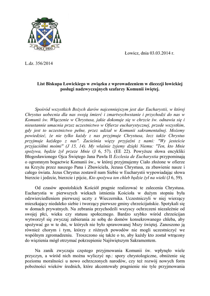 Łowicz, dnia 03.03.2014 r. L.dz. 356/2014 List Biskupa Łowickiego w związku z wprowadzeniem w diecezji łowickiej posługi nadzwyczajnych szafarzy Komunii świętej. Spośród wszystkich Bożych darów najcenniejszym jest dar Eucharystii, w której Chrystus uobecnia dla nas swoją śmierć i zmartwychwstanie i przychodzi do nas w Komunii św. Włączenie w Chrystusa, jakie dokonuje się w chrzcie św. odnawia się i nieustannie umacnia przez uczestnictwo w Ofierze eucharystycznej, przede wszystkim, gdy jest to uczestnictwo pełne, przez udział w Komunii sakramentalnej. Możemy powiedzieć, że nie tylko każdy z nas przyjmuje Chrystusa, lecz także Chrystus przyjmuje każdego z nas". Zacieśnia więzy przyjaźni z nami: "Wy jesteście przyjaciółmi moimi" (J 15, 14). My właśnie żyjemy dzięki Niemu: "Ten, kto Mnie spożywa, będzie żył przeze Mnie (J 6, 57). (EE 22). Powyższe słowa encykliki Błogosławionego Ojca Świętego Jana Pawła II Ecclesia de Eucharystia przypominają o ogromnym bogactwie Komunii św., w której przyjmujemy Ciało złożone w ofierze na Krzyżu przez naszego Pana i Zbawiciela, Jezusa Chrystusa, za zbawienie nasze i całego świata. Jezus Chrystus zostawił nam Siebie w Eucharystii wypowiadając słowa bierzcie i jedzcie, bierzcie i pijcie, Kto spożywa ten chleb będzie żył na wieki (J 6, 59). Od czasów apostolskich Kościół pragnie realizować te zalecenia Chrystusa. Eucharystia w pierwszych wiekach istnienia Kościoła w dużym stopniu była odzwierciedleniem pierwszej uczty z Wieczernika. Uczestniczyli w niej wierzący mieszkający niedaleko siebie i tworzący pierwsze gminy chrześcijańskie. Spotykali się w domach prywatnych. Na zebrania przychodzili wszyscy ochrzczeni niezależnie od swojej płci, wieku czy statusu społecznego. Bardzo szybko wśród chrześcijan wytworzył się zwyczaj zabierania ze sobą do domów konsekrowanego chleba, aby spożywać go w te dni, w których nie było sprawowanej Mszy świętej. Zanoszono ją również chorym i tym, którzy z różnych powodów nie mogli uczestniczyć we wspólnym zgromadzeniu. Troszczono się także o to, aby każdy kto został wtrącony do więzienia mógł otrzymać pokrzepienie Najświętszym Sakramentem. Na zanik zwyczaju częstego przyjmowania Komunii św. wpłynęło wiele przyczyn, a wśród nich można wyliczyć np.: spory chrystologiczne, obniżenie się poziomu moralności u nowo ochrzczonych narodów, czy też rozwój nowych form pobożności wieków średnich, które akcentowały pragnienie nie tyle przyjmowania Komunii Świętej, ile raczej adorowania Hostii. Wskutek czego powszechna w Kościele pierwszych wieków praktyka pomocy w udzielaniu Komunii świętej przez wiernych świeckich zanikła całkowicie w zamian przyjął się zwyczaj podawania Ciała Pańskiego tylko przez kapłana Przywrócenie funkcji świeckiego nadzwyczajnego szafarza Komunii świętej nastąpiło po Soborze Watykańskim II jako jeden z wielu owoców nowego spojrzenia na rzeczywistość Kościoła i liturgii. Należy jednak przypomnieć że, zwyczajnymi konsekrowanymi szafarzami Komunii św. są biskupi, prezbiterzy i diakoni. Jednakże do rozdawania Ciała Pańskiego nie jest konieczne otrzymanie święceń kapłańskich. W uzasadnionych sytuacjach, tam gdzie zachodzi taka potrzeba oraz doradza wielki pożytek duchowy wiernych, Kościół ustanawia akolitów, którzy są nadzwyczajnymi szafarzami Komunii św., a także błogosławi starannie wybranych i odpowiednio przygotowanych wiernych świeckich, upoważniając ich do tego, by mogli podawać innym Chleb życia. Przez lata nadzwyczajni szafarze Komunii św. byli znani przede wszystkim jako etap do przyjęcia święceń kapłańskich. Jednakże od kilkunastu lat można spotkać w kościołach w Polsce coraz częściej nie tylko kleryków — akolitów udzielających Komunii świętej, ale także ludzi świeckich. W naszym kraju funkcja nadzwyczajnego szafarza Komunii świętej została wprowadzona jako jeden z owoców Kongresu Eucharystycznego, postanowieniem Konferencji Episkopatu Polski z dnia 2 V 1990 r. Nadzwyczajny szafarz może spełniać swoją posługę podczas Mszy św. wtedy, gdy do Komunii świętej przystępuje większa liczba wiernych i brak zwyczajnych szafarzy, albo jakieś ważne powody, jak: zły stan zdrowia, podeszły wiek, spełnianie innych czynności duszpasterskich, które uniemożliwiają im udzielanie Najświętszej Eucharystii, a wskutek czego Liturgia Eucharystii nadmiernie by się przedłużyła. Poza ważnymi przypadkami, kapłani nie mogą wyręczać się posługą nadzwyczajnych szafarzy, sami nie komunikując. Szafarz nadzwyczajny może także asystować kapłanowi podczas udzielania Komunii świętej pod obiema postaciami. Za zgodą księdza proboszcza, szafarz nadzwyczajny może zanosić Komunię świętą osobom chorym i w podeszłym wieku. W ogłoszonych postanowieniach zezwolono biskupom powoływać mężczyzn w wieku od 25 do 65 lat jako nadzwyczajnych szafarzy Komunii świętej. Określono wymagania, które powinni spełniać kandydaci do wykonywania tej posługi, ich strój, a także sytuacje, kiedy mogą oni spełniać swoje zadania na zasadzie wolontariatu. Funkcja ta jest czynnością zaszczytną i jednocześnie bardzo odpowiedzialną, dlatego poprzedzona jest odpowiednim przygotowaniem. Drodzy Bracia i Siostry Widząc pozytywne doświadczenia moich braci biskupów w innych diecezjach polskich, a także prośby ze strony księży proboszczów, postanowiłem wprowadzić tę posługę również w naszej diecezji. Zasady formacji Nadzwyczajnych Szafarzy Komunii Świętej i sprawowanie tej funkcji określa zatwierdzony przeze mnie 7 maja 2013r. statut. Kurs przygotowujący trwał od września 2013 do kwietnia br.. Kandydaci uczestniczyli w wykładach oraz ćwiczeniach prowadzonych przez wykładowców WSD w Łowiczu. Przygotowania zakończyły się egzaminem oraz rekolekcjami dla kandydatów. 9 kwietnia br. 
