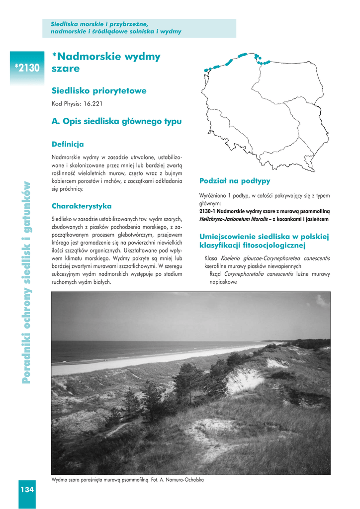 Siedliska morskie i przybrze˝ne, nadmorskie i Êródlàdowe solniska i wydmy *2130 *Nadmorskie wydmy szare Siedlisko priorytetowe Kod Physis: 16.221 A. Opis siedliska g∏ównego typu Poradniki ochrony siedlisk i gatunków Definicja Nadmorskie wydmy w zasadzie utrwalone, ustabilizowane i skolonizowane przez mniej lub bardziej zwartà roÊlinnoÊç wieloletnich muraw, cz´sto wraz z bujnym kobiercem porostów i mchów, z zaczàtkami odk∏adania si´ próchnicy. Charakterystyka Siedlisko w zasadzie ustabilizowanych tzw. wydm szarych, zbudowanych z piasków pochodzenia morskiego, z zapoczàtkowanym procesem glebotwórczym, przejawem którego jest gromadzenie si´ na powierzchni niewielkich iloÊci szczàtków organicznych. Ukszta∏towane pod wp∏ywem klimatu morskiego. Wydmy pokryte sà mniej lub bardziej zwartymi murawami szczotlichowymi. W szeregu sukcesyjnym wydm nadmorskich wyst´puje po stadium ruchomych wydm bia∏ych. Podzia∏ na podtypy Wyró˝niono 1 podtyp, w ca∏oÊci pokrywajàcy si´ z typem g∏ównym: 2130-1 Nadmorskie wydmy szare z murawà psammofilnà Helichryso-Jasionetum litoralis – z kocankami i jasieƒcem Umiejscowienie siedliska w polskiej klasyfikacji fitosocjologicznej Wydma szara poroÊni´ta murawà psammofilnà. Fot. A. Namura-Ochalska 134 Klasa Koelerio glaucae-Corynephoretea canescentis kserofilne murawy piasków niewapiennych Rzàd Corynephoretalia canescentis luêne murawy napiaskowe Piaszczyste *Nadmorskie ∏awicewydmy podmorskie szare Zwiàzek Koelerion glaucae murawy piaskowe siedlisk nadmorskich Zespó∏ Helichryso-Jasionetum litoralis murawa psammofilna z kocankami i jasieƒcem Bibliografia *2130 Poradniki ochrony siedlisk i gatunków BLAB J., RIECKEN U., SSYMANK A. 1995. Proposal on a criteria system for a National Red Data Book of Biotopes. Landscape Ecology 10, 1: 41–50. BEDNORZ J. 1983. Awifauna S∏owiƒskiego Parku Narodowego z uwzgl´dnieniem stosunków iloÊciowych. Pr. Kom. Biol. PTPN, 65, PWN, Warszawa – Poznaƒ. BORÓWKA R. K. 1980. Wspó∏czesne procesy transportu i sedymentacji piasków eolicznych oraz ich uwarunkowania i skutki na obszarze wydm nadmorskich Prace Komis. Geogr.Geolog. PTPN 20: 1–126. CHOJNACKI J. C., JASNOWSKA J. (red.), 1998. Raport o stanie ochrony przyrody w województwie zachodniopomorskim. Com. Graph, Szczecin, s. 67. HELCOM. 1998. Red list of Marine and Coastal Biotopes and Biotope Complexes of the Baltic Sea, Belt and Kattegat. Balt. Sea Environ. Proc. No. 75. HERBICH J., HERBICHOWA M. (red.) 1998. Szata roÊlinna Pomorza. Zró˝nicowanie, dynamika, zagro˝enia, ochrona. Przewodnik sesji terenowych 51. Zjazdu Polskiego Towarzystwa Botanicznego 15–19 IX 1998. Wyd. Un. Gdaƒskiego, Gdaƒsk: 1–302. HERBICH J., WARZOCHA J. 1999. Czerwona lista biotopów morskich i nadmorskich w polskiej strefie Ba∏tyku. Ochr. Przyr. 56: 3–16. IUCN. 1994. IUCN Red list categories. Prepared by the IUCN Species Survival Commission. As approved by the 40 the Meeting of the IUCN Council. Gland, Switzerland. JASNOWSKA J., JASNOWSKI M. 1983. Pojezierze Zachodniopomorskie. Przyroda polska, Wiedza Powszechna, Warszawa. KLIMKO M. 1975. Zró˝nicowanie ekologiczne roÊlin pla˝y i wydm bia∏ych S∏owiƒskiego Parku Narodowego w oparciu o cechy budowy anatomicznej. Bad. Fizjogr. Pol. Zach. 28, Ser. B. Botanika: 145–165. KORNA J. 1972. Zespo∏y wydm nadmorskich i Êródlàdowych. W: Szafer W., Zarzycki K. (red.) Szata roÊlinna Polski, 1: 297–309, PWN, Warszawa. MATUSZKIEWICZ W. 2001. Przewodnik do oznaczania zbiorowisk roÊlinnych Polski. PWN, Warszawa. MARSZ A. 1966. Geneza wydm ∏ebskich w Êwietle wspó∏czesnych procesów brzegowych. Prace Komis. Geogr.-Geol. PTPN 4.6: 1–68. NOWI¡SKI M. 1967. Polskie zbiorowiska trawiaste i turzycowe. Szkic fitosocjologiczny. PWRiL, Warszawa. OSTROWSKI M., SYMONIDES E. 1994. S∏owiƒski Park Narodowy. Sci&Art., Warszawa. PIOTROWSKA H. 1979. Natural resistance against mechanical destruction in plant communities on Baltic coast dunes. Zesz. Nauk. Wydz. BIN0Z UG, Biol., 1: 5–14. PIOTROWSKA H. 1988. The dynamics of the dune vegetation on the Polish Baltic coast. Vegetatio, 77: 169–175. PIOTROWSKA H. 1989. Natural and anthropogenic changes in sand-dunes and their vegetation on the southern Baltic coast. W: Meulen van der F., Jungerius PD., Visser J. H. (red.) Perspectives in coastal dunes management, 33–40, SPB Academic Publishing bv, the Hague. PIOTROWSKA H. 1997. Przyroda S∏owiƒskiego Parku Narodowego. Bogucki Wyd. Nauk., Poznaƒ – Gdaƒsk. PIOTROWSKA H. 2002. Zbiorowiska psammofilne na wydmach polskiego brzegu Ba∏tyku. Acta Botanica Cassubica 3:5–47. PIOTROWSKA H., CELI¡SKI F. 1965. Zespo∏y psammofilne wysp Wolin i po∏udniowo-wschodniego Uznamu. Bad. Fizjogr. Pol. Zach., 16: 123–170. PIOTROWSKA H., KADULSKI S. 1985. Pojezierze Kaszubskie. Przyroda polska, Wiedza Powszechna, Warszawa. PIOTROWSKA H., STASIAK J. 1984a. Zbiorowiska na wydmach Mierzei WiÊlanej i ich antropogeniczne przemiany. Fragm. Flor. Geobot., 28, 2: 161–180. PIOTROWSKA H., STASIAK J. 1984b. Naturalne i antropogeniczne zmiany strefowe flory naczyniowej bezleÊnych wydm nadmorskich Mierzei WiÊlanej. Fragm. Flor. Geobot., 28, 3: 371–396. PIOTROWSKA H., GOS M. 1995. Coastal dune vegetation in Poland: diversity and development. W: van Dijk. (red.) Management and preservation of coastal habitats. Proc. of a multidisciplinary workshop in Jastrz´bia Góra, Wyd. UG, Gdaƒsk: 71–82. RAFALSKI J., URBA¡SKI J. 1973. Wolin. Przyroda polska, Wiedza Powszechna, Warszawa. WARZOCHA J., HERBICH. J. 1997 mskr. Czerwona Ksi´ga biotopów morskich i nadmorskich w polskiej strefy Morza Ba∏tyckiego. Dla MÂZNiL WOJTERSKI T. 1964. Schematy strefowego uk∏adu roÊlinnoÊci nadmorskiej na po∏udniowym wybrze˝u Ba∏tyku. Bad. Fizjogr. Pol. Zach., 14: 87–105. WOJTERSKI T., BEDNORZ J. 1982. Pobrze˝e S∏owiƒskie i Kaszubskie. Przyroda polska, Wiedza Powszechna, Warszawa. Anna Namura-Ochalska 135 Sied