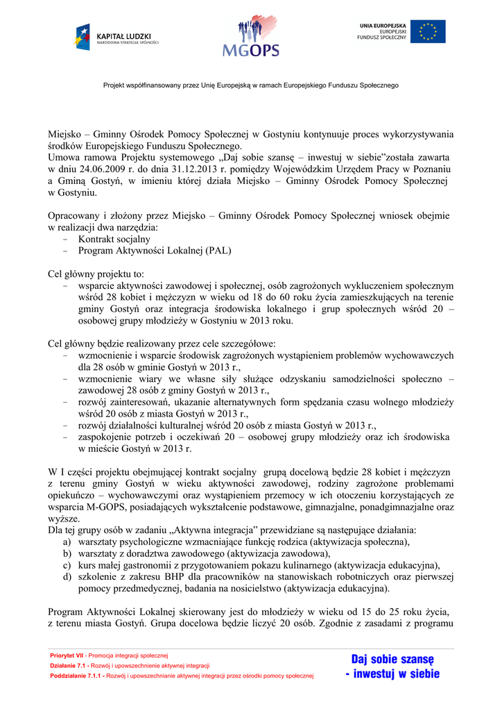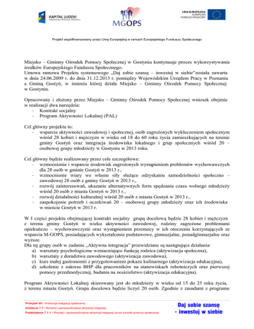 Projekt współfinansowany przez Unię Europejską w ramach Europejskiego Funduszu Społecznego Miejsko – Gminny Ośrodek Pomocy Społecznej w Gostyniu kontynuuje proces wykorzystywania środków Europejskiego Funduszu Społecznego. Umowa ramowa Projektu systemowego „Daj sobie szansę – inwestuj w siebie”została zawarta w dniu 24.06.2009 r. do dnia 31.12.2013 r. pomiędzy Wojewódzkim Urzędem Pracy w Poznaniu a Gminą Gostyń, w imieniu której działa Miejsko – Gminny Ośrodek Pomocy Społecznej w Gostyniu. Opracowany i złożony przez Miejsko – Gminny Ośrodek Pomocy Społecznej wniosek obejmie w realizacji dwa narzędzia: − Kontrakt socjalny − Program Aktywności Lokalnej (PAL) Cel główny projektu to: − wsparcie aktywności zawodowej i społecznej, osób zagrożonych wykluczeniem społecznym wśród 28 kobiet i mężczyzn w wieku od 18 do 60 roku życia zamieszkujących na terenie gminy Gostyń oraz integracja środowiska lokalnego i grup społecznych wśród 20 – osobowej grupy młodzieży w Gostyniu w 2013 roku. Cel główny będzie realizowany przez cele szczegółowe: − wzmocnienie i wsparcie środowisk zagrożonych wystąpieniem problemów wychowawczych dla 28 osób w gminie Gostyń w 2013 r., − wzmocnienie wiary we własne siły służące odzyskaniu samodzielności społeczno – zawodowej 28 osób z gminy Gostyń w 2013 r., − rozwój zainteresowań, ukazanie alternatywnych form spędzania czasu wolnego młodzieży wśród 20 osób z miasta Gostyń w 2013 r., − rozwój działalności kulturalnej wśród 20 osób z miasta Gostyń w 2013 r., − zaspokojenie potrzeb i oczekiwań 20 – osobowej grupy młodzieży oraz ich środowiska w mieście Gostyń w 2013 r. W I części projektu obejmującej kontrakt socjalny grupą docelową będzie 28 kobiet i mężczyzn z terenu gminy Gostyń w wieku aktywności zawodowej, rodziny zagrożone problemami opiekuńczo – wychowawczymi oraz wystąpieniem przemocy w ich otoczeniu korzystających ze wsparcia M-GOPS, posiadających wykształcenie podstawowe, gimnazjalne, ponadgimnazjalne oraz wyższe. Dla tej grupy osób w zadaniu „Aktywna integracja” przewidziane są następujące działania: a) warsztaty psychologiczne wzmacniające funkcję rodzica (aktywizacja społeczna), b) warsztaty z doradztwa zawodowego (aktywizacja zawodowa), c) kurs małej gastronomii z przygotowaniem pokazu kulinarnego (aktywizacja edukacyjna), d) szkolenie z zakresu BHP dla pracowników na stanowiskach robotniczych oraz pierwszej pomocy przedmedycznej, badania na nosicielstwo (aktywizacja edukacyjna). Program Aktywności Lokalnej skierowany jest do młodzieży w wieku od 15 do 25 roku życia, z terenu miasta Gostyń. Grupa docelowa będzie liczyć 20 osób. Zgodnie z zasadami z programu Priorytet VII - Promocja integracji społecznej Działanie 7.1 - Rozwój i upowszechnienie aktywnej integracji Poddziałanie 7.1.1 - Rozwój i upowszechnianie aktywnej integracji przez ośrodki pomocy społecznej Daj sobie szansę - inwestuj w siebie Projekt współfinansowany przez Unię Europejską w ramach Europejskiego Funduszu Społecznego tego może również korzystać najbliższe otoczenie zrekrutowanej młodzieży czyli rodzina, przyjaciele, znajomi, sąsiedzi i mieszańcy gminy Gostyń. W ramach PAL przewidziane są następujące działania: a) warsztaty wokalne – dla uczestników PAL, ich otoczenia b) warsztaty taneczne – dla uczestników PAL, mieszkańców miasta Gostynia, Przewidziano: taniec Afro Brasil, taniec HIP HOP z elementami Dancehall, taniec współczesny, taniec Flamenco. c) warsztaty z zakresu tworzenia gier karcianych o tematyce historycznej i fantasty zwieńczone wydaniem gry opartej na historii i legendach miasta Gostynia, z zakresu: grafiki rysownictwa gier karcianych, mechaniki gier karcianych, legend i historii Gostynia Warsztaty przeznaczone dla uczestników PAL, ich otoczenia (40 – osobowa grupa). d) zaprojektowanie, wyprodukowanie i wydanie płyt gier komputerowych o tematyce historycznej i fantasty przez uczestników z tego zakresu. W cyklu tym proponujemy ćwiczenia i konserwatoria prowadzące do wyboru mechaniki gry, wyboru motywów historycznych i legendarnych , testy gry. Promocja płyty nastąpi podczas koncertu podsumowującego PAL. e) koncert muzyczny dla mieszkańców Gostynia podsumowujący realizację PAL – wezmą w nim udział gostyńskie zespoły młodzieżowe w ramach własnej promocji, grupa uczestników biorących udział w warsztatach wokalnych zaprezentuje nabyte umiejętności, na zakończenie wystąpi zaproszona gwiazda muzyczna. f) uruchomienie Punktu Usług Doradczych w siedzibie MGOPS. Dyżury specjalistów pełnić będą: • prawnik • psycholog • specjalista d/s problemów żywieniowych (prowadzenie terapii dla rodzin z problemami bulimii i anoreksji) • doradca zawodowy Projekt będzie realizowany przez cały rok 2013 rok. Planowana kwota na jego realizację wynosi 382.000,00 zł (w tym wnioskowana kwota dofinansowania wynosi 341.890,00 zł). Opracowały: Skorupska Violetta, Maciejewska Katarzyna stanowisko: koordynatorzy projektu Priorytet VII - Promocja integracji społecznej Działanie 7.1 - Rozwój i upowszechnienie aktywnej integracji Poddziałanie 7.1.1 - Rozwój i upowszechnianie aktywnej integracji przez ośrodki pomocy społecznej Daj sobie szansę - inwestuj w siebie