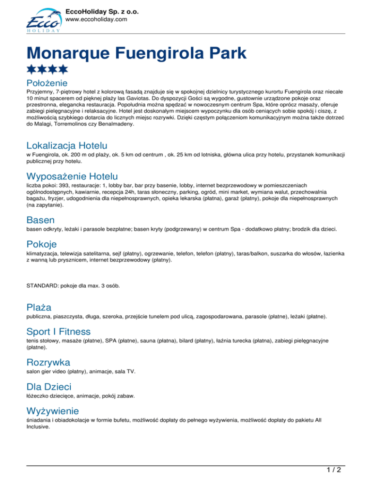 EccoHoliday Sp. z o.o. www.eccoholiday.com Monarque Fuengirola Park Położenie Przyjemny, 7-piętrowy hotel z kolorową fasadą znajduje się w spokojnej dzielnicy turystycznego kurortu Fuengirola oraz niecałe 10 minut spacerem od pięknej plaży las Gaviotas. Do dyspozycji Gości są wygodne, gustownie urządzone pokoje oraz przestronna, elegancka restauracja. Popołudnia można spędzać w nowoczesnym centrum Spa, które oprócz masaży, oferuje zabiegi pielęgnacyjne i relaksacyjne. Hotel jest doskonałym miejscem wypoczynku dla osób ceniących sobie spokój i ciszę, z możliwością szybkiego dotarcia do licznych miejsc rozrywki. Dzięki częstym połączeniom komunikacyjnym można także dotrzeć do Malagi, Torremolinos czy Benalmadeny. Lokalizacja Hotelu w Fuengirola, ok. 200 m od plaży, ok. 5 km od centrum , ok. 25 km od lotniska, główna ulica przy hotelu, przystanek komunikacji publicznej przy hotelu. Wyposażenie Hotelu liczba pokoi: 393, restauracje: 1, lobby bar, bar przy basenie, lobby, internet bezprzewodowy w pomieszczeniach ogólnodostępnych, kawiarnie, recepcja 24h, taras słoneczny, parking, ogród, mini market, wymiana walut, przechowalnia bagażu, fryzjer, udogodnienia dla niepełnosprawnych, opieka lekarska (płatna), garaż (płatny), pokoje dla niepełnosprawnych (na zapytanie). Basen basen odkryty, leżaki i parasole bezpłatne; basen kryty (podgrzewany) w centrum Spa - dodatkowo płatny; brodzik dla dzieci. Pokoje klimatyzacja, telewizja satelitarna, sejf (płatny), ogrzewanie, telefon, telefon (płatny), taras/balkon, suszarka do włosów, łazienka z wanną lub prysznicem, internet bezprzewodowy (płatny). STANDARD: pokoje dla max. 3 osób. Plaża publiczna, piaszczysta, długa, szeroka, przejście tunelem pod ulicą, zagospodarowana, parasole (płatne), leżaki (płatne). Sport I Fitness tenis stołowy, masaże (płatne), SPA (płatne), sauna (płatna), bilard (płatny), łaźnia turecka (płatna), zabiegi pielęgnacyjne (płatne). Rozrywka salon gier video (płatny), animacje, sala TV. Dla Dzieci łóżeczko dziecięce, animacje, pokój zabaw. Wyżywienie śniadania i obiadokolacje w formie bufetu, możliwość dopłaty do pełnego wyżywienia, możliwość dopłaty do pakietu All Inclusive. 1/2 EccoHoliday Sp. z o.o. www.eccoholiday.com Informacje Dodatkowe Niedaleko hotelu park wodny (www.aquamijas.com) oraz Fuengirola Zoo Od 1.11.2016 do 30.04.2017 basen zewnętrzny będzie zamknięty, dla gości dostępny będzie basen kryty Oferta: Wylot 01.01.1970 Powrót 01.01.1970 godz. godz. Zakwaterowanie -() Dni dni Cena os. dorosła 2/2 Powered by TCPDF (www.tcpdf.org)