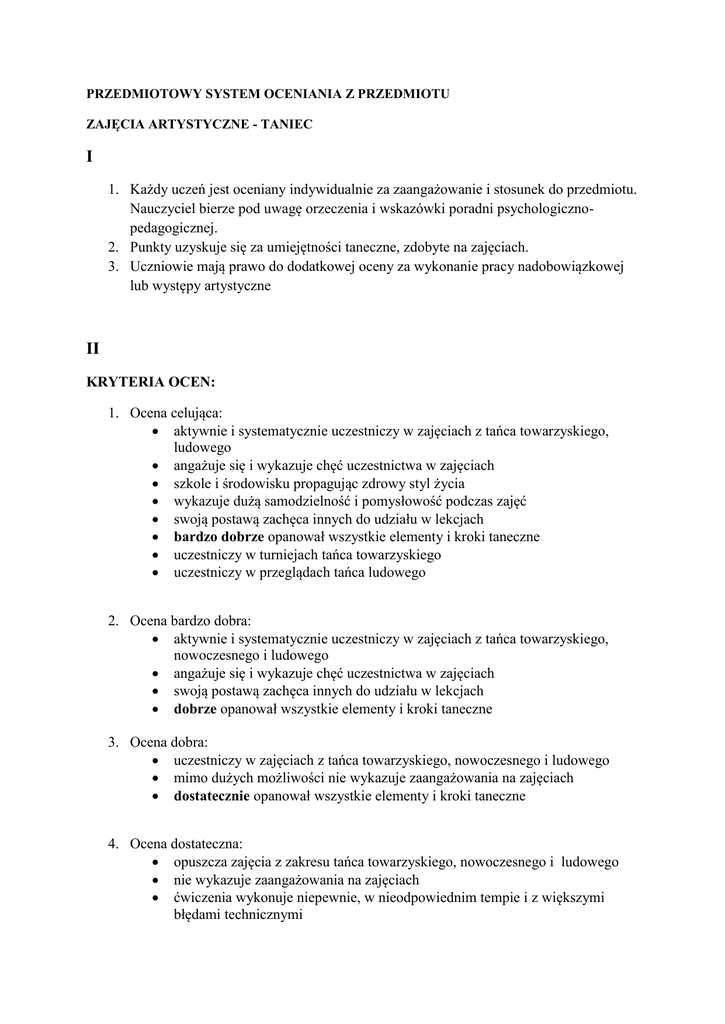PRZEDMIOTOWY SYSTEM OCENIANIA Z PRZEDMIOTU ZAJĘCIA ARTYSTYCZNE - TANIEC I 1. Każdy uczeń jest oceniany indywidualnie za zaangażowanie i stosunek do przedmiotu. Nauczyciel bierze pod uwagę orzeczenia i wskazówki poradni psychologicznopedagogicznej. 2. Punkty uzyskuje się za umiejętności taneczne, zdobyte na zajęciach. 3. Uczniowie mają prawo do dodatkowej oceny za wykonanie pracy nadobowiązkowej lub występy artystyczne II KRYTERIA OCEN: 1. Ocena celująca: aktywnie i systematycznie uczestniczy w zajęciach z tańca towarzyskiego, ludowego angażuje się i wykazuje chęć uczestnictwa w zajęciach szkole i środowisku propagując zdrowy styl życia wykazuje dużą samodzielność i pomysłowość podczas zajęć swoją postawą zachęca innych do udziału w lekcjach bardzo dobrze opanował wszystkie elementy i kroki taneczne uczestniczy w turniejach tańca towarzyskiego uczestniczy w przeglądach tańca ludowego 2. Ocena bardzo dobra: aktywnie i systematycznie uczestniczy w zajęciach z tańca towarzyskiego, nowoczesnego i ludowego angażuje się i wykazuje chęć uczestnictwa w zajęciach swoją postawą zachęca innych do udziału w lekcjach dobrze opanował wszystkie elementy i kroki taneczne 3. Ocena dobra: uczestniczy w zajęciach z tańca towarzyskiego, nowoczesnego i ludowego mimo dużych możliwości nie wykazuje zaangażowania na zajęciach dostatecznie opanował wszystkie elementy i kroki taneczne 4. Ocena dostateczna: opuszcza zajęcia z zakresu tańca towarzyskiego, nowoczesnego i ludowego nie wykazuje zaangażowania na zajęciach ćwiczenia wykonuje niepewnie, w nieodpowiednim tempie i z większymi błędami technicznymi wykazuje małe postępy przejawia pewne braki w postawie i stosunku do zajęć przeciętnie opanował wszystkie elementy i kroki taneczne 5. Ocena dopuszczająca: opuszcza zajęcia z zakresu tańca towarzyskiego, nowoczesnego i ludowego nie wykazuje zaangażowania na zajęciach wykazuje małe postępy ma niechętny stosunek do ćwiczeń uczeń nie opanował materiału w stopniu dostatecznym i ma poważne braki z zakresu tańca 6. Ocena niedostateczna: nie uczestniczy w zajęciach z zakresu tańca uczeń jest daleki od spełnienia wymagań stawianych przez program ma lekceważący stosunek do zajęć i nie wykazuje żadnych postępów w usprawnianiu charakteryzuje się praktycznie niewiedzą w zakresie tańca Ocena końcoworoczna to ilości punktów zdobytych przez ucznia z zajęć edukacyjnych za okres od pierwszego dnia nauki do ostatniego dnia przed konferencją klasyfikacyjną. Oceny końcoworoczne z obowiązkowych i dodatkowych zajęć edukacyjnych ustala się w sposób następujący: a) sumuje się punkty zdobyte przez ucznia w I i w II półroczu (łącznie z punktami za aktywność) (SPZ); b) sumuje się punkty możliwe do zdobycia przez ucznia w I i II półroczu (SPM); c) oblicza się wskaźnik procentowy wg wzoru; P= SPZ/SPM ∗ 100 % d) ustala się oceny według SZKOLNEJ SKALI PROCENTOWEJ; SZKOLNA SKALA PROCENTOWA P = od 87% bardzo dobry P = 70% - 86,9% dobry P = 50% - 69,9% dostateczny P = 30% - 49,9% dopuszczający P = 0% - 29,9% niedostateczny III INFORMACJA ZWROTNA Nauczyciel – uczeń: nauczyciel przekazuje uczniowi komentarz do każdej wystawionej oceny nauczyciel motywuje uczniów do dalszej pracy oceny wpisane są do dziennika klasowego Nauczyciel – rodzice: Podczas wywiadówek, indywidualnych konsultacji, rozmów interwencyjnych. Nauczyciel – wychowawca klasy – pedagog szkolny: nauczyciel wpisuje oceny do dziennika klasowego nauczyciel informuje wychowawcę klasy o aktualnych osiągnięciach i zachowania ucznia nauczyciel informuje pedagoga o sytuacjach wymagających jego interwencji Nauczyciele zajęć artystycznych – taniec: mgr Jakub Jurek mgr Mariusz Sosiński