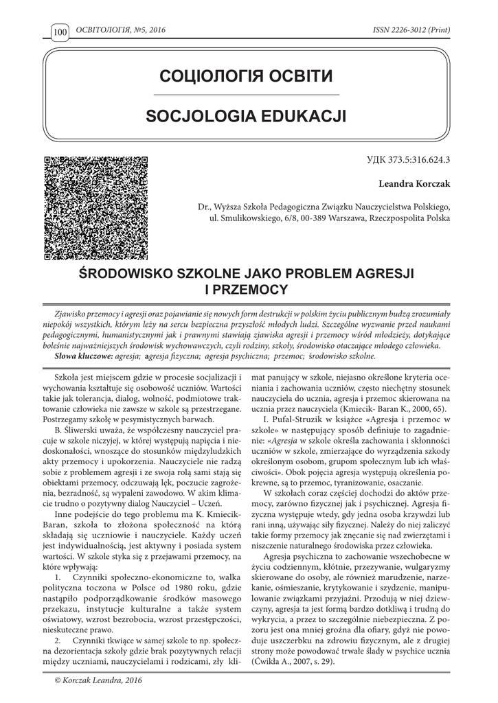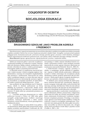 100 ОСВІТОЛОГІЯ, №5, 2016 ISSN 2226-3012 (Print) СОЦІОЛОГІЯ ОСВІТИ SOCJOLOGIA EDUKACJI УДК 373.5:316.624.3 Leandra Korczak Dr., Wyższa Szkoła Pedagogiczna Związku Nauczycielstwa Polskiego, ul. Smulikowskiego, 6/8, 00-389 Warszawa, Rzeczpospolita Polska ŚRODOWISKO SZKOLNE JAKO PROBLEM AGRESJI I PRZEMOCY Zjawisko przemocy i agresji oraz pojawianie się nowych form destrukcji w polskim życiu publicznym budzą zrozumiały niepokój wszystkich, którym leży na sercu bezpieczna przyszłość młodych ludzi. Szczególne wyzwanie przed naukami pedagogicznymi, humanistycznymi jak i prawnymi stawiają zjawiska agresji i przemocy wśród młodzieży, dotykające boleśnie najważniejszych środowisk wychowawczych, czyli rodziny, szkoły, środowisko otaczające młodego człowieka. Słowa kluczowe: agresja; аgresja fizyczna; аgresja psychiczna; przemoc; środowisko szkolne. Szkoła jest miejscem gdzie w procesie socjalizacji i wychowania kształtuje się osobowość uczniów. Wartości takie jak tolerancja, dialog, wolność, podmiotowe traktowanie człowieka nie zawsze w szkole są przestrzegane. Postrzegamy szkołę w pesymistycznych barwach. B. Śliwerski uważa, że współczesny nauczyciel pracuje w szkole niczyjej, w której występują napięcia i niedoskonałości, wnoszące do stosunków międzyludzkich akty przemocy i upokorzenia. Nauczyciele nie radzą sobie z problemem agresji i ze swoja rolą sami stają się obiektami przemocy, odczuwają lęk, poczucie zagrożenia, bezradność, są wypaleni zawodowo. W akim klimacie trudno o pozytywny dialog Nauczyciel – Uczeń. Inne podejście do tego problemu ma K. KmiecikBaran, szkoła to złożona społeczność na którą składają się uczniowie i nauczyciele. Każdy uczeń jest indywidualnością, jest aktywny i posiada system wartości. W szkole styka się z przejawami przemocy, na które wpływają: 1. Czynniki społeczno-ekonomiczne to, walka polityczna toczona w Polsce od 1980 roku, gdzie nastąpiło podporządkowanie środków masowego przekazu, instytucje kulturalne a także system oświatowy, wzrost bezrobocia, wzrost przestępczości, nieskuteczne prawo. 2. Czynniki tkwiące w samej szkole to np. społeczna dezorientacja szkoły gdzie brak pozytywnych relacji między uczniami, nauczycielami i rodzicami, zły kli© Korczak Leandra, 2016 mat panujący w szkole, niejasno określone kryteria oceniania i zachowania uczniów, często niechętny stosunek nauczyciela do ucznia, agresja i przemoc skierowana na ucznia przez nauczyciela (Kmiecik- Baran K., 2000, 65). I. Pufal-Struzik w książce «Agresja i przemoc w szkole» w następujący sposób definiuje to zagadnienie: «Agresja w szkole określa zachowania i skłonności uczniów w szkole, zmierzające do wyrządzenia szkody określonym osobom, grupom społecznym lub ich właściwości». Obok pojęcia agresja występują określenia pokrewne, są to przemoc, tyranizowanie, osaczanie. W szkołach coraz częściej dochodzi do aktów przemocy, zarówno fizycznej jak i psychicznej. Agresja fizyczna występuje wtedy, gdy jedna osoba krzywdzi lub rani inną, używając siły fizycznej. Należy do niej zaliczyć takie formy przemocy jak znęcanie się nad zwierzętami i niszczenie naturalnego środowiska przez człowieka. Agresja psychiczna to zachowanie wszechobecne w życiu codziennym, kłótnie, przezywanie, wulgaryzmy skierowane do osoby, ale również marudzenie, narzekanie, ośmieszanie, krytykowanie i szydzenie, manipulowanie związkami przyjaźni. Przodują w niej dziewczyny, agresja ta jest formą bardzo dotkliwą i trudną do wykrycia, a przez to szczególnie niebezpieczna. Z pozoru jest ona mniej groźna dla ofiary, gdyż nie powoduje uszczerbku na zdrowiu fizycznym, ale z drugiej strony może powodować trwałe ślady w psychice ucznia (Ćwikła A., 2007, s. 29). ISSN 2412-124X (Online) W przemocy psychicznej przeważa agresja słowna ze strony nauczycieli wobec uczniów: moralizowanie, szantażowanie, poniżające komentarze wobec ucznia, chłód emocjonalny, brak wsparcia, konformizujące naciski, brak poszanowania prywatności i godności ucznia. Uczniowie wobec kolegów przejawiają następujące zachowania: znęcanie się, ograniczenie swobody, popychanie, stłuczenia z kolei nauczyciele uczniów biją książką po głowie, uderzają głową o ścianę, ciągną za uszy i włosy. Agresja w szkole wynika z wadliwego funkcjonowania tych placówek. W szkołach jest dużo uczniów, panuje hałas, brak współpracy pomiędzy szkołą a rodzicami. Również brak kontroli ze strony nauczycieli, niesprawiedliwe ocenianie, stwarzanie sytuacji stresowych związanych ze sprawdzaniem wiedzy, a wręcz wyśmiewania staje się przyczyną agresywnych zachowań. To właśnie od przygotowania pedagogicznego wymaga się nie tylko przekazywania wiedzy, ale wyrabiania pozytywnych cech osobowych i umiejętności interpersonalnych. Często mało urozmaicone i przeciążone programy edukacyjne, brak zajęć pozalekcyjnych, powszechna «nuda» w szkole sprzyjają agresji uczniów. Jako dowód tego zjawiska dołączam w załącznikach artykuł z Gazety Wyborczej zamieszczony na stronie intemetowej www. gazeta.pl, w dniu 17 paździemika 2008 r. a noszący tytuł «Nudne lekcje wyzwalają agresję». Z badań wynika, że zachowania agresywne to często wołanie o pomoc i zainteresowanie np. ze strony rodziców. Kiedy młody człowiek nie radzi sobie z własnymi problemami, czuje się zagrożony i ma bardzo niskie poczucie własnej wartości agresja jest wybuchem emocji, a emocji nie można stłumić, trzeba tylko znaleźć bezpieczne dla nich ujście. Agresja jest formą zachowania jednostki realizowaną w określonym kontekście społecznym. Osoba lub grupa osób przejawiają agresję to podmiot, czyli agresor. Agresorzy to osoby zwykle silne fizycznie, przejawiające wrodzoną skłonność do agresji najpierw wobec kolegów, później rodziców i nauczycieli. 