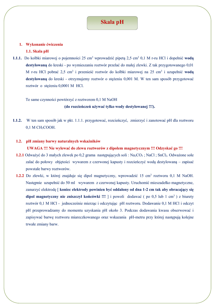 Skala pH 1. Wykonanie ćwiczenia 1.1. Skala pH 1.1.1. Do kolbki miarowej o pojemności 25 cm3 wprowadzić pipetą 2,5 cm3 0,1 M r-ru HCl i dopełnić wodą destylowaną do kreski - po wymieszaniu roztwór przelać do małej zlewki. Z tak przygotowanego 0,01 M r-ru HCl pobrać 2,5 cm3 i przenieść roztwór do kolbki miarowej na 25 cm3 i uzupełnić wodą destylowaną do kreski - otrzymujemy roztwór o stężeniu 0,001 M. W ten sam sposób przygotować roztwór o stężeniu 0,0001 M HCl. Te same czynności powtórzyć z roztworem 0,1 M NaOH (do rozcieńczeń używać tylko wody destylowanej !!!). 1.1.2. W ten sam sposób jak w pkt. 1.1.1. przygotować, rozcieńczyć, zmierzyć i zanotować pH dla roztworu 0,1 M CH3COOH. 1.2. pH zmiany barwy naturalnych wskaźników UWAGA !!! Nie wylewać do zlewu roztworów z dipolem magnetycznym !!! Odzyskać go !!! 1.2.1 Odważyć do 3 małych zlewek po 0,2 grama następujących soli : Na2CO3 ; NaCl ; SnCl2. Odważone sole zalać do połowy objętości wywarem z czerwonej kapusty i rozcieńczyć wodą destylowaną – zapisać powstałe barwy roztworów. 1.2.2 Do zlewki, w której znajduje się dipol magnetyczny, wprowadzić 15 cm3 roztworu 0,1 M NaOH. Następnie uzupełnić do 50 ml wywarem z czerwonej kapusty. Uruchomić mieszadełko magnetyczne, zanurzyć elektrodę [ koniec elektrody powinien być oddalony od dna 1-2 cm tak aby obracający się dipol magnetyczny nie zniszczył końcówki !!! ] i powoli dodawać ( po 0,5 lub 1 cm3 ) z biurety roztwór 0,1 M HCl - jednocześnie mierząc i odczytując pH roztworu. Dodawanie 0,1 M HCl i odczyt pH przeprowadzamy do momentu uzyskania pH około 3. Podczas dodawania kwasu obserwować i zapisywać barwę roztworu miareczkowanego oraz wskazania pH-metru przy której następują kolejne trwałe zmiany barw. 2. Opracowanie wyników Stężenie molowe kwasu HCl : 0,1 0,01 0,001 0,0001 0,1 0,01 0,001 0,0001 0,1 0,01 0,001 0,0001 pH Stężenie molowe zasady NaOH : pH Stężenie molowe kwasu: CH3COOH pH uzasadnić, że mieszanina kwasów o różnej mocy zachowuje się podobnie jak kwas wieloprotonowy. przedstawić wyniki z ćwiczenia 1.1. w postaci wykresu pokazującego zależność pH jako funkcję ujemnego logarytmu ze stężenia kwasu (zasady). przedstawić w tabeli zakresy pH oraz odpowiadające im zmiany barw podczas miareczkowania wyciągu z czerwonej kapusty. określić odczyn roztworów soli z pkt. 1.2.1 znając barwy miaroczkowanego roztworu z pkt. 1.2.2 podać i krótko omówić kilka innych naturalnych wskaźników 3. Wnioski 4. Zakres materiału Pojęcie kwasu i zasady. Teorie kwasów i zasad. Rola rozpuszczalnika. Iloczyn jonowy wody. Pojęcie pH. Wartości pH roztworów kwasów i zasad. Wskaźniki pH. Reakcje kwasów i zasad. Kwasy i zasady wieloprotonowe. 5. Literatura J. Minczewski, Z, Marczenko, Chemia analityczna t.I. PWN W-wa 1971 str.41-69 Hulanicki, Reakcje kwasów i zasad w chemii analitycznej PWN W-wa 1972 str. 28-75 oraz 123-173 G. Charlot, Chemia nieorganiczna PWN W-wa 1976 str. 130-202