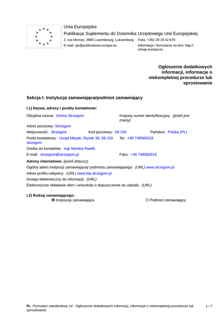 Unia Europejska Publikacja Suplementu do Dziennika Urzędowego Unii Europejskiej 2, rue Mercier, 2985 Luxembourg, Luksemburg Faks: +352 29 29 42 670 E-mail: [email protected] Informacje i formularze on-line: http:// simap.europa.eu Ogłoszenie dodatkowych informacji, informacje o niekompletnej procedurze lub sprostowanie Sekcja I: Instytucja zamawiająca/podmiot zamawiający I.1) Nazwa, adresy i punkty kontaktowe: Krajowy numer identyfikacyjny: (jeżeli jest znany) _____ Oficjalna nazwa: Gmina Strzegom Adres pocztowy: Strzegom Miejscowość: Strzegom Kod pocztowy: 58-150 Punkt kontaktowy: Urząd Miejski, Rynek 38, 58-150 strzegom Państwo: Polska (PL) Tel.: +48 748560533 Osoba do kontaktów: mgr Monika Pawlik E-mail: [email protected] Faks: +48 748560516 Adresy internetowe: (jeżeli dotyczy) Ogólny adres instytucji zamawiającej/ podmiotu zamawiającego: (URL) www.strzegom.pl Adres profilu nabywcy: (URL) www.bip.strzegom.pl Dostęp elektroniczny do informacji: (URL) _____ Elektroniczne składanie ofert i wniosków o dopuszczenie do udziału: (URL) _____ I.2) Rodzaj zamawiającego: Instytucja zamawiająca Podmiot zamawiający PL Formularz standardowy 14 - Ogłoszenie dodatkowych informacji, informacje o niekompletnej procedurze lub sprostowanie 1/7 Sekcja II: Przedmiot zamówienia II.1.1) Nazwa nadana zamówieniu: Odbiór i zagospodarowywanie odpadów komunalnych od właścicieli nieruchomości z terenu gminy Strzegom, na których zamieszkują mieszkańcy oraz utworzenie, utrzymanie i obsługa Punktu Selektywnej zbiórki Odpadów Komunalnych na terenie miasta Strzegom. II.1.2) Krótki opis zamówienia lub zakupu: (podano w pierwotnym ogłoszeniu) Przedmiot zamówienia: 1. Odbiór i zagospodarowywanie odpadów komunalnych od właścicieli nieruchomości zamieszkałych oraz niezamieszkałych z terenu gminy Strzegom. 2. Utworzenie, utrzymanie i obsługa Punktu Selektywnego Zbierania Odpadów Komunalnych (PSZOK) na terenie miasta Strzegom. Usługa odbierania i zagospodarowania odpadów komunalnych obejmuje wszystkie nieruchomości zamieszkałe położone w gminie Strzegom, czyli takie, w których znajduje się co najmniej jeden lokal w którym zamieszkuje co najmniej jeden mieszkaniec. II.1.3) Wspólny Słownik Zamówień (CPV) Główny przedmiot Dodatkowe przedmioty Słownik główny 90500000 90511200 90511100 90512000 90513100 90511400 90533000 Słownik uzupełniający (jeżeli dotyczy) PL Formularz standardowy 14 - Ogłoszenie dodatkowych informacji, informacje o niekompletnej procedurze lub sprostowanie 2/7 Sekcja IV: Procedura IV.1)Rodzaj procedury (podano w pierwotnym ogłoszeniu) Otwarta Ograniczona Ograniczona przyspieszona Negocjacyjna Negocjacyjna przyspieszona Dialog konkurencyjny Negocjacyjna z uprzednim ogłoszeniem Negocjacyjna bez uprzedniego ogłoszenia Negocjacyjna z publikacją ogłoszenia o zamówieniu Negocjacyjna bez publikacji ogłoszenia o zamówieniu Udzielenie zamówienia bez uprzedniej publikacji ogłoszenia o zamówieniu w Dzienniku Urzędowym Unii Europejskiej IV.2)Informacje administracyjne IV.2.1)Numer referencyjny: (podano w pierwotnym ogłoszeniu) _____ IV.2.2)Dane referencyjne ogłoszenia w przypadku ogłoszeń przesłanych drogą elektroniczną: Pierwotne ogłoszenie przesłane przez eNotices TED eSender Login: ENOTICES_elet Dane referencyjne ogłoszenia: 2015-120118 rok i numer dokumentu IV.2.3)Ogłoszenie, którego dotyczy niniejsza publikacja: Numer ogłoszenia w Dz.U.: 2015/S 177-321520 z dnia: 12/09/2015 (dd/mm/rrrr) IV.2.4)Data wysłania pierwotnego ogłoszenia: 08/09/2015 (dd/mm/rrrr) PL Formularz standardowy 14 - Ogłoszenie dodatkowych informacji, informacje o niekompletnej procedurze lub sprostowanie 3/7 Sekcja VI: Informacje uzupełniające VI.1) Ogłoszenie dotyczy: Procedury niepełnej Sprostowania Informacji dodatkowych VI.2) Informacje na temat niepełnej procedury udzielenia zamówienia: Postępowanie o udzielenie zamówienia zostało przerwane Postępowanie o udzielenie zamówienia uznano za nieskuteczne Zamówienia nie udzielono Zamówienie może być przedmiotem ponownej publikacji VI.3) Informacje do poprawienia lub dodania : VI.3.1) Zmiana oryginalnej informacji podanej przez instytucję zamawiającą Publikacja w witrynie TED niezgodna z oryginalną informacją, przekazaną przez instytucję zamawiającą Oba przypadki VI.3.2) W ogłoszeniu pierwotnym W odpowiedniej dokumentacji przetargowej (więcej informacji w odpowiedniej dokumentacji przetargowej) W obu przypadkach (więcej informacji w odpowiedniej dokumentacji przetargowej) VI.3.3) Tekst, który należy poprawić w pierwotnym ogłoszeniu Miejsce, w którym znajduje się Zamiast: Powinno być: zmieniany tekst: Odbiór i zagospodarowywanie Odbiór i zagospodarowywanie sekcja II: Przedmiot zamówienia odpadów komunalnych od właścicieli odpadów komunalnych od właścicieli II.1.1) Nazwa nadana zamówieniu nieruchomości z terenu gminy nieruchomości zamieszkałych przez instytucję zamawiajaca: Strzegom, na których zamieszkują i niezamieszkałych z terenu mieszkańcy oraz utworzenie, gminy Strzegom oraz utworzenie, utrzymanie i obsługa Punktu utrzymanie i obsługa Punktu Selektywnej zbiórki Odpadów Selektywnej zbiórki Odpadów Komunalnych na terenie miasta Komunalnych na terenie miasta Strzegom. Strzegom. Miejsce, w którym znajduje się Zamiast: Powinno być: zmieniany tekst: 1. Odbiór i zagospodarowywanie Odbiór i zagospodarowywanie sekcja II: Przedmiot zamówienia odpadów komunalnych od właścicieli odpadów komunalnych od właścicieli II.2.1) Całkowita wielkość lub zakres: nieruchomości zamieszkałych oraz nieruchomości zamieszkałych niezamieszkałych z terenu gminy oraz niezamieszkałych z terenu Strzegom. gminy Strzegom oraz utworzenie, 2 utrzymanie Usługa odbierania i i obsługa Punktu Selektywnego zagospodarowania odpadów Zbierania Odpadów Komunalnych na komunalnych obejmuje wszystkie terenie miasta Strzegom. nieruchomości zamieszkałe Usługa odbiera