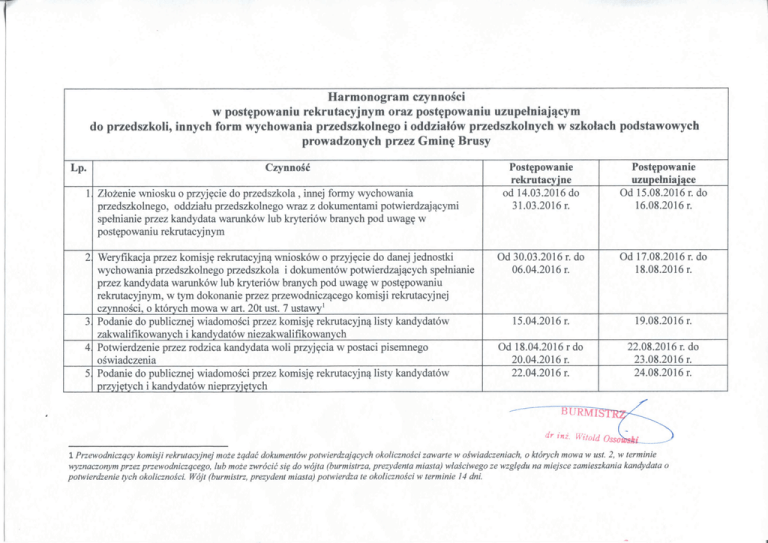 Harmonogram czynności w postępowaniu rekrutacyjnym oraz postępowaniu uzupełniającym do przedszkoli, innych form wychowania przedszkolnego i oddziałów przedszkolnych w szkołach podstawowych prowadzonych przez Gminę Brusy Lp. Czynność 1 Złożenie wniosku o przyjęcie do przedszkola, innej formy wychowania przedszkolnego, oddziału przedszkolnego wraz z dokumentami potwierdzającymi spełnianie przez kandydata warunków lub kryteriów branych pod uwagę w postępowaniu rekrutacyjnym 2 Weryfikacja przez komisję rekrutacyjną wniosków o przyjęcie do danej jednostki wychowania przedszkolnego przedszkola i dokumentów potwierdzających spełnianie przez kandydata warunków lub kryteriów branych pod uwagę w postępowaniu rekrutacyjnym, w tym dokonanie przez przewodniczącego komisji rekrutacyjnej czynności, o których mowa w art. 20t ust. 7 ustawy' 3 Podanie do publicznej wiadomości przez komisję rekrutacyjną listy kandydatów zakwalifikowanych i kandydatów niezakwalifikowanych 4 Potwierdzenie przez rodzica kandydata woli przyjęcia w postaci pisemnego oświadczenia 5 Podanie do publicznej wiadomości przez komisję rekrutacyjną listy kandydatów przyjętych i kandydatów nieprzyjętych Postępowanie rekrutacyjne od 14.03.2016 do 31.03.2016 r. Postępowanie uzupełniające Od 15.08.2016 r. do 16.08.2016 r. Od 30.03.2016 r. do 06.04.2016 r. Od 17.08.2016 r. do 18.08.2016 r. 15.04.2016 r. 19.08.2016 r. Od 18.04.2016 r do 20.04.2016 r. 22.04.2016 r. 22.08.2016 r. do 23.08.2016 r. 24.08.2016 r. d r i n ż "'Hołd Osso\skU_^ 1 Przewodniczący komisji rekrutacyjnej może żądać dokumentów potwierdzających okoliczności zawarte w oświadczeniach, o których mowa w ust. 2, w terminie wyznaczonym przez przewodniczącego, lub może zwrócić się do wójta (burmistrza, prezydenta miasta) właściwego ze względu na miejsce zamieszkania kandydata o potwierdzenie tych okoliczności. Wójt (burmistrz, prezydent miasta) potwierdza te okoliczności w terminie 14 dni.