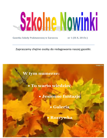 Gazetka Szkoły Podstawowej w Zarzeczu nr 1 (IX-X, 2015r.) Zapraszamy chętne osoby do redagowania naszej gazetki. W tym numerze: To warto wiedzieć Jesienne fantazje Galeria Rozrywka 1 Dlaczego warto korzystać ze słowników? Słowniki należą do grupy książek, których nie czytamy w całości, ale sięgamy do nich w jakimś określonym celu, szukając konkretnej informacji. Korzystając z nich, poszerzamy swoją wiedzę, wzbogacamy słownictwo, a także przyswajamy zasady ortograficzne. Warto sięgnąć do słownika, zwłaszcza wówczas, gdy nie jesteśmy pewni, jak dany wyraz poprawnie zapisać lub co on oznacza. Istnieje wiele słowników, a każdy z nich pełni określoną funkcję. Oto kilka przykładów: Podaje grupy wyrazów bliskoznacznych – słownik wyrazów bliskoznacznych np.: WADA – defekt, mankament, niedociągnięcia, słabość, niedoskonałość, ujemna strona, negatyw, minus, niekorzyść 2 OPOWIADAĆ – przedstawiać, relacjonować, zdawać sprawę, mówić, prawić, pleść, rozprawiać, wypowiadać się, bajać Wyjaśnia znaczenie każdego polskiego słowa: słownik języka polskiego np.: SPOLEGLIWY – taki, na którym można polegać, na którego można liczyć, godny zaufania. Wyjaśnia znaczenie polskich wyrazów zapożyczanych z języka obcego: słownik wyrazów obcych np.: EFEKTOWNY – zwracający na siebie uwagę oryginalnością, pięknem. EFEKTYWNY – wywołujący skutek, skuteczny. Rejestruje i wyjaśnia najpopularniejsze związki wyrazowe: słownik frazeologiczny np.: GONIĆ W PIĘTKĘ – tracić sprawność umysłową, postępować w sposób przeczący rozsądkowi. WYJŚĆ NA CZYMŚ JAK ZABŁOCKI NA MYDLE – wyjść na czymś niekorzystnie, stracić na czymś, zrobić zły interes. Informuje o poprawnym zapisie wyrazów: słownik ortograficzny np.: POMARAŃCZA (nie : pomarańcz) BOHATERZY czy BOHATEROWIE? (obie formy są poprawne) KANISTER (nie: karnister) GŻEGŻÓŁKA. Oprac. KOŁO HUMANISTYCZNE 3 KALENDARZOWE PORY ROKU — JESIEŃ Zapamiętaj! Zmiany pór roku są następstwem ruchu obiegowego Ziemi wokół słońca. 23 września — Początek kalendarzowej jesieni. Tego dnia promienie słoneczne padają na równik - i im dalej na północ i południe od równika, tym mniej energii słonecznej dociera do Ziemi. Dla mieszkańców Polski tego dnia rozpoczyna się kalendarzowa jesień ale np. dla Australijczyków 23 września jest pierwszym dniem wiosny! U nas od tego momentu temperatura ciągle spada. Wrzesień i początek października jest często czasem słonecznym, mówimy wtedy o złotej polskiej jesieni. Później robi się coraz chłodniej pojawiają się częste deszcze i porywiste wiatry. Zwierzęta szykują się do zimy - robią zapasy pożywienia, a niektóre z nich (np. niedźwiedzie, świstak i susły) zapadają w sen zimowy. Źródło: „Victor Junior” 12/03 Oprac. Maja Kopińska 4 ,,A to kapelusz” Hanna Ożogowska - Miły muchomorku, powiedzieć mi musisz, gdzie kupiłeś taki śliczny kapelusik? - Moja wiewióreczko, chętnie ci odpowiem: ja go nie kupiłem, wyrósł mi na głowie. ,,Bukieciki” Lucyna Krzemieniecka Posypały się listeczki dookoła, To już jesień te listeczki z wiatrem woła: - Opadnijcie moje złote i czerwone, jestem jesień przyszłam tutaj, w waszą stronę. Lecą listki, lecą z klonu i kasztana. Będą z listków bukieciki złote dla nas. 5 ,,Co zrobię z kasztanami?” Hanna Zdzitowiecka Z tych trzech będą grzybki. Ładnie je wygładzę, w kępkę mchu zieloną, jak w lesie posadzę. Nad czwartym kasztankiem potrudzę się chwilę i zrobię dla mamy koszyczek do szpilek. Piątemu dam rączki i nóżki z patyka. Będę miał zgrabnego kasztanka-ludzika. ,,Jesienią” J. Babicz Co robią drzewa jesienią? Złocą się i mienią. Czerwienią i migocą I na wietrze stoją. Co robią pola jesienią? Ziarno kryją ziemią. W czarnej skibie ziarno złote będzie rosło zbożem. Co robią ptaki jesienią? Słońce latem gonią. Przepływają błękit nieba, a powrócą ... wiosną. Oprac. Ula Paczka 6 Jesienne zabawy kulinarne Będziesz potrzebować: - jabłko - dwie śliwki - dwa winogrona białe - jedno winogrono czarne - kawałek nektarynki na uśmiech - wykałaczki Wykonanie: Na wykałaczki nabijamy owoce i dekorujemy nimi jabłko tak, by powstał pyszczek myszki. Uwaga na kłujące wykałaczki i miłej zabawy! żródło: Internet 7 Jesienne inspiracje oprac. Ala Makowska 8 Gdy zaczyna się jesień, świat staje się zaczarowany. Pomyśl jakie to miłe! Odpocznij razem z jesienią, choć przez chwilę, przez jeden magiczny dzień. 9 10 autor zdjęć Anna Zgodzińska 11 TOP 5 NAJLEPIEJ ODSŁUCHIWANYCH UTWORÓW W RADIU ESKA 1.ROBIN SCHULZ- SUGAR 2.ALEXSANDRA STAN, INNA FT.DADDY YANKEEWE WANNA 3.DAVID GUETTA FT .NICKI MINIAJ –HEY MAMA 4.ALVARO SOLER-EL MISMO SOL 5.ONE DIRECTIO-DRAG ME DOWN oprac. Weronika Tyburcy 12 1. 2. 13 3. 4. oprac. Oliwka Winiarczyk 14 Redaktorzy: Weronika Tyburcy, Ala Makowska, Ula Paczka, Oliwia Winiarczyk, Maja Kopińska, członkowie Koła Humanistycznego Opiekunowie: Emilia Sikora, Anna Zgodzińska 15