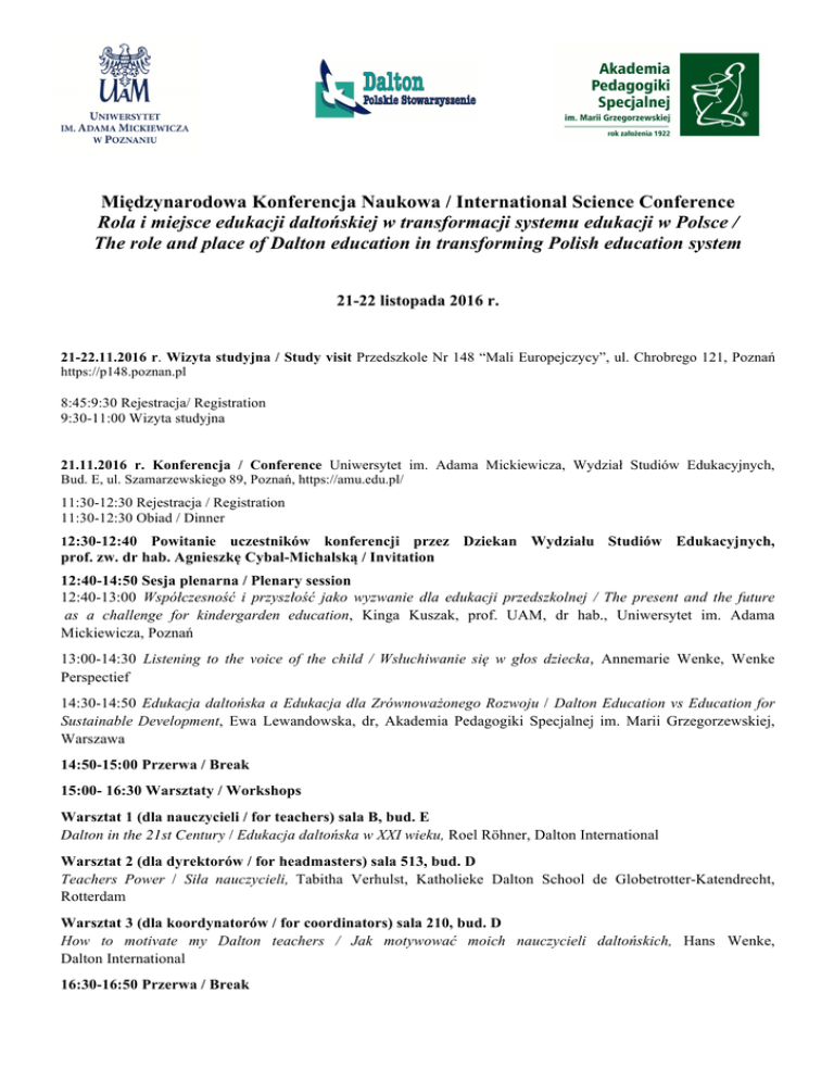 Międzynarodowa Konferencja Naukowa / International Science Conference Rola i miejsce edukacji daltońskiej w transformacji systemu edukacji w Polsce / The role and place of Dalton education in transforming Polish education system 21-22 listopada 2016 r. 21-22.11.2016 r. Wizyta studyjna / Study visit Przedszkole Nr 148 “Mali Europejczycy”, ul. Chrobrego 121, Poznań https://p148.poznan.pl 8:45:9:30 Rejestracja/ Registration 9:30-11:00 Wizyta studyjna 21.11.2016 r. Konferencja / Conference Uniwersytet im. Adama Mickiewicza, Wydział Studiów Edukacyjnych, Bud. E, ul. Szamarzewskiego 89, Poznań, https://amu.edu.pl/ 11:30-12:30 Rejestracja / Registration 11:30-12:30 Obiad / Dinner 12:30-12:40 Powitanie uczestników konferencji przez Dziekan Wydziału Studiów Edukacyjnych, prof. zw. dr hab. Agnieszkę Cybal-Michalską / Invitation 12:40-14:50 Sesja plenarna / Plenary session 12:40-13:00 Współczesność i przyszłość jako wyzwanie dla edukacji przedszkolnej / The present and the future as a challenge for kindergarden education, Kinga Kuszak, prof. UAM, dr hab., Uniwersytet im. Adama Mickiewicza, Poznań 13:00-14:30 Listening to the voice of the child / Wsłuchiwanie się w głos dziecka, Annemarie Wenke, Wenke Perspectief 14:30-14:50 Edukacja daltońska a Edukacja dla Zrównoważonego Rozwoju / Dalton Education vs Education for Sustainable Development, Ewa Lewandowska, dr, Akademia Pedagogiki Specjalnej im. Marii Grzegorzewskiej, Warszawa 14:50-15:00 Przerwa / Break 15:00- 16:30 Warsztaty / Workshops Warsztat 1 (dla nauczycieli / for teachers) sala B, bud. E Dalton in the 21st Century / Edukacja daltońska w XXI wieku, Roel Röhner, Dalton International Warsztat 2 (dla dyrektorów / for headmasters) sala 513, bud. D Teachers Power / Siła nauczycieli, Tabitha Verhulst, Katholieke Dalton School de Globetrotter-Katendrecht, Rotterdam Warsztat 3 (dla koordynatorów / for coordinators) sala 210, bud. D How to motivate my Dalton teachers / Jak motywować moich nauczycieli daltońskich, Hans Wenke, Dalton International 16:30-16:50 Przerwa / Break 16:50-17:35 Warsztaty / Workshops Warsztat 4 (dla nauczycieli przedszkoli / for kindergarden’s teachers) sala B, bud. E Świadomy nauczyciel - samodzielny przedszkolak. Sposoby aktywizacji potencjału poznawczego dziecka w kontekście edukacji daltońskiej i froeblowskiej / A conscious teacher equals a self-reliant kindergartener. Techniques for activating a child's cognitive potential in the context of Dalton and Froebel education, Katarzyna Małek, Przedszkole Nr 43, Lublin Warsztat 5 (dla nauczycieli przedszkoli / kindergarden’s teachers) aula, bud. D Samodzielność i odpowiedzialność w kontekście edukacji poza salą dzieci / Responsibility and self-reliance in the context of children's education outside a classroom, Kinga Wiśniewska, Karolina Zawalska, Przedszkole Nr 148 “Mali Europejczycy”, Poznań Warsztat 6 (dla nauczycieli szkół / for school’s teachers) sala 210, bud. D Ocenianie kształtujące w planie daltońskim / Formative assessment in the Dalton Plan, Anna Siemiątkowska, Szkoła Podstawowa, Dzbenin Warsztat 7 (dla nauczycieli szkół) sala 021, bud. D Autonomia, jako podstawa systemu pedagogiki daltońskiej w polskiej szkole / Autonomy as the basis for the Dalton pedagogy system in Polish schools, Anna Sowińska, Alter Edukacja, Łódź 17:35-17:50 Przerwa / Break 17:50-18:50 Podsumowanie, wręczenie certyfikatów i zakończenie Konferencji / Closing ceremony Organizatorzy: Uniwersytet im. Adama Mickiewiczaw w Poznaniu, Wydział Studiów Edukacyjnych Akademia Pedagogiki Specjalnej im. Marii Grzegorzewskiej w Warszawie, Zakład Wczesnej Edukacji Polskie Stowarzyszenie Dalton Komitet naukowy: Józefa Bałachowicz, dr hab., prof. APS Hanna Krauze-Sikorska, dr hab., prof. UAM Kinga Kuszak, dr hab., prof. UAM - Przewodnicząca Komitetu Naukowego z UAM Ewa Lewandowska, dr, APS – Przewodnicząca Komitetu Naukowego z APS Roel Röhner - President Dalton International Komitet organizacyjny: Polskie Stowarzyszenie Dalton Wydział Studiów Edukacyjnych: mgr Karolina Domagalska-Nowak, mgr Jakub Kazimierczak Partnerzy strategiczni: Organisation Mondiale Pour L’Éducation Préscolaire Organización Mundial Para La Educatión Preescolar World Organization for Early Childhood Education Polski Komitet Światowej Organizacji Wychowania Przedszkolnego OMEP