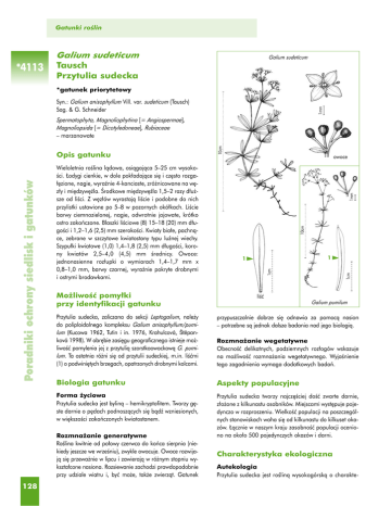 Gatunki roÊlin *4113 Galium sudeticum Tausch Przytulia sudecka Galium sudeticum *gatunek priorytetowy 1mm Syn.: Galium anisophyllum Vill. var. sudeticum (Tausch) Sag. & G. Schneider Mo˝liwoÊç pomy∏ki przy identyfikacji gatunku 1mm 1 1 1cm liÊç Galium pumilum Przytulia sudecka, zaliczana do sekcji Leptogalium, nale˝y do poliploidalnego kompleksu Galium anisophyllum/pumilum (Kucowa 1962, Tutin i in. 1976, Krahulcová, Štěpanková 1998). W obr´bie zasi´gu geograficznego istnieje mo˝liwoÊç pomylenia jej z przytulià szorstkoowockowà G. pumilum. Ta ostatnia ró˝ni si´ od przytulii sudeckiej, m.in. liÊçmi (1) o podwini´tych brzegach, opatrzonych drobnymi kolcami. przypuszczalnie dobrze si´ odnawia za pomocà nasion – potrzebne sà jednak dalsze badania nad jego biologià. Biologia gatunku Aspekty populacyjne Forma ˝yciowa Przytulia sudecka jest bylinà – hemikryptofitem. Tworzy g´ste darnie o p´dach podnoszàcych si´ bàdê wzniesionych, w wi´kszoÊci zakoƒczonych kwiatostanem. Przytulia sudecka tworzy najcz´Êciej doÊç zwarte darnie, z∏o˝one z kilkunastu osobników. Miejscami wyst´puje pojedynczo w rozproszeniu. WielkoÊç populacji na poszczególnych stanowiskach waha si´ od kilkunastu do kilkuset okazów. ¸àcznie w naszym kraju zasobnoÊç populacji oceniono na oko∏o 500 pojedynczych okazów i darni. Rozmna˝anie generatywne RoÊlina kwitnie od po∏owy czerwca do koƒca sierpnia (niekiedy jeszcze we wrzeÊniu), zwykle owocuje. Owoce rozwijajà si´ przewa˝nie w lipcu i zawierajà w ró˝nym stopniu wykszta∏cone nasiona. Rozsiewanie zachodzi prawdopodobnie przy udziale wiatru i, byç mo˝e, tak˝e zwierzàt. Gatunek 128 10cm Wieloletnia roÊlina làdowa, osiàgajàca 5–25 cm wysokoÊci. ¸odygi cienkie, w dole pok∏adajàce si´ i cz´sto rozga∏´zione, nagie, wyraênie 4-kanciaste, zró˝nicowane na w´z∏y i mi´dzyw´êla. Ârodkowe mi´dzyw´êla 1,5–2 razy d∏u˝sze od liÊci. Z w´z∏ów wyrastajà liÊcie i podobne do nich przylistki ustawione po 5–8 w pozornych okó∏kach. LiÊcie barwy ciemnozielonej, nagie, odwrotnie jajowate, krótko ostro zakoƒczone. Blaszki liÊciowe (8) 15–18 (20) mm d∏ugoÊci i 1,2–1,6 (2,5) mm szerokoÊci. Kwiaty bia∏e, pachnàce, zebrane w szczytowe kwiatostany typu luênej wiechy. Szypu∏ki kwiatowe (1,0) 1,4–1,8 (2,5) mm d∏ugoÊci, korony kwiatów 2,5–4,0 (4,5) mm Êrednicy. Owoce: jednonasienne roz∏upki o wymiarach 1,4–1,7 mm x 0,8–1,0 mm, barwy czarnej, wyraênie pokryte drobnymi i ostrymi brodawkami. owoce 1cm Poradniki ochrony siedlisk i gatunków Opis gatunku 10cm Spermatophyta, Magnoliophytina [= Angiospermae], Magnoliopsida [= Dicotyledoneae], Rubiaceae – marzanowate Rozmna˝anie wegetatywne ObecnoÊç delikatnych, podziemnych roz∏ogów wskazuje na mo˝liwoÊç rozmna˝ania wegetatywnego. WyjaÊnienie tego zagadnienia wymaga dodatkowych badaƒ. Charakterystyka ekologiczna Autekologia Przytulia sudecka jest roÊlinà wysokogórskà o charakte- RoÊliny kwiatowe Zbiorowiska roÊlinne, z którymi gatunek jest zwiàzany Przytulia sudecka, w ró˝nych cz´Êciach zasi´gu geograficznego, wchodzi w sk∏ad rozmaitych zbiorowisk roÊlinnych: • w polskich i czeskich Karkonoszach (Sudety Zachodnie) gatunek wyst´puje w wysokogórskich murawach z klasy Juncetea trifidi i w ubogich murawach bliêniczkowych rz´du Nardetalia z klasy Nardo-Callunetea (Štursa i in. 1999, Kwiatkowski 2001). Pojedyncze osobniki wchodzà w sk∏ad zbiorowisk szczelinowych z klasy Asplenietea rupestria. Optimum wyst´powania gatunku przypada jednak na pionierskie zbiorowiska piargów z rz´du Androsacetalia alpinae z klasy Thlaspietea rotundifolii – przede wszystkim endemiczny zespó∏ Saxifrago-Festucetum versicoloris saxifragetosum basalticae (Kwiatkowski 1997); • w Wysokim Jesioniku (Czeskie Sudety Wschodnie) jest g∏ównie sk∏adnikiem wysokogórskich acidofilnych muraw z klasy Juncetea trifidi (Štursa i in. 1999); • na obszarze S∏awkowskiego Lasu (po∏udniowo-zachodnie Czechy) jest sk∏adnikiem zbiorowisk szczelinowych paproci z klasy Asplenietea rupestria (zespó∏ Asplenietum serpentini) oraz przeÊwietlonych borów sosnowych na glebach inicjalnych – z klasy Vaccinio-Piceetea (zespó∏ Dicrano-Pinetum – Krahulcová, Štěpanková 1998; Štursa i in. 1999, Slavik 2000). 8220 skiego, alpejskiego i niwalnego w Tatrach, poroÊni´te przez ubogie zbiorowiska niskich roÊlin; – krzemianowe Êciany skalne z chasmofitycznà roÊlinnoÊcià. *4113 Rozmieszczenie geograficzne Wyst´powanie w Êwiecie Endemit hercyƒski, o bardzo ograniczonym zasi´gu, zwiàzany z górami Europy Ârodkowej. Wyst´puje na wysokoÊci od 650 do 1390 m n.p.m.; optimum wysokoÊciowe gatunku w Polsce znajduje si´ w pi´trze subalpejskim (w∏aÊciwie jednak powinien byç uwa˝any za gatunek subalpejsko-dealpejski, z uwagi na bardzo nisko po∏o˝one stanowiska w S∏awkowskim Lesie w Czechach). Wyst´puje w trzech izolowanych geograficznie oÊrodkach w Europie Ârodkowej: • w Sudetach Zachodnich w Karkonoszach, w ich polskiej i czeskiej cz´Êci; • w Sudetach Wschodnich, w Wysokim Jesioniku w pó∏nocno-wschodnich Czechach; • w S∏awkowskim Lesie w po∏udniowo-zachodnich Czechach (rejon Mariaƒskich ¸aêni). Podawane w literaturze (Haeupler, Schönfelder 1989, Meusel, Jäger 1992) stanowiska gatunku w Niemczech wymagajà przeprowadzenia dodatkowych badaƒ taksonomicznych. Wyst´powanie w Polsce W naszym kraju wyst´powanie przytulii sudeckiej ograniczone jest do dwóch stanowisk. Oba po∏o˝one sà w kot∏ach polodowcowych w pi´trze subalpejskim Karkonoszy. Znane sà od ponad 120 lat (Šourek 1969 i cytowana tam literatura, Kwiatkowski 2001). Pierwsze stanowisko znajduje si´ w obr´bie ˚lebu (˚y∏y) Bazaltowego Ma∏ego Ânie˝nego Kot∏a w Karkonoszach Zachodnich, na wysokoÊci 1240–1390 m n.p.m., drugie – na terenie tzw. ˚lebu (˚y∏y) Porfirowego w Kotle Ma∏ego Stawu w 