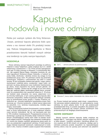 warzywnictwo Mariusz Podymniak Hortus Media Kapustne hodowlainoweodmiany Hodowla Noweodmianywarzywkapustnychpowstająna północy Holandiiw stacjiTuitjenhorn,gdzieznajdujesięm.in.obiekt szklarniowyo powierzchni 1,1 ha.W tenproceszaangażowanychjest 15osób(równieżw Hiszpaniii w południowejAfryce). Jak wyjaśnił Marcel Raats, menedżer produktu ds. warzywkapustnychNickerson-ZwaanHolandia,w hodowlikapusty białej, stożkowej i włoskiej zwraca się uwagę na trzy podstawowegrupycech.Po pierwszeoceniasięparametry produkcyjne, związane z zachowaniem się roślin w czasie uprawy.W tymprzypadkubadana jestjakośći wigornasion, wyrównanie i wielkość plonu, wczesność i wigor roślin, odpornośćna stresyabiotyczneorazmożliwośćmechanicznego zbioru. Duże znaczenie ma ocena samych główek, ich wielkościi kształtu.Zwracasięteżuwagęna ichinnecechy, takiejak:wielkośćgłąba,zamknięciegłówekliśćmi,przydatnośćdo przetwórstwaorazzawartośćwitaminy C.W procesie hodowli duże znaczenie ma ocena odporności m.in. na chorobybakteryjne,w tymczarnązgniliznękapusty(Xanthomonascampestris),bielikakrzyżowych(Albugocandida), oraz te powodowane przez grzyby z rodzaju Fusarium sp., Verticilium sp.,chorobybakteryjnewywoływaneprzezPseudomonas sp.i Erwiniacarotovora,a takżeocena odporności na szkodniki, m.in. tantnisia krzyżowiaczka, śmietkę kapuścianąi wciornastki. Oprócztradycyjnejhodowli(krzyżowaniei ocena pojedynków) w firmie wykorzystuje się, w coraz większym stopniu, nowe techniki hodowlane. Na ten cel kierowane jest około 70%środkówinwestycyjnych.Przyspieszenieprocesuhodowlanegouzyskujesięchociażbydziękimarkerommolekularnym umożliwiającym ocenę cech roślin na bardzo wczesnymetapiehodowli.Posługującsięmarkeramimolekularnymi,możnateżzbadaćczystośćgenetycznądanejpartiinasionczypotwierdzićoryginalnośćodmiany.Z koleiwykorzystującmetodękrzyżowańwsobnych,realizowanychw kulturachinvitro,możnaw krótkimczasieoczyścićliniehodowla- 72 n Sati F1 – odmiana polecana do przechowywania n Chamonix F1 tworzy ciężkie, śnieżnobiałe róże, dobrze okryte liśćmi ne. Proces hodowli jest jednak nadal drogi i czasochłonny. Od pierwszej selekcji pojedynków do wprowadzenia nowej odmiany na rynek upływa około 15 lat. Jak przekonywali przedstawicielefirmy,toprzedewszystkimdlapolskichproducentów poszukuje się nowych odmian wczesnych oraz przeznaczonychdo długiegoprzechowywania. NoweodmiaNy Wśród nowych odmian kapusty białej znajduje się Delight Ball F1, cechująca się bardzo dobrym wigorem już w faziesiewek,i szybkimwzrostem.Handlowegłówkimożnauzyskaćpo 53–60dniachod sadzenia,dlategojestto odmiana polecana przede wszystkim na najwcześniejsze terminy zbioru oraz do uprawy pod osłonami lub płaskimi OWOce WarzyWa KWiaty 1 / 2012 OwoceWarzywaKwiaty.pl warz ywnictwo n Kapusta stożkowa ma wyśmienity smak i kruche liście przykryciami. Kolejna nowość to Taurus F1, której główki (4–5 kg, a nawet do 10 kg) można zbierać po 100–110 dniach od posadzenia. Silny wigor i mocny system korzeniowy sprawiają, że odmiana ta dobrze sobie radzi na różnych(równieżsłabszych)stanowiskach.SatieF1 jestpolecana do przechowywania(do końcamarca)i do przetwórstwa. Tworzy główki o masie 2–6 kg, które dorastają po 130–140dniachwegetacji. Na polskirynekwprowadzanesąteżodmianykapuststożkowych, bardzo popularne w takich krajach, jak: Niemcy, Holandia,WielkaBrytaniai Portugalia.Jesttozasługaprzede wszystkim ich smaku, nieco zbliżonego do smaku wczesnychodmiankapustygłowiastejbiałej.Liściekapuststożkowych są delikatne, kruche i soczyste. Oprócz dotychczas oferowanej odmiany Duchy F1, niebawem będzie wprowadzona do Polskikolejna – DutchmanF1,którejgłówkio masie 1–1,5 kgmożnazbieraćpo 65–70dniachod posadzenia. Taka wielkość odpowiada współczesnym odbiorcom i jest akceptowana przezprzeciętnymodel 3–4-osobowejrodziny. W Europie Zachodniej, aby tego typu kapusty oferować przezmożliwiedługiczasw okresienaszejkalendarzowejzimy,uprawiasięjenp.w Hiszpanii. Powierzchnia uprawy kalafiorów w Polsce (przeznaczonychdomrożenia)jestszacowana na około 2,2tys. ha. Dużow Europieuprawiasięichtakżew Hiszpanii(1,4tys.ha) orazw krajachBeneluksu(4tys.ha).Do mrożeniaprzeznacza się około 10–15% światowej produkcji. Wśród nowych, alternatywnych sposobów zagospodarowania w niektórych krajach oferuje się kruszonkę z kalafiorów w woreczkach, przeznaczoną do bezpośredniego spożycia. Odmianą kalafiora,któracieszysięszczególniedużąpopularnościąw Belgii(25%rynku)jestSeoulF1.Jejszczególnącechąsąciężkie róże,coprzyczyniasiędo wysokiejplenności.ChamonixF1 toz koleiodmiana polecana na rynekwarzywświeżychi dla przemysłu.Tworzyciężkie,śnieżnobiałeróże,dobrzeokryte liśćmi. Okres wegetacji tej odmiany, polecanej na zbiór jesienny(IX–X),wynosi 85–95dni. Kapusta brukselska to typowo północnoeuropejskie warzywo. Najwięcej produkuje się jej w Holandii, rocznie około 70tys.ton(w Polsceokoło 15tys.ton),gdziewiększość główek zbiera się maszynowo. Ich optymalna średnica to 23–31 mm. Ważną cechą odmian jest również trwałość pozbiorcza,czylibraktendencjido żółknięciazewnętrznychliścipo ścięciu.TypowąodmianąprzemysłowąjestBrestF1. Na rynek warzyw świeżych firma Nickerson-Zwaan poleca odmianęBrightF1,któratworzywiększegłówki,charakteryzujesięsilnymwigoremi możebyćuprawiana w różnychterminach.n OWOce WarzyWa KWiaty 1 / 2012 OwoceWarzywaKwiaty.pl 73
