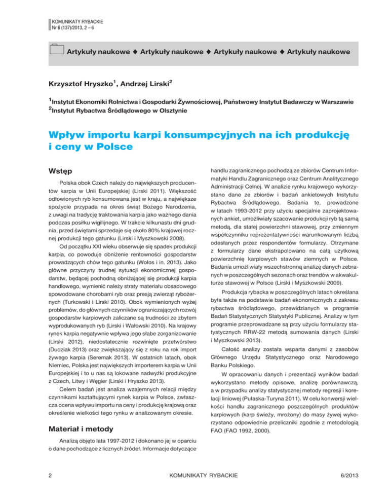 KOMUNIKATY RYBACKIE Nr 6 (137)/2013, 2 – 6 0 Artyku³y naukowe ¨ Artyku³y naukowe ¨ Artyku³y naukowe ¨ Artyku³y naukowe Krzysztof Hryszko1, Andrzej Lirski2 1 Instytut Ekonomiki Rolnictwa i Gospodarki ¯ywnoœciowej, Pañstwowy Instytut Badawczy w Warszawie Instytut Rybactwa Œródl¹dowego w Olsztynie 2 Wp³yw importu karpi konsumpcyjnych na ich produkcjê i ceny w Polsce Wstêp handlu zagranicznego pochodz¹ ze zbiorów Centrum Infor- Polska obok Czech nale¿y do najwiêkszych producentów karpia w Unii Europejskiej (Lirski 2011). Wiêkszoœæ od³owionych ryb konsumowana jest w kraju, a najwiêksze spo¿ycie przypada na okres œwi¹t Bo¿ego Narodzenia, z uwagi na tradycjê traktowania karpia jako wa¿nego dania podczas posi³ku wigilijnego. W trakcie kilkunastu dni grudnia, przed œwiêtami sprzedaje siê oko³o 80% krajowej rocznej produkcji tego gatunku (Lirski i Myszkowski 2008). Od pocz¹tku XXI wieku obserwuje siê spadek produkcji karpia, co powoduje obni¿enie rentownoœci gospodarstw prowadz¹cych chów tego gatunku (Wo³os i in. 2013). Jako g³ówne przyczyny trudnej sytuacji ekonomicznej gospodarstw, bêd¹cej pochodn¹ obni¿aj¹cej siê produkcji karpia handlowego, wymieniæ nale¿y straty materia³u obsadowego spowodowane chorobami ryb oraz presj¹ zwierz¹t rybo¿ernych (Turkowski i Lirski 2010). Obok wymienionych wy¿ej problemów, do g³ównych czynników ograniczaj¹cych rozwój gospodarstw karpiowych zaliczane s¹ trudnoœci ze zbytem wyprodukowanych ryb (Lirski i Wa³owski 2010). Na krajowy rynek karpia negatywnie wp³ywa jego s³abe zorganizowanie (Lirski 2012), niedostatecznie rozwiniête przetwórstwo (Dudziak 2013) oraz zwiêkszaj¹cy siê z roku na rok import ¿ywego karpia (Seremak 2013). W ostatnich latach, obok Niemiec, Polska jest najwiêkszych importerem karpia w Unii Europejskiej i to u nas s¹ lokowane nadwy¿ki produkcyjne z Czech, Litwy i Wêgier (Lirski i Hryszko 2013). Celem badañ jest analiza wzajemnych relacji miêdzy czynnikami kszta³tuj¹cymi rynek karpia w Polsce, zw³aszcza ocena wp³ywu importu na ceny i produkcjê krajow¹ oraz okreœlenie wielkoœci tego rynku w analizowanym okresie. matyki Handlu Zagranicznego oraz Centrum Analitycznego Administracji Celnej. W analizie rynku krajowego wykorzystano dane ze zbiorów i badañ ankietowych Instytutu Rybactwa Œródl¹dowego. Badania te, prowadzone w latach 1993-2012 przy u¿yciu specjalnie zaprojektowanych ankiet, umo¿liwia³y szacowanie produkcji ryb t¹ sam¹ metod¹, dla sta³ej powierzchni stawowej, przy zmiennym wspó³czynniku reprezentatywnoœci warunkowanym liczb¹ odes³anych przez respondentów formularzy. Otrzymane z formularzy dane ekstrapolowano na ca³¹ u¿ytkow¹ powierzchniê karpiowych stawów ziemnych w Polsce. Badania umo¿liwia³y wszechstronn¹ analizê danych zebranych w poszczególnych sezonach oraz trendów w akwakulturze stawowej w Polsce (Lirski i Myszkowski 2009). Produkcja rybacka w poszczególnych latach okreœlana by³a tak¿e na podstawie badañ ekonomicznych z zakresu rybactwa œródl¹dowego, przewidzianych w programie Badañ Statystycznych Statystyki Publicznej. Analizy w tym programie przeprowadzane s¹ przy u¿yciu formularzy statystycznych RRW-22 metod¹ sumowania danych (Lirski i Myszkowski 2013). Ca³oœæ analizy zosta³a wsparta danymi z zasobów G³ównego Urzêdu Statystycznego oraz Narodowego Banku Polskiego. W opracowaniu danych i prezentacji wyników badañ wykorzystano metody opisowe, analizê porównawcz¹, a w przypadku analizy statystycznej metody regresji i korelacji liniowej (Pu³aska-Turyna 2011). W celu konwersji wielkoœci handlu zagranicznego poszczególnych produktów karpiowych (karp œwie¿y, mro¿ony) do masy ¿ywej wykorzystano odpowiednie przeliczniki zgodnie z metodologi¹ Materia³ i metody FAO (FAO 1992, 2000). Analiz¹ objêto lata 1997-2012 i dokonano jej w oparciu o dane pochodz¹ce z licznych Ÿróde³. Informacje dotycz¹ce 2 KOMUNIKATY RYBACKIE 6/2013 y = 0,9959x + 1,9215 y = -0,0004x + 15,667 2 R = 0,7721 R = -0,8787 12 2 R = 0,8711 10 R = 0,9333 10 Cena hurtowa Cena hurtowa 12 8 6 4 5 6 7 Cena importowa 8 9 Rys. 1. Cena importowa i cena hurtowa karpi (z³/kg). 15000 karpia sta³ siê atrakcyjny i dochodowy dla importerów. Zawdziêczaæ to nale¿y wielkoœci tego rynku oraz kursów z³otego wobec waluty narodowej eksporterów lub dolara amerykañskiego, który wówczas funkcjonowa³ w rozliczeniach (Krûger 2002). Oferty cenowe karpia z importu by³y w tym czasie bardzo konkurencyjne w stosunku do cen krajowych. Op³acalnoœæ przywozu karpia do Polski potwierdza analiza statystyczna, która wykaza³a siln¹ zale¿noœæ cen transakcyjnych notowanych w imporcie, z cenami hurtowymi karpia w kraju. Zarówno wspó³czynnik korelacji (R), jak i determinacji (R2) przyjmuj¹ bardzo wysokie wartoœci (odpowiednio 0,93 i 0,87) (rys. 1), co praktycznie oznacza, ¿e zmianom hurtowych cen karpi w kraju odpowiada analogiczna zmiana cen importowych, dostosowuj¹ca siê do aktualnej sytuacji rynkowej. W badanym okresie ró¿nice w poziomie cen importowych i hurtowych by³y zbli¿one i wynosi³y 20-30%, a w pojedynczych latach przekracza³y 40% (1997-1998, 2000 i 2007). Na podstawie opisanych zale¿noœci mo¿na stwierdziæ, ¿e eksporterzy karpia do Polski uwzglêdniali w cenie tak¿e ewentualne zmiany kursu z³otego wobec ich waluty narodowej lub euro. Jednocze- Podobne zale¿noœci odnotowywano te¿ w handlu karpiem przed II wojn¹ œwiatow¹, w warunkach gospodarki wolnorynkowej. W II Rzeczpospolitej wzrastaj¹ca produkcja krajowa karpia natrafia³a na potêguj¹ce siê problemy z lokowaniem jej na rynku. Eksport z wielu wzglêdów nie by³ mo¿liwy (Kolanek 1938), natomiast zwiêkszaj¹cy siê import by³ oceniany w Polsce jako podstawowa przyczyna perturbacji rynkowych. Sp³ywaj¹cy z zagranicy ¿ywy karp wp³ywa³ na sytuacjê rynkow¹ nie tylko swoj¹ iloœci¹, ale i cen¹, wed³ug oceny autora w stopniu nieproporcjon