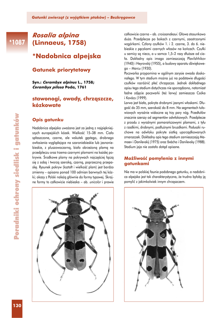 Gatunki zwierzàt (z wyjàtkiem ptaków) – Bezkr´gowce *1087 Rosalia alpina (Linnaeus, 1758) *Nadobnica alpejska Gatunek priorytetowy Syn.: Cerambyx alpinus L., 1758; Cerambyx pilosa Poda, 1761 Poradniki ochrony siedlisk i gatunków stawonogi, owady, chrzàszcze, kózkowate 130 Opis gatunku Nadobnica alpejska uwa˝ana jest za jednà z najpi´kniejszych europejskich kózek. WielkoÊç 15–38 mm. Cia∏o sp∏aszczone, czarne, ale wskutek g´stego, drobnego ow∏osienia wyglàdajàce na szaroniebieskie lub jasnoniebieskie, z pluszowoczarnà, bia∏o obrze˝onà plamà na przedpleczu oraz trzema czarnymi plamami na ka˝dej pokrywie. Ârodkowe plamy na pokrywach najcz´Êciej ∏àczà si´ z sobà i tworzà szerokà, czarnà, poprzecznà przepask´. Rysunek pokryw (kszta∏t i wielkoÊç plam) jest bardzo zmienny – opisano ponad 100 odmian barwnych tej kózki; okazy z Polski nale˝à g∏ównie do formy typowej. Skrajne formy to ca∏kowicie niebieska – ab. unicolor i prawie ca∏kowicie czarna – ab. croissandeaui. G∏owa stosunkowo du˝a. Przedplecze po bokach z czarnymi, zaostrzonymi wzgórkami. Cz∏ony czu∏ków 1. i 2. czarne, 3. do 6. niebieskie z p´czkami czarnych w∏osów na koƒcach. Czu∏ki u samicy sà nieco, a u samca 1,5–2 razy d∏u˝sze od cia∏a. Dok∏adny opis imago zamieszczajà Plavilshhikov (1940) i Heyrovský (1955), a budowy aparatu dêwi´kowego – Marcu (1930). Poczwarka przypomina w ogólnym zarysie owada doskona∏ego. W tym stadium mo˝na ju˝ na podstawie d∏ugoÊci czu∏ków rozró˝niç p∏eç chrzàszcza. Jednak dok∏adnego opisu tego stadium dotychczas nie sporzàdzono, natomiast ∏adne zdj´cie poczwarki (te˝ larwy) zamieszcza Csóka i Kovács (1999). Larwa jest bia∏a, pokryta drobnymi jasnymi w∏oskami. D∏ugoÊç do 35 mm, szerokoÊç do 8 mm. Na segmentach tu∏owiowych wyraênie widoczne sà trzy pary nóg. Przedtu∏ów znacznie szerszy od segmentów odw∏okowych. Przedplecze z przodu z wyraênymi pomaraƒczowymi plamami, z ty∏u z rzadkimi, drobnymi, pod∏u˝nymi bruzdkami. Poduszki ruchowe na odw∏oku pokryte siatkà uporzàdkowanych zmarszczek. Dok∏adny opis tego stadium zamieszczajà Mamaev i Danilevskij (1975) oraz Svácha i Danilevsky (1988). Stadium jaja nie zosta∏o dotàd opisane. Mo˝liwoÊç pomylenia z innymi gatunkami Nie ma w polskiej faunie podobnego gatunku, a nadobnica alpejska jest tak charakterystyczna, ˝e trudno by∏oby jà pomyliç z jakimkolwiek innym chrzàszczem. *Nadobnica Nazwa zwierzaka alpejska W∏aÊciwoÊci biologiczne Wra˝liwoÊç Chrzàszcze sà stosunkowo ma∏o p∏ochliwe, a ich lot niezbyt szybki. Mocniej zaniepokojone, np. widokiem i szmerem nadchodzàcego cz∏owieka (lub te˝ innym zjawiskiem), spadajà w dó∏ i udajà martwe (zginajà nogi i prostujà czu∏ki). Wtedy trudno je znaleêç w Êció∏ce lub trawie. AktywnoÊç Imagines pojawiajà si´ w Polsce od drugiej po∏owy czerwca do pierwszych dni wrzeÊnia, przy maksimum przypadajàcym na koniec lipca i pierwszà po∏ow´ sierpnia. Aktywne sà w dzieƒ, zw∏aszcza w godzinach oko∏opo∏udniowych. Po wyl´gni´ciu poczàtkowo pozostajà na drewnie, z którego si´ wyl´g∏y, póêniej przyst´pujà do rójki, która odbywa si´ w czasie ciep∏ej i s∏onecznej pogody. Chrzàszcze poruszajà si´ doÊç sprawnie po pniach drzew lub sàgach drewna, przelatujà doÊç oci´˝a∏ym, powolnym lotem z jednego drzewa na drugie, kopulujà. W czasie godów samce wykazujà du˝à aktywnoÊç: gonià za samicami po pniu i prowadzà mi´dzy sobà swoiste utarczki. Polega to na tym, ˝e obaj zalotnicy podnoszà przednià cz´Êç cia∏a i straszà si´ nawzajem rozwartymi ˝uwaczkami. S∏abszy samiec zwykle pozostaje na miejscu, a zwyci´zca podejmuje bieg za samicami. Kopulacja trwa najcz´Êciej kilkanaÊcie minut, czasem jednak d∏u˝ej. W czasie kopulacji samiec znajduje si´ na grzbiecie samicy, obejmujàc jej tu∏ów przednimi odnó˝ami. W trakcie tego aktu wykonuje rytmiczne, konwulsyjne ruchy cia∏em, które nie sà raczej obserwowane u innych owadów. W tym czasie chrzàszcze stosunkowo ∏atwo jest zauwa˝yç. Jednak kiedy owady te pozostajà bez ruchu, zazwyczaj sytuujà si´ w takich miejscach, ˝e ubarwienie ich cia∏a zlewa si´ z barwà pod∏o˝a (kora i porosty na bukach) – sà wtedy trudne do odnalezienia. Potrafià siedzieç nieruchomo przez d∏ugi okres (godziny), nawet w czasie s∏o- Sposób od˝ywiania W Polsce larwy ˝erujà na buku pospolitym (Fagus sylvatica). W po∏udniowym areale zasi´gu zasiedlany jest równie˝ buk wschodni (F. orientalis), rzadziej inne drzewa (krzewy) liÊciaste: grab pospolity – Carpinus betulus, wiàz – Ulmus, klon – Acer (np. klon jawor – A. pseudoplatanus, klon polny – A. campestre), orzech w∏oski – Juglans regia, kasztan jadalny – Castanea sativa, jesion wynios∏y – Fraxinus excelsior, dàb – Quercus, kasztanowiec – Aesculus, wierzba – Salix, lipa – Tilia, topola – Populus, olcha – Alnus (np. olcha czarna – A. glutinosa), g∏óg – Crataegus, grusza – Pyrus. ˚erowiska usytuowane sà g∏´boko w drewnie, g∏ównie na granicy drewna bielastego i twardzieli. Larwy, je˝eli jaja zosta∏y z∏o˝one w korze, ˝erujà poczàtkowo w jej mià˝szu, krótko pod korà, a póêniej w drewnie, stopniowo poszerzajàc chodniki wraz ze wzrostem cia∏a i kolejnymi linieniami. Doros∏e larwy wracajà tu˝ pod powierzchni´ zasiedlonego materia∏u i tam wygryzajà kolebk´ poczwarkowà. Postacie doros∏e mogà si´ od˝ywiaç sokiem wyciekajàcym z drzew – obserwowano taki przypadek na wiàzie i olszy. W warunkach sztucznych imagines ch´tnie spija∏y sok z soczystych owoców. *1087 Poradniki ochrony siedlisk i gatunków Cykl rozwoju Cykl rozwojowy trwa 3 lata (wyjàtkowo 2 lata), jednak w niesprzyjajàcych warunkach mikroklimatycznych albo troficznych mo˝e si´ przed∏u˝yç do lat czterech lub wi´cej. Z jaj z∏o˝onych w 