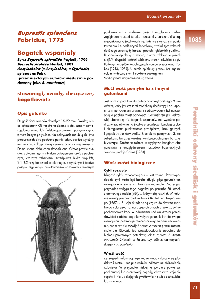 Bogatek Nazwa zwierzaka wspania∏y Buprestis splendens Fabricius, 1775 Bogatek wspania∏y Syn.: Buprestis splendida Paykull, 1799 Buprestis pretiosa Herbst, 1801 Ancylocheira (=Ancylochira, =Cypriacis) splendens Fabr. [przez niektórych autorów nies∏usznie podawany jako B. aurulenta] stawonogi, owady, chrzàszcze, bogatkowate D∏ugoÊç cia∏a owadów doros∏ych 15–29 mm. Owalny, nieco sp∏aszczony. Górna strona zielono-z∏ota, czasem szmaragdowozielona lub fioletowopurpurowa; pokrywy cz´sto z metalicznym po∏yskiem. Na pokrywach znajdujà si´ dwa purpurowoz∏ociste pod∏u˝ne paski: jeden, bardzo wyraêny, wzd∏u˝ szwu i drugi, mniej wyraêny, przy bocznej kraw´dzi. Dolna strona cia∏a jasno z∏oto-zielona. G∏owa prawie p∏aska, z d∏ugim i g´stym bia∏ym ow∏osieniem; czo∏o z pod∏u˝nym, czarnym ˝eberkiem. Przedplecze lekko wypuk∏e, 2,1–2,2 razy tak szerokie jak d∏ugie, z wyraênym i bardzo g´stym, regularnym punktowaniem na bokach i rzadszym 1085 Mo˝liwoÊç pomylenia z innymi gatunkami Jest bardzo podobny do pó∏nocnoamerykaƒskiego B. aurulenta, który jest czasami zawlekany do Europy i do Japonii z importowanym drewnem i obserwowany by∏ najcz´Êciej w pobli˝u miast portowych. Gatunek ten jest jaskrawiej ubarwiony ni˝ bogatek wspania∏y, ma wyraêne pod∏u˝ne zag∏´bienie na Êrodku przedplecza, bardziej grube i nieregularne punktowanie przedplecza; brak grubych i g∏´bokich punktów wzd∏u˝ ˝eberek na pokrywach. Same ˝eberka sà bardziej wyraêne, wystajàce, g∏adsze i bardziej b∏yszczàce. Dok∏adne ró˝nice w wyglàdzie imagines obu gatunków, z uwzgl´dnieniem narzàdów kopulacyjnych samców, podaje Cobos (1953). W∏aÊciwoÊci biologiczne Cykl rozwoju D∏ugoÊç cyklu rozwojowego nie jest znana. Prawdopodobnie cykl mo˝e byç bardzo d∏ugi, gdy˝ gatunek ten rozwija si´ w suchym i twardym materiale. Znany jest przypadek wyl´gu tego bogatka po przesz∏o 20 latach z domowego mebla (stó∏), w którym si´ rozwija∏. W naturze rozwój przypuszczalnie trwa kilka lat, wg Karpiƒskiego (1967) – 7. Jaja sk∏adane sà cz´sto do drewna martwego i starego, np. na stojàcych pniach drzew, zupe∏nie pozbawionych kory. W odró˝nieniu od wi´kszoÊci przedstawicieli rodziny bogatkowatych gatunek ten do swego rozwoju nie potrzebuje obecnoÊci kory na pniu lub konarze, ale mo˝e si´ rozwijaç nawet w mocno przesuszonym materiale. Biologia jest prawdopodobnie podobna do biologii pokrewnych gatunków, jak B. rustica i B. haemhorroidalis ˝yjàcych w Polsce, czy pó∏nocnoamerykaƒskiego – B. aurulenta. Poradniki ochrony siedlisk i gatunków Opis gatunku punktowaniem w Êrodkowej cz´Êci. Przedplecze z ma∏ym zag∏´bieniem przed tarczkà i czasami z bardzo delikatnà, niepunktowanà Êrodkowà linià. Pokrywy z wyraênym punktowaniem i 4 pod∏u˝nymi ˝eberkami; wzd∏u˝ tych ˝eberek doÊç regularne rz´dy bardzo grubych i g∏´bokich punktów. U samców epipleury z ma∏ym, ostrym zàbkiem w przedniej1/4 d∏ugoÊci; ostatni widoczny sternit odw∏oka Êci´ty. Budow´ narzàdów kopulacyjnych samca przedstawia Cobos (1953, 1986). U samic epipleury proste, bez zàbka; ostatni widoczny sternit odw∏oka zaokràglony. Stadia przedimaginalne nie sà znane. Wra˝liwoÊç Ze skàpych informacji wynika, ˝e owady doros∏e sà p∏ochliwe i bystre – reagujà szybkim odlotem na zbli˝anie si´ cz∏owieka. W przypadku niskiej temperatury powietrza, pochmurnej lub deszczowej pogody, chrzàszcze stajà si´ ospa∏e i nie uciekajà tak gwa∏townie na widok cz∏owieka lub zwierz´cia. 71 Gatunki zwierzàt (z wyjàtkiem ptaków) – Bezkr´gowce Poradniki ochrony siedlisk i gatunków 1085 AktywnoÊç Imagines pojawiajà si´ w czerwcu i lipcu, rzadziej w sierpniu lub w maju, a nawet ju˝ w kwietniu i marcu. Te wczesnowiosenne obserwacje mogà wynikaç z faktu rozwoju w meblach lub ocieplonych budynkach i w wolnej przyrodzie wyst´pujà rzadko. Okazy doros∏e aktywne sà w dzieƒ, przy s∏onecznej pogodzie. Przebywajà zazwyczaj w koronach drzew iglastych, gdzie od˝ywiajà si´ i kopulujà, a tylko zap∏odnione samice czasem schodzà ni˝ej, by z∏o˝yç jaja. Zazwyczaj jednak jaja sk∏adane sà równie˝ w wierzcho∏kowej cz´Êci koron uschni´tych drzew. Przed tà czynnoÊcià samica chodzi po pniu (obserwowano to na wysokoÊci od 3 do kilkunastu metrów) w poszukiwaniu odpowiedniej szczeliny, a znalaz∏szy, wsuwa weƒ pok∏ade∏ko, a nawet ca∏e cia∏o, i przyst´puje do z∏o˝enia jaja. Okres sk∏adania jaj trwa nie d∏u˝ej ni˝ 10 dni. Wyjàtkowo imagines by∏y spotykane na drzewach le˝àcych, lub na sàgach drewna. W przypadku rozwoju w obr´bie zabudowaƒ imagines znajdowano w sieciach paj´czych na strychach domów lub na Êcianach zabudowaƒ. RzadkoÊç obserwacji tego gatunku mo˝e cz´Êciowo wynikaç z ukrytego trybu ˝ycia w ma∏o dost´pnej dla bezpoÊredniej obserwacji strefie wierzcho∏ków drzew. Sposób od˝ywiania Larwy rozwijajà si´ w pniach i grubych konarach martwych drzew. Jako roÊliny ˝ywicielskie tego gatunku (poza Polskà) podawane by∏y ró˝ne gatunki sosen, w tym sosna zwyczajna Pinus sylvestris, P. densiflora, P. laricio, P. leucodermis, P. pinea, ale tak˝e modrzew europejski Larix decidua i dwa gatunki jode∏ (Abies alba, A. cephalonica). W Polsce roÊliny ˝ywicielskie larw w∏aÊciwie nie sà znane, poza wyhodowaniem go ze Êwierka pospolitego Picea abies, ale z materia∏u przetworzonego niewiadomego pochodzenia (deski w ∏ó˝ku). Âwierk, jako roÊlina ˝ywicielska (bez sprecyzowania gatunku), by∏ te˝ podany przez Obenbergera (1927). Autor ten donosi równie˝, ˝e w Rosji „znajdowano go na Populus nigra” – chodzi tu najprawdopodobniej o Pinus nigra, a przytoczona nazwa rodzajowa to zwyk∏a pomy∏ka drukarska. Chodniki larwalne zape∏nione sà drobnymi, màczystymi, zbitymi trocinkami. Kolebka poczwarkowa jest usytuowana raczej g∏