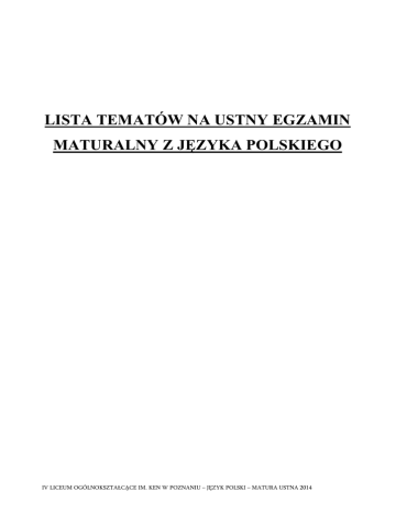 LISTA TEMATÓW NA USTNY EGZAMIN MATURALNY Z JĘZYKA POLSKIEGO IV LICEUM OGÓLNOKSZTAŁCĄCE IM. KEN W POZNANIU – JĘZYK POLSKI – MATURA USTNA 2014 LITERATURA – matura 2013/14 1. Porównaj róŜne modele Ŝycia na przykładzie analizy losów wybranych par małŜeńskich w literaturze polskiej. 2. Zanalizuj celowo wybrane utwory Marka Hłaski i porównaj je z wybranymi dziełami socrealistycznymi. 3. Scharakteryzuj specyfikę powieści grozy, analizując wybrane przykłady. 4. „Czarny charakter” w literaturze. Analizując wybrane przykłady, omów sposoby kreacji i funkcje w utworze. 5. Scharakteryzuj i porównaj, analizując wybrane przykłady literackie, portrety nauczycieli i uczniów. 6. Na podstawie analizy wybranego cyklu powieściowego z literatury polskiej (lub obcej) scharakteryzuj specyfikę sagi rodzinnej (np. M. Dąbrowska „Noce i dnie”). 7. Analizując celowo dobrane teksty, zbadaj, jaką rolę odgrywa literatura (ksiąŜka) i jej lektura w biografii wybranych bohaterów (np. A. Mickiewicz „Dziady” cz. IV, B. Prus „Lalka”). 8. Bohaterowie literaccy w poszukiwaniu nieśmiertelności. Omów zagadnienie na podstawie analizy wybranych przykładów z róŜnych epok. 9. Scharakteryzuj na podstawie analizy wybranych przykładów konwencję powieści epistolarnej (np. de Leclos „Niebezpieczne związki”, Rousseau „Nowa Heloiza”, Goethe „Cierpienia młodego Wertera”, Austen „Lady Susan”). 10. Analizując wybrane przykłady literackie z róŜnych epok /min.2-3/ przedstaw, jak zmieniała się rola kobiet w społeczeństwie. 11. Polacy w karykaturze Sławomira MroŜka. Analizując wybrane utwory dramatyczne i prozatorskie pisarza, scharakteryzuj wizerunek naszych rodaków. 12. Polacy w karykaturze Witolda Gombrowicza. Analizując wybrane utwory dramatyczne i prozatorskie pisarza, scharakteryzuj wizerunek naszych rodaków. 13. Polacy w karykaturze Ignacego Krasickiego. Scharakteryzuj wizerunek naszych rodaków, analizując wybrane przykłady twórczości oświeceniowego pisarza . 14. Scharakteryzuj i porównaj świat przedstawiony w utworach sensacyjnych/kryminalnych. Wykorzystaj analizę i interpretację wybranych przykładów róŜnych twórców lub jednego pisarza. 15. Biografia i twórczość wielkich ludzi/artystów jako źródło inspiracji dla pisarzy i poetów. Przedstaw problem, analizując wybrane przykłady. 16. Dokonaj analizy porównawczej zjawiska tzw. „choroby wieku” (tj. weltschmerz i dekadentyzm) w wybranych utworach literatury romantycznej i modernistycznej. 17. Literackie portrety dandysów. Scharakteryzuj i porównaj wybrane postaci na podstawie analizy wybranych utworów. 18. Siergiej Jesienin jako „poeta przeklęty”. Omów zagadnienie w oparciu o analizę twórczości i biografię poety. 19. Zbadaj wpływ biografii Jacka Londona na jego twórczość, analizując wybrane przykłady. 20. Zbadaj wpływ biografii Brunona Schulza na jego twórczość, analizując wybrane przykłady. 21. Scharakteryzuj i porównaj róŜne sposoby kreowania świata przedstawionego w literaturze polskiej związanej z II wojną światową. 22. Na podstawie analizy wybranych dzieł literackich scharakteryzuj i porównaj róŜne obrazy miasta w literaturze. 23. Zaprezentuj i scharakteryzuj specyfikę twórczości wybranej przedstawicielki współczesnej polskiej prozy kobiecej, analizując wybrane utwory.(np. .O. Tokarczuk, K. Kofta, K. Grochola, N. Göerke). 24. Portrety cudzoziemców w twórczości polskich pisarzy. Scharakteryzuj i porównaj wybranych bohaterów literackich, analizując wybrane celowo utwory. 25. Usunięto 26. Polska, ale jaka? Scharakteryzuj róŜne wizje ojczyzny zawarte w literaturze XIX i/lub XX wieku, analizując wybrane przykłady. 27. Lekarz – zawód, czy posłannictwo? Scharakteryzuj i porównaj róŜne kreacje lekarzy w literaturze polskiej i obcej. 28. Zbadaj wpływ biografii Fiodora Dostojewskiego na jego twórczość na podstawie analizy wybranych dzieł. 29. Zazdrość jako motyw literacki. Przeanalizuj i przedstaw problem w wybranych przykładach literackich. IV LICEUM OGÓLNOKSZTAŁCĄCE IM. KEN W POZNANIU – JĘZYK POLSKI – MATURA USTNA 2014 30. RóŜne sposoby obrazowania totalitaryzmu i zniewolenia. Przedstaw zagadnienie na przykładzie analizy wybranych utworów współczesnych pisarzy. 31. Scharakteryzuj twórczość „poetów przeklętych”, analizując wybrane dzieła oraz wykorzystując kontekst biograficzny. 32. Przedstaw i porównaj heroiczne postawy wybranych bohaterów literackich, analizując celowo dobrane dzieła od średniowiecza po współczesność ( min. 3 epoki). 33. Przedstaw symbolikę, znaczenie i funkcję magicznych przedmiotów, analizując wybrane utwory róŜnych autorów. 34. Scharakteryzuj na przykładzie analizy twórczości wybranego pisarza (np. G.Marqueza, P. Coelho) realizm magiczny jako zabieg prozatorski. 35. Literackie portrety dekadentów. Zbadaj problem, odwołując się do charakterystyki wybranych postaci. 36. Zdrada jako motyw literacki. Przeanalizuj i przedstaw problem w oparciu o analizę wybranych utworów. 37. Analizując wybrane przykłady z literatury polskiej lub/i obcej, scharakteryzuj kategorię tragizmu. 38. Analizując celowo dobrane przykłady, scharakteryzuj zjawisko powstawania i istnienia generacji pisarzy. Przywołaj i omów twórczość róŜnych artystów (np. pokolenie „Kolumbów”). 39. Analizując wybrane dzieła, scharakteryzuj polskie utwory dramatyczne, uwzględniając ich charakter narodowy ( np. Mickiewicz „Dziady” cz. III, Słowacki „Kordian”). 40. Obraz matki w literaturze. Scharakteryzuj i porównaj róŜne ujęcia motywu, wykorzystując analizę przykładowych dzieł z literatury polskiej i obcej. 41. Scharakteryzuj świat powieściowy Jane Austen. Przedstaw zagadnienie na podstawie analizy wybranych przykładów. 42. Scharakteryzuj róŜne portrety femme fatale w literaturze, analizując wybrane przykłady. 43. Konformizm i non