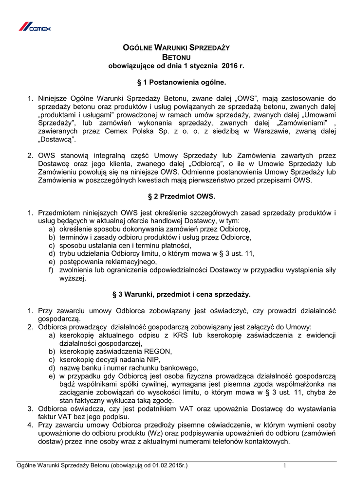 OGÓLNE WARUNKI SPRZEDAŻY BETONU obowiązujące od dnia 1 stycznia 2016 r. § 1 Postanowienia ogólne. 1. Niniejsze Ogólne Warunki Sprzedaży Betonu, zwane dalej „OWS”, mają zastosowanie do sprzedaży betonu oraz produktów i usług powiązanych ze sprzedażą betonu, zwanych dalej „produktami i usługami” prowadzonej w ramach umów sprzedaży, zwanych dalej „Umowami Sprzedaży”, lub zamówień wykonania sprzedaży, zwanych dalej „Zamówieniami” , zawieranych przez Cemex Polska Sp. z o. o. z siedzibą w Warszawie, zwaną dalej „Dostawcą”. 2. OWS stanowią integralną część Umowy Sprzedaży lub Zamówienia zawartych przez Dostawcę oraz jego klienta, zwanego dalej „Odbiorcą”, o ile w Umowie Sprzedaży lub Zamówieniu powołują się na niniejsze OWS. Odmienne postanowienia Umowy Sprzedaży lub Zamówienia w poszczególnych kwestiach mają pierwszeństwo przed przepisami OWS. § 2 Przedmiot OWS. 1. Przedmiotem niniejszych OWS jest określenie szczegółowych zasad sprzedaży produktów i usług będących w aktualnej ofercie handlowej Dostawcy, w tym: a) określenie sposobu dokonywania zamówień przez Odbiorcę, b) terminów i zasady odbioru produktów i usług przez Odbiorcę, c) sposobu ustalania cen i terminu płatności, d) trybu udzielania Odbiorcy limitu, o którym mowa w § 3 ust. 11, e) postępowania reklamacyjnego, f) zwolnienia lub ograniczenia odpowiedzialności Dostawcy w przypadku wystąpienia siły wyższej. § 3 Warunki, przedmiot i cena sprzedaży. 1. Przy zawarciu umowy Odbiorca zobowiązany jest oświadczyć, czy prowadzi działalność gospodarczą. 2. Odbiorca prowadzący działalność gospodarczą zobowiązany jest załączyć do Umowy: a) kserokopię aktualnego odpisu z KRS lub kserokopię zaświadczenia z ewidencji działalności gospodarczej, b) kserokopię zaświadczenia REGON, c) kserokopię decyzji nadania NIP, d) nazwę banku i numer rachunku bankowego, e) w przypadku gdy Odbiorcą jest osoba fizyczna prowadząca działalność gospodarczą bądź wspólnikami spółki cywilnej, wymagana jest pisemna zgoda współmałżonka na zaciąganie zobowiązań do wysokości limitu, o którym mowa w § 3 ust. 11, chyba że stan faktyczny wyklucza taką zgodę. 3. Odbiorca oświadcza, czy jest podatnikiem VAT oraz upoważnia Dostawcę do wystawiania faktur VAT bez jego podpisu. 4. Przy zawarciu umowy Odbiorca przedłoży pisemne oświadczenie, w którym wymieni osoby upoważnione do odbioru produktu (Wz) oraz podpisywania upoważnień do odbioru (zamówień dostaw) przez inne osoby wraz z aktualnymi numerami telefonów kontaktowych. Ogólne Warunki Sprzedaży Betonu (obowiązują od 01.02.2015r.) 1 5. Odbiorca będzie informował Dostawcę o każdorazowej zmianie informacji zawartych w dokumentach wymienionych w § 3 ust. 2 OWS i zobowiązuje się do niezwłocznego dostarczania zaktualizowanych dokumentów. 6. Przedmiotem sprzedaży są produkty i usługi znajdujące się aktualnie w ofercie Dostawcy, zgodne z deklarowanymi przez Dostawcę normami i przepisami prawa, w rodzaju i ilości określonej przez Odbiorcę w zamówieniu, o którym mowa w § 4 OWS, na podstawie aktualnej w dacie złożenia zamówienia, oferty Dostawcy. Za właściwy wybór gatunków produktu i wyrobów specjalnych oraz za określenie ich jakości odpowiedzialny jest wyłącznie Odbiorca. Wytrzymałość betonu określana jest po 56 dniach dojrzewania chyba, że Umowa Sprzedaży stanowi inaczej. 7. Cenami sprzedaży produktów i usług wymienionych wyraźnie w Zamówieniu lub Umowie Sprzedaży są ceny określone w cenniku Dostawcy obowiązującym w dniu przyjęcia Zamówienia przez Dostawcę lub zawarcia Umowy Sprzedaży pomniejszone ewentualnie o udzielony rabat, chyba że Umowa Sprzedaży lub Zamówienie zaakceptowane przez Dostawcę stanowi inaczej. Aktualnie obowiązujący cennik jest dostępny dla Odbiorcy w siedzibie Dostawcy oraz w zakładach produkcyjnych Dostawcy (miejscach wydawania produktu). Wszystkie produkty i usługi zrealizowane faktycznie dodatkowo przez Dostawcę na rzecz Odbiorcy nie wymienione wyraźnie w Zamówieniu lub Umowie Sprzedaży, będą naliczane zgodnie ze stawkami za te produkty i usługi określonymi w cenniku Sprzedawcy obowiązującym w dniu wydania produktu lub zrealizowania usługi. Opłaty za produkty i usługi dodatkowe wymienione w cenniku będą naliczane i wykazywane Odbiorcy przez Dostawcę odrębnie od ceny podstawowej za dostawę betonu, chyba że Dostawca oraz Odbiorca umówili się inaczej. 8. Ceny sprzedaży produktów podlegają korekcie paliwowej na zasadach określonych w cenniku lub ofercie. 9. Do każdej usługi transportu środkami transportu Dostawcy lub przez niego wynajętymi oraz środkami transportu Odbiorcy, naliczona zostanie obligatoryjna opłata środowiskowa związana z kosztami ponoszonymi na ochronę środowiska. Wartość opłaty uwzględniona jest w aktualnych cennikach obowiązujących na wytwórniach betonu towarowego. Opłata naliczana będzie jako osobna pozycja występująca na fakturze, nie podlegająca rabatom. Opłata naliczana będzie, jako stała kwota doliczana do każdego transportu/dokumentu WZ, niezależnie od ilości betonu przewiezionego na transporcie. 10. Zamówienie produktu oznacza zgodę na zakup tego produktu po cenie określonej przez Dostawcę na fakturze VAT zgodnie z postanowieniami § 3 ust. 7, 8 i 9 OWS. 11. Dostawca może określić Odbiorcy limit w określonej wysokości zwany limitem, określający łączną sumę wystawionych i nierozliczonych faktur oraz odebranego a niezafakturowanego towaru, po przekroczeniu którego Odbiorca jest zobowiązany do zapłaty należności przekraczającej przyznany limit nawet, jeżeli termin płatności wystawionych faktur nie będzie jeszcze wymagalny. Uchybienie płatności po przekroczeniu limitu lub uchybienie płatności względem określonych w umowie terminów płatności, stanowi podstawę dla Dostawcy do wstrzymania dalszych 