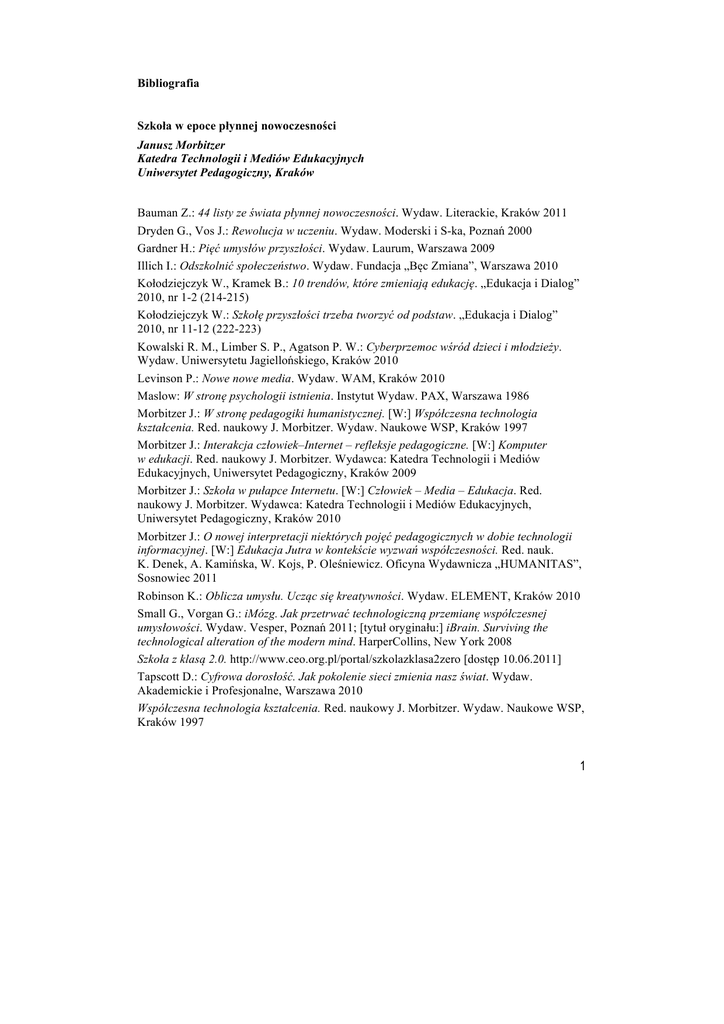 Bibliografia Szkoła w epoce płynnej nowoczesności Janusz Morbitzer Katedra Technologii i Mediów Edukacyjnych Uniwersytet Pedagogiczny, Kraków Bauman Z.: 44 listy ze świata płynnej nowoczesności. Wydaw. Literackie, Kraków 2011 Dryden G., Vos J.: Rewolucja w uczeniu. Wydaw. Moderski i S-ka, Poznań 2000 Gardner H.: Pięć umysłów przyszłości. Wydaw. Laurum, Warszawa 2009 Illich I.: Odszkolnić społeczeństwo. Wydaw. Fundacja „Bęc Zmiana”, Warszawa 2010 Kołodziejczyk W., Kramek B.: 10 trendów, które zmieniają edukację. „Edukacja i Dialog” 2010, nr 1-2 (214-215) Kołodziejczyk W.: Szkołę przyszłości trzeba tworzyć od podstaw. „Edukacja i Dialog” 2010, nr 11-12 (222-223) Kowalski R. M., Limber S. P., Agatson P. W.: Cyberprzemoc wśród dzieci i młodzieży. Wydaw. Uniwersytetu Jagiellońskiego, Kraków 2010 Levinson P.: Nowe nowe media. Wydaw. WAM, Kraków 2010 Maslow: W stronę psychologii istnienia. Instytut Wydaw. PAX, Warszawa 1986 Morbitzer J.: W stronę pedagogiki humanistycznej. [W:] Współczesna technologia kształcenia. Red. naukowy J. Morbitzer. Wydaw. Naukowe WSP, Kraków 1997 Morbitzer J.: Interakcja człowiek–Internet – refleksje pedagogiczne. [W:] Komputer w edukacji. Red. naukowy J. Morbitzer. Wydawca: Katedra Technologii i Mediów Edukacyjnych, Uniwersytet Pedagogiczny, Kraków 2009 Morbitzer J.: Szkoła w pułapce Internetu. [W:] Człowiek – Media – Edukacja. Red. naukowy J. Morbitzer. Wydawca: Katedra Technologii i Mediów Edukacyjnych, Uniwersytet Pedagogiczny, Kraków 2010 Morbitzer J.: O nowej interpretacji niektórych pojęć pedagogicznych w dobie technologii informacyjnej. [W:] Edukacja Jutra w kontekście wyzwań współczesności. Red. nauk. K. Denek, A. Kamińska, W. Kojs, P. Oleśniewicz. Oficyna Wydawnicza „HUMANITAS”, Sosnowiec 2011 Robinson K.: Oblicza umysłu. Ucząc się kreatywności. Wydaw. ELEMENT, Kraków 2010 Small G., Vorgan G.: iMózg. Jak przetrwać technologiczną przemianę współczesnej umysłowości. Wydaw. Vesper, Poznań 2011; [tytuł oryginału:] iBrain. Surviving the technological alteration of the modern mind. HarperCollins, New York 2008 Szkoła z klasą 2.0. http://www.ceo.org.pl/portal/szkolazklasa2zero [dostęp 10.06.2011] Tapscott D.: Cyfrowa dorosłość. Jak pokolenie sieci zmienia nasz świat. Wydaw. Akademickie i Profesjonalne, Warszawa 2010 Współczesna technologia kształcenia. Red. naukowy J. Morbitzer. Wydaw. Naukowe WSP, Kraków 1997 1