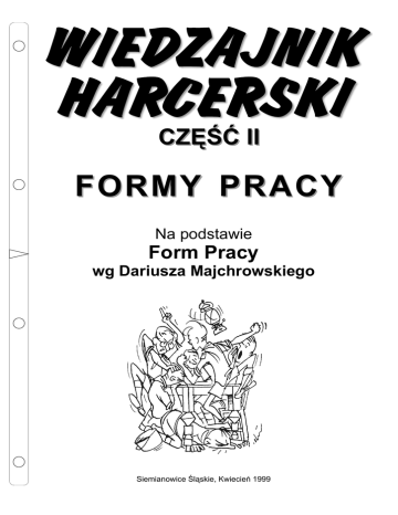 CZÊŒÆ II FORMY PRACY Na podstawie Form Pracy wg Dariusza Majchrowskiego Siemianowice Œl¹skie, Kwiecieñ 1999 Witaj szanowna druhno, witaj drogi druhu! Z ogromn¹ przyjemnoœci¹ oddajemy w Twoje rêce drugi zeszyt z serii „Wiedzajnika Harcerskiego”. Tym razem dajemy Ci spisane w bardzo zrozumia³y i przystêpny sposób Formy Pracy w dru¿ynach. Zeszyt ten powsta³ w oparciu o dane i informacje wykreowane i przekazane na jednym z kursów dru¿ynowych przez phm. Dariusza Majchrowskiego. Je¿eli masz jakieœ ciekawe uwagi lub spostrze¿enia odnoœnie spisanych tutaj Form Pracy kontaktuj siê proszê z ich autorem, od którego mo¿esz dowiedzieæ siê jeszcze wielu ciekawych rzeczy na ten temat. „Wiedzajnik” mo¿esz „nabyæ” w Komendzie Hufca ZHP w Siemianowicach Œl¹skich za jeden przeœliczny uœmiech. Ju¿ wkrótce postaramy siê aktywowaæ mo¿liwoœæ prenumeraty. Je¿eli jesteœ zainteresowany - daj nam znaæ. Z powa¿aniem Agencja Wydawnicza MarcoDRUK2000 Ju¿ wkrótce zostan¹ wydane kolejne zeszyty z tej serii. Co bêdzie w kolejnych, dowiesz siê ju¿ wkrótce. Je¿eli masz jakiekolwiek propozycje, materia³y, rady i inne im podobne ró¿noœci mo¿esz je dostarczaæ bezpoœrednio do studia Agencji Wydawniczej mieszcz¹cego siê w Siemianowicach Œl¹skich pod adresem: 41-100 Siemianowice ul.Korfantego 15a/12. Mo¿esz równie¿ kontaktowaæ siê telefonicznie pod numerem (032) 2281493. PRZYJEMNEJ I KREATYWNEJ PRACY ¯YCZY Agencja Wydawnicza MarcoDRUK2000 Wiedzajnik harcerski, czêœæ 2, Formy pracy, strona 0/4 SPECYFIKACJA FORM PRACY Akcje spo³eczne S¹ to archaiczne okreœlenia do dnia dzisiej szego jednak podejmowane. S¹ to akcje, które robimy dla œrodowiska, czyli dla dzieci z podwórka, dla mam, nauczycieli, em erytów. Zwiady rodzajowe Terenoznawczy, historyczny, turystyczny, folkl orystyczny, komunikacyjny, et nograficzny, gospodarczy, przyrodniczy, obserwacja, wywiad, wycieczka, zadani e miêdzy zbiórkowe, badanie domu. Zawsze powinno byæ podsumowanie. Zajêcia techniczne (majsterki) Zwi¹zane z przetwarzanymi lub wytwarzanymi przedmiotam i. Zajêcia sportowe Wyœcigi czyli tor przeszkód. Tu wchodzi ogrom zajêæ maj ¹cych na celu rozwiniêcie kultury f izycznej. S¹ to krótkie zaj êcia sportowe na zbiórce, poprzez turnieje a na olimpiadach skoñczywszy. Wycieczki dru¿yny Trzy etapy: - przygotowania: opiekun, noclegi , kosztorys, ubezpieczenie, pozwolenia od rodzi ców, program, uczestnicy, sprzêt; - realizacja programu; - podsumowanie. Biwaki dru¿yny Trzy etapy: - przygotowania: opiekun, noclegi , kosztorys, ubezpieczenie, pozwolenia od rodzi ców, program, uczestnicy, sprzêt; - realizacja programu; - podsumowanie. Gry terenowe Tu wchodz¹ wszelkie gry ze scenariuszem lub bez przeprowadzane na powietrzu - general ne zasady: - gra musi byæ dopasowana do terenu; - gra musi byæ dostosowana do wieku uczestników; - zasady gry musz¹ byæ zwiêz³e, wystarczaj¹co jasne i zrozum ia³e. Biegi harcerskie Tak¿e gra terenowa po jakimœ czasie szkolenia lub czasookresie w celu podsumowania i sprawdzenia wiadomoœci nabytych przez harcerzy. Konkursy, Quizy, Testy, Krzy¿ówki Konkursy mog¹ byæ plastyczne, muzyczne i inne, prawie w ka¿dym temacie. W a¿ne jest podsumowanie. Zabawy towarzyskie Planszowe czyli potocznie zwane œwietlicowymi . Nale¿y odpowiednio dostosowaæ do wieku uczestni ków i przestrzegaæ regulaminów gry. Ogniska, Kominki Dla wszystkich jasne. Musimy przygotowaæ miejsce na ognisko i je u³o¿yæ lub przygotowaæ siê do kominka. Konieczna jest osoba prowadz¹ca ca³oœæ i dobranie tem atu dla wszystkich. Obrzêdowoœæ te¿ jest wa¿na rozbudowaæ. Zabawy i gry w izbie harcerskiej Pod tym tem atem s¹ wszelkie gry i zabawy w izbie harcerskiej j akie znamy i stosujemy na co dzieñ. Wiedzajnik harcerski, czêœæ 2, Formy pracy, strona 1/4 SPECYFIKACJA FORM PRACY Potañcówki Forma, w której mo¿emy naszych harcerzy nauczyæ tañczyæ a to na pewno im siê w ¿yciu przyda. Poza tym m³odzie¿ potrzebuje p³aszczyzny, na której mog¹ siê spotkaæ na l uzie. Mo¿e to byæ np. szkó³ka tañca. Wieczornice Wieczór literacki - m³odym ludziom takie coœ te¿ jest potrzebne. Ni e zapomnij dobraæ odpowiednio poezjê. Mo¿e to byæ wieczór z muzyk¹. Najlepiej w³¹czyæ w to harcerzy. Samemu staraæ siê tyl ko ukierunkowaæ imprezê. Ktoœ musi prowadziæ t aki wieczór. Przed imprez¹ musicie przygotowaæ odpowiedni wystrój i wytworzyæ odpowiedni nastrój . Os¹dy nad bohaterem Ogl¹damy f ilm lub byliœmy w teatrze lub czymœ takim. Mo¿e to byæ osoba nam znana. Mo¿e to byæ nawet s¹d nad harcerzem, który niegodnie siê zachowa³. Musi byæ obroñca, adwokat i prawdzi wy s¹d: harcerze s¹ przysiêg³ymi. Mo¿emy dru¿ynê podzieliæ na pó³ i zaczynamy s¹dziæ. Burza mózgów Ma na celu znalezienie sposobu na wyjœcie z opresji, znal ezieniu odpowiedzi na pyt anie, wymyœlenie czegoœ w grupie. Proste do zrealizowania - rzucamy temat i ka¿dy kto chce m ówi o tym co uwa¿a za wa¿ne w temacie. Film Ogl¹danie filmu. Trzeba przygotowaæ jakiœ wartoœciowy fil m i stworzyæ dogodne warunki do j ego ogl¹dania. Ogl¹damy go z kul tur¹ widza. Po fi lmie m o¿emy podyskutowaæ. Festiwal Mo¿e byæ kultury, muzyki, film u itp. Ma byæ m o¿liwoœci¹ pokazania dorobku „kulturalnego l ub innego”. Jest form¹ dosyæ trudn¹. Trzeba zrobiæ dekoracje, stworzyæ mo¿liwoœæ do zaprezentowania swoich dzie³. Wybraæ osobê prowadz¹c¹, przygotowaæ przerywniki i zrobiæ podsumowanie z pochwa³ami lub nagrodami. Gazetka, Audycja Rodzaj dziennikarstwa. Harcerze bawi¹ siê w dziennikarzy. Pi sz¹ artyku³ o tym co jest dla nich wa¿ne i o tym co chcieli by by³o w pracy. Trzeba znaleŸæ redaktora naczelnego, który to wyda i zrobi z tego odpowiedni materia³. Przy lepszym sprzêcie technicznym mo¿e zam iast gazety byæ audycj a lub fil m. Spotkanie z ciekawym cz³owiekiem Najpierw trzeba siê zastanowiæ kim by mi
