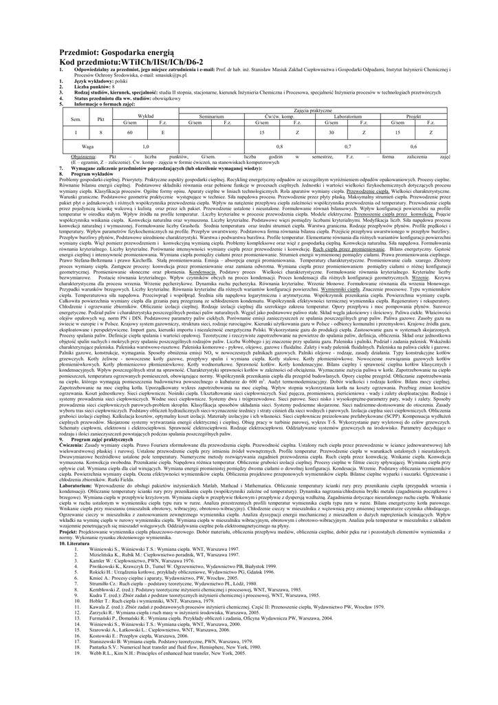 Przedmiot: Gospodarka energią Kod przedmiotu:WTiICh/IISt/ICh/D6-2