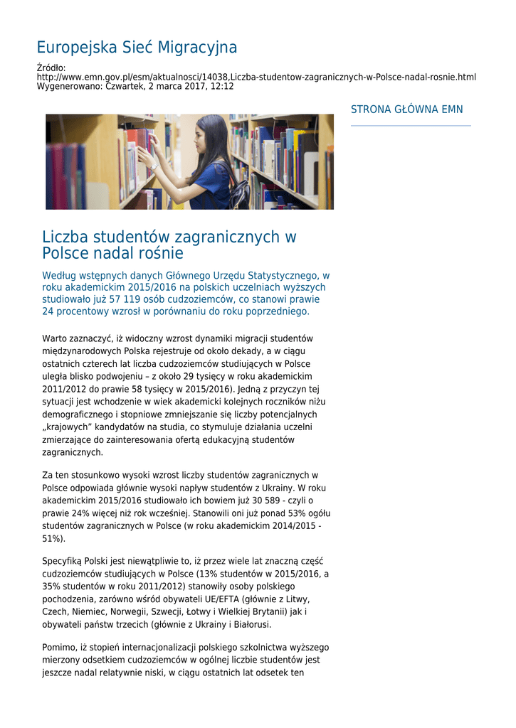 Europejska Sieć Migracyjna Źródło: http://www.emn.gov.pl/esm/aktualnosci/14038,Liczba-studentow-zagranicznych-w-Polsce-nadal-rosnie.html Wygenerowano: Czwartek, 2 marca 2017, 12:12 STRONA GŁÓWNA EMN Liczba studentów zagranicznych w Polsce nadal rośnie Według wstępnych danych Głównego Urzędu Statystycznego, w roku akademickim 2015/2016 na polskich uczelniach wyższych studiowało już 57 119 osób cudzoziemców, co stanowi prawie 24 procentowy wzrosł w porównaniu do roku poprzedniego. Warto zaznaczyć, iż widoczny wzrost dynamiki migracji studentów międzynarodowych Polska rejestruje od około dekady, a w ciągu ostatnich czterech lat liczba cudzoziemców studiujących w Polsce uległa blisko podwojeniu – z około 29 tysięcy w roku akademickim 2011/2012 do prawie 58 tysięcy w 2015/2016). Jedną z przyczyn tej sytuacji jest wchodzenie w wiek akademicki kolejnych roczników niżu demograficznego i stopniowe zmniejszanie się liczby potencjalnych „krajowych” kandydatów na studia, co stymuluje działania uczelni zmierzające do zainteresowania ofertą edukacyjną studentów zagranicznych. Za ten stosunkowo wysoki wzrost liczby studentów zagranicznych w Polsce odpowiada głównie wysoki napływ studentów z Ukrainy. W roku akademickim 2015/2016 studiowało ich bowiem już 30 589 - czyli o prawie 24% więcej niż rok wcześniej. Stanowili oni już ponad 53% ogółu studentów zagranicznych w Polsce (w roku akademickim 2014/2015 51%). Specyfiką Polski jest niewątpliwie to, iż przez wiele lat znaczną część cudzoziemców studiujących w Polsce (13% studentów w 2015/2016, a 35% studentów w roku 2011/2012) stanowiły osoby polskiego pochodzenia, zarówno wśród obywateli UE/EFTA (głównie z Litwy, Czech, Niemiec, Norwegii, Szwecji, Łotwy i Wielkiej Brytanii) jak i obywateli państw trzecich (głównie z Ukrainy i Białorusi. Pomimo, iż stopień internacjonalizacji polskiego szkolnictwa wyższego mierzony odsetkiem cudzoziemców w ogólnej liczbie studentów jest jeszcze nadal relatywnie niski, w ciągu ostatnich lat odsetek ten znacznie wzrósł (w roku akademickim 2015/2016 wyniósł aż ok. 4% podczas, gdy osiem lat temu było to zaledwie 0,6%). Dokładne dane są dostępne na stronie GUS.