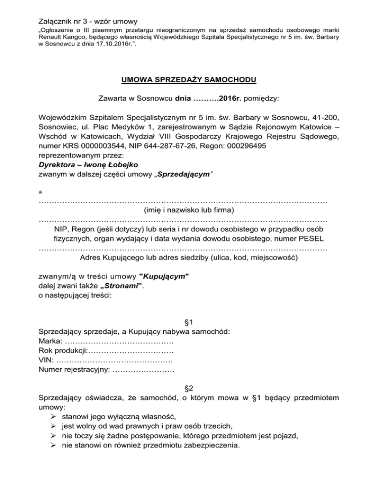 Załącznik nr 3 - wzór umowy „Ogłoszenie o III pisemnym przetargu nieograniczonym na sprzedaż samochodu osobowego marki Renault Kangoo, będącego własnością Wojewódzkiego Szpitala Specjalistycznego nr 5 im. św. Barbary w Sosnowcu z dnia 17.10.2016r.”. UMOWA SPRZEDAŻY SAMOCHODU Zawarta w Sosnowcu dnia ……….2016r. pomiędzy: Wojewódzkim Szpitalem Specjalistycznym nr 5 im. św. Barbary w Sosnowcu, 41-200, Sosnowiec, ul. Plac Medyków 1, zarejestrowanym w Sądzie Rejonowym Katowice – Wschód w Katowicach, Wydział VIII Gospodarczy Krajowego Rejestru Sądowego, numer KRS 0000003544, NIP 644-287-67-26, Regon: 000296495 reprezentowanym przez: Dyrektora – Iwonę Łobejko zwanym w dalszej części umowy „Sprzedającym” a ………………………………………………………………………………………………… (imię i nazwisko lub firma) ………………………………………………………………………………………………… NIP, Regon (jeśli dotyczy) lub seria i nr dowodu osobistego w przypadku osób fizycznych, organ wydający i data wydania dowodu osobistego, numer PESEL ………………………………………………………………………………………………… Adres Kupującego lub adres siedziby (ulica, kod, miejscowość) zwanym/ą w treści umowy "Kupującym" dalej zwani także „Stronami”. o następującej treści: §1 Sprzedający sprzedaje, a Kupujący nabywa samochód: Marka: …………………………………… Rok produkcji:…………………………… VIN: ……………………………………… Numer rejestracyjny: …………………… §2 Sprzedający oświadcza, że samochód, o którym mowa w §1 będący przedmiotem umowy: stanowi jego wyłączną własność, jest wolny od wad prawnych i praw osób trzecich, nie toczy się żadne postępowanie, którego przedmiotem jest pojazd, nie stanowi on również przedmiotu zabezpieczenia. 1. 2. 3. 4. 5. §3 Kupujący oświadcza, że kupuje od Sprzedającego opisany w §1 pojazd płacąc Sprzedającemu za przedmiot umowy należność w kwocie ……………………………….….. zł brutto (zwolnione z VAT) (słownie: ……………………………………….………………………………… złotych), Należność za przedmiot umowy należy wpłacić na rachunek bankowy Sprzedającego nr: PKO BP 50 1020 2498 0000 8102 0433 8091 w terminie do 3 dni roboczych od dnia zawarcia umowy. Na poczet ceny nabycia zaliczono wpłacone wadium w kwocie = 1 000,00 zł brutto (słownie: tysiąc złotych). Tytułem ceny do zapłaty pozostało ……………. zł brutto (słownie: ……………………………………….………………………………… złotych), Wszelkie podatki i inne opłaty związane z niniejszą umową ponosi Kupujący. §4 1. Samochód będący przedmiotem przetargu zostanie wydany Nabywcy wraz z protokołem zdawczo – odbiorczym danego samochodu w terminie 3 dni roboczych liczonych od dnia zapłaty całości zaoferowanej ceny nabycia, o której mowa w § 3 niniejszej umowy. 2. Kupujący wraz z podpisaniem protokołu odbioru przedmiotu umowy kwituje odbiór samochodu będącego przedmiotem umowy. 1 . Sprzedawca wraz z podpisaniem protokołu odbioru przedmiotu umowy wyda Kupującemu wszystkie posiadane dokumenty dotyczące pojazdu niezbędne do prawidłowego korzystania z pojazdu, a w szczególności: Dowód rejestracyjny samochodu, Kartę Pojazdu, Komplet kluczy do samochodu, Aktualne ubezpieczenie OC. §5 1. Sprzedający przenosi na Kupującego własność pojazdu określonego w § 1 niniejszej umowy. 2. Kupujący oświadcza, że stan techniczny pojazdu jest mu znany i z tego tytułu nie będzie rościł żadnych pretensji do Sprzedającego. Strony wyłączają odpowiedzialność Sprzedającego z tytułu rękojmi i gwarancji. 3. Kupujący oświadcza, że sprawdził oznaczenia numerowe pojazdu i dowodu rejestracyjnego i nie wnosi do nich zastrzeżeń. §6 Integralną cześć niniejszej umowy stanowi ogłoszenie o przetargu oraz oferta złożona przez Kupującego wraz oświadczeniem. §7 W sprawach nieuregulowanych niniejszą umową zastosowanie mają przepisy Kodeksu cywilnego. §8 Spory, jakie mogą wyniknąć w związku z niniejszą umową podlegać będą rozstrzygnięciu przez Sąd właściwy dla siedziby Sprzedającego. §9 Umowę sporządzono w dwóch jednobrzmiących egzemplarzach po jednym dla każdej ze stron. SPRZEDAJĄCY …............................................. KUPUJĄCY …................................................
