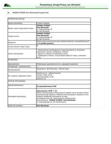 Powiatowy Urząd Pracy we Wrześni http://pupwrzesnia.pl/aktualnosc/306/visage-studio-ewa-banaszak-fryzjer-staż VISAGE STUDIO Ewa Banaszak/Fryzjer/staż INFORMACJE OGÓLNE Nazwa stanowiska: Fryzjer/ fryzjerka Nazwa i adres organizatora stażu: VISAGE STUDIO Ewa Banaszak ul. Stasiewskiego 32 62-330 Września Miejsce pracy: VISAGE STUDIO Ewa Banaszak ul. Stasiewskiego 32 62-300 Września Kategoria: Oferta stażu przeznaczona dla osób bezrobotnych zakwalifikowanych do II profilu pomocy Liczba wolnych miejsc stażu: Zakres obowiązków: 1 • Wykonywanie standardowych usług fryzjerskich tj. strzyżenie, koloryzacja, upięcia, pielęgnacja włosów, • Dbanie o czystość na stanowisku pracy, • Zabieganie o klienta i utrzymywanie dobrych relacji z klientami firmy WYMAGANIA Wykształcenie: Preferowane wykształcenie min. zawodowe fryzjerskie Umiejętności i doświadczenie: ----- Wynagrodzenie: Dni i godziny odbywania stażu: Stypendium 997,40 brutto / 851,63 netto System pracy – jednozmianowy wtorek- środa 10-18 czwartek-piątek 12-20 sobota 8-14 SPOSÓB APLIKOWANIA Sposób aplikowania: Za pośrednictwem PUP Wymagane dokumenty: skierowanie z PUP + CV Osoby zainteresowane ofertą powinny zgłosić się do doradcy klienta (wyznaczonego zgodnie z alfabetycznym podziałem nazwisk) w celu wydania wstępnego skierowania na staż, a następnie udać się z dokumentami aplikacyjnymi do pracodawcy VISAGE STUDIO Ewa Banaszak ul. Stasiewskiego 32, 62-330 Września Osoba do kontaktu: Ewa Banaszak