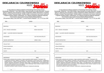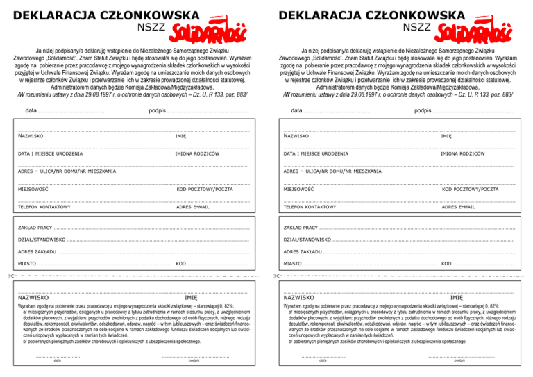 DEKLARACJA CZŁONKOWSKA DEKLARACJA CZŁONKOWSKA Ja niżej podpisany/a deklaruję wstąpienie do Niezależnego Samorządnego Związku Zawodowego „Solidarność”. Znam Statut Związku i będę stosował/a się do jego postanowień. Wyrażam zgodę na pobieranie przez pracodawcę z mojego wynagrodzenia składek członkowskich w wysokości przyjętej w Uchwale Finansowej Związku. Wyrażam zgodę na umieszczanie moich danych osobowych w rejestrze członków Związku i przetwarzanie ich w zakresie prowadzonej działalności statutowej. Administratorem danych będzie Komisja Zakładowa/Międzyzakładowa. /W rozumieniu ustawy z dnia 29.08.1997 r. o ochronie danych osobowych – Dz. U. R 133, poz. 883/ Ja niżej podpisany/a deklaruję wstąpienie do Niezależnego Samorządnego Związku Zawodowego „Solidarność”. Znam Statut Związku i będę stosował/a się do jego postanowień. Wyrażam zgodę na pobieranie przez pracodawcę z mojego wynagrodzenia składek członkowskich w wysokości przyjętej w Uchwale Finansowej Związku. Wyrażam zgodę na umieszczanie moich danych osobowych w rejestrze członków Związku i przetwarzanie ich w zakresie prowadzonej działalności statutowej. Administratorem danych będzie Komisja Zakładowa/Międzyzakładowa. /W rozumieniu ustawy z dnia 29.08.1997 r. o ochronie danych osobowych – Dz. U. R 133, poz. 883/ NSZZ data........................................... NSZZ podpis.................................................... data........................................... ........................................................................................................................................................................ NAZWISKO podpis.................................................... ........................................................................................................................................................................ NAZWISKO IMIĘ IMIĘ ........................................................................................................................................................................ ........................................................................................................................................................................ DATA I MIEJSCE URODZENIA DATA I MIEJSCE URODZENIA IMIONA RODZICÓW IMIONA RODZICÓW ....................................................................................................................................................................... ....................................................................................................................................................................... ADRES ADRES – ULICA/NR DOMU/NR MIESZKANIA – ULICA/NR DOMU/NR MIESZKANIA ........................................................................................................................................................................ ........................................................................................................................................................................ MIEJSOWOŚĆ MIEJSOWOŚĆ KOD POCZTOWY/POCZTA KOD POCZTOWY/POCZTA ........................................................................................................................................................................ ........................................................................................................................................................................ TELEFON KONTAKTOWY TELEFON KONTAKTOWY ADRES E-MAIL ADRES E-MAIL ZAKŁAD PRACY .............................................................................................................................................. ZAKŁAD PRACY .............................................................................................................................................. DZIAŁ/STANOWISKO .................................................................................................................................... DZIAŁ/STANOWISKO .................................................................................................................................... ADRES ZAKŁADU ........................................................................................................................................... ADRES ZAKŁADU ........................................................................................................................................... MIASTO ................................................................................................. KOD ............................................ MIASTO ................................................................................................. KOD ............................................ " " ....................................................................................................................................................................... ....................................................................................................................................................................... Wyrażam zgodę na pobieranie przez pracodawcę z mojego wynagrodzenia składki związkowej – stanowiącej 0, 82%: a/ miesięcznych przychodów, osiąganych u pracodawcy z tytułu zatrudnienia w ramach stosunku pracy, z uwzględnieniem dodatków płacowych, z wyjątkiem: przychodów zwolnionych z podatku dochodowego od osób fizycznych, różnego rodzaju deputatów, rekompensat, ekwiwalentów, odszkodowań, odpraw, nagród – w tym jubileuszowych – oraz świadczeń finansowanych ze środków przeznaczonych na cele socjalne w ramach zakładowego funduszu świadczeń socjalnych lub świadczeń urlopowych wypłacanych w zamian tych świadczeń. b/ pobieranych pieniężnych zasiłków chorobowych i opiekuńczych z ubezpieczenia społecznego. Wyrażam zgodę na pobieranie przez pracodawcę z mojego wynagrodzenia sk