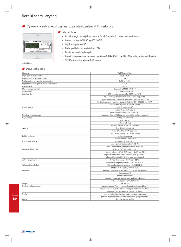 Liczniki energii czynnej w Cyfrowy licznik energii czynnej z zatwierdzeniem MID, seria DIZ w Schrack Info • Licznik energii czynnej do pomiaru w 1- lub 2-taryfie do celów rozliczeniowych • Montaż na szynie TH 35 wg IEC 60715 • Wyjście impulsowe S0 • Duży, podświetlany wyświetlacz LCD • Pomiar wartości chwilowych • Legalizacja pierwotna zgodna z dyrektywą 2014/32/EU (M I D = Measuring Instrument Directive) • Wyjśćie komunikacyjne M-BUS - opcja MGDIZ080 w Dane techniczne Napięcie: Prąd - pomiar bezpośredni: Prąd - pomiar przez przekładniki: Prąd znamionowy - pomiar bezpośredni: Prąd znamionowy - pomiar przez przekładniki: Częstotliwość: Klasa (energia czynna): Typ momiaru: Stała licznika: Pomiar energii: Przechowywanie dancyh Wyświetlacz: Wyjście: Źródło zasilania: Pobór mocy na fazę: Kompatybilność EMC: Zakres temperatury: Wilgotność względna: Obudowa: Waga: Przekrój podłączeniowy: Strona 684 Cechy: Opcje: 3x230/400V AC 0,25 - 80A 5A 0,25 - 5 (80)A 5 (6)A 50 Hz B zgodnie z EN 50470-1, -3 P+ (z blokadą wsteczną) LED - pomiar bezpośredni: 1000 Imp./kWh LED - pomiar przez przekładniki: 100-1000 Imp./kWh Wyjście impulsowe - pomiar bezpośredni: 10 - 1000 Imp./kWh Wyjście impulsowe - pomiar przez przekładniki: 100 - 100000 Imp./kWh czas trwania impulsu: 30, 50 lub 100ms maks. 2 taryfy (opcja) wejście sterujące: 1 (opcja) przełączanie taryf (opcja): 230V / AC w pamięci Flash / EEPROM, co najmniej 20 lat (bez napięcia) LCD z podświetleniem ilość cyfr: 8 zakres: 4,4 - 8,0 wielkość cyfr: ok. 6,8 x 3,4 (wxs) mm 1 wyjście impulsowe S0 maks. 27V/DC, 27mA (pasywne) czas trwania impulsu: 30, 50 lub 100ms zasilacz impulsowy 3-fazowe napięcie pomiarowe napięcie: < 2 VA / < 1 W prąd - pomiar bezpośredni: < 2,5 VA prąd - podłączenie przez przekładnik: < 0,5 VA izolacja: 4kV AC, 50Hz, 1min napięcie udarowe EMC: 4kV, impuls 1,2/50 μs, 2 Ω napięcie udarowe ISO: 6kV, impuls 1,2/50 μs, 500 Ω odporność na pole HF: 10 V/m (pod obciążeniem) temperatura pracy: - 25°C do + 55°C temperatura magazynowania: - 40°C do + 70°C 95%, bez kondensacji, zgodnie z IEC 62052-11, EN 50470-1 oraz IEC 60068-2-30 wymiary: 6 modułów = 107,5 x 89,5 x 64,0 (s x w x g) mm klasa ochrony: II stopień ochrony: IP20 materiał: poliwęglan wzmacniany włóknem szklanym trudnopalny zgodnie z IEC 62052-11 ok. 450 g zaciski prądowe / tor N - pomiar bezpośredni: maks. 25mm2 zaciski prądowe / tor N - pomiar przez przekładniki: maks. 4mm2 napięcie-/ zaciski pomocnicze: maks. 2,5mm2 pomiar wartości chwilowych: mocy, napięcia oraz pradu przycisk do podświetlenia, wartości chwilowe i programowanie 2-taryfy, wyjście M-Bus Liczniki energii czynnej w Cyfrowy licznik energii czynnej z zatwierdzeniem MID, seria DIZ w Wymiary Strona 685 Liczniki energii czynnej w Cyfrowy licznik energii czynnej z zatwierdzeniem MID, seria DIZ w MGDIZ - schemat połączeń Strona 686 Liczniki energii czynnej w Cyfrowy licznik energii czynnej z zatwierdzeniem MID, seria DIZ OPIS DOSTĘPNOŚĆ STORE NR KAT. Wyjście impulsowe S0 3X230/400 80A, wyj. impuslowe, 1 taryfa, MID MGDIZ080P 3X230/400 80A, wyj. impuslowe, 2 taryfy, MID MGDIZ080PZ 3X230/400 5(6)/1A, wyj. impuslowe, 1 taryfa, MID MGDIZ006P 3X230/400 6/1A, wyj. impuslowe, 2 taryfy, MID MGDIZ006PZ 3X230/400 80A, wyj. impuslowe, 2 taryfy, MID MGDIZ080-Z Wyjście M-BUS 3X230/400 80A, wyj. impuslowe, 1 taryfa, MID MGDIZ380P 3X230/400 80A, wyj. impuslowe, 2 taryfy, MID MGDIZ380PZ 3X230/400 6/1A, wyj. impuslowe, 1 taryfa, MID MGDIZ306P 3X230/400 6/1A, wyj. impuslowe, 2 taryfy, MID MGDIZ306PZ 3X230/400 80A, wyj. impuslowe, 1 taryfa, MID MGDIZ380 3X230/400 6/1A, wyj. impuslowe, 1 taryfa, MID MGDIZ306 w Liczniki energii czynnej serii PPMGD OPIS DOSTĘPNOŚĆ STORE NR KAT. Licznik DIZ 3x230/400V, 5/1A, S0, P/Q PPMGDFQ005 Licznik DIZ 3x230/400V, 5/1A, M-BUS, P/Q PPMGDFQ305 Licznik DIZ 3x230/400V, 5(80)A, MOD-BUS PPMGDF0480 Licznik DIZ 3x230/400V, 5/1A, MOD-BUS PPMGDF0405 Licznik DIZ 3x230/400V, 5/1A, SO, P/Q, 2T PPMGDFQ025 Licznik DIZ 3x230/400V, 5/1A, M-BUS, P+/-, 2T PPMGDFQ325 Koncentrator 16 wejść S0, wyście Ethernet PPEIKO16ET Kabel do parametryzacji M-BUS do liczników EIZ/DIZ/KIZ PPEIZPW1 Licznik energii czynnej DVH 3X230/400 100A, S0, 2T PPMGDVH516 PONAD 20 TYSIĘCY PRODUKTÓW W KIESZENI P O BIE R Z A P L I K A CJĘ „SCH RA CK L I VE ” NA I P H O NE L UB A ND R OIDA. M O BIL N E NA RZĘ D ZI E E L E K TRO I NSTA L A TO RA . Ȋ Ȋ Ȋ Ȋ Pełny asortyment sklepu internetowego Schrack Technik Dostęp do dokumentacji produktów z każdego miejsca Najszybsze zamówienia na miejsce budowy Prosta i szybka wyszukiwarka produktów Strona 687 – produkt dostępny z Centrum Logistycznego w Warszawie – produkt dostępny w SCHRACK STORE – produkt dostępny z Centrum Dystrybucyjnego w Guntramsdorf BRAK IKONKI – produkt na zamówienie (warunki realizacji wg uzgodnień z Działem Sprzedaży)