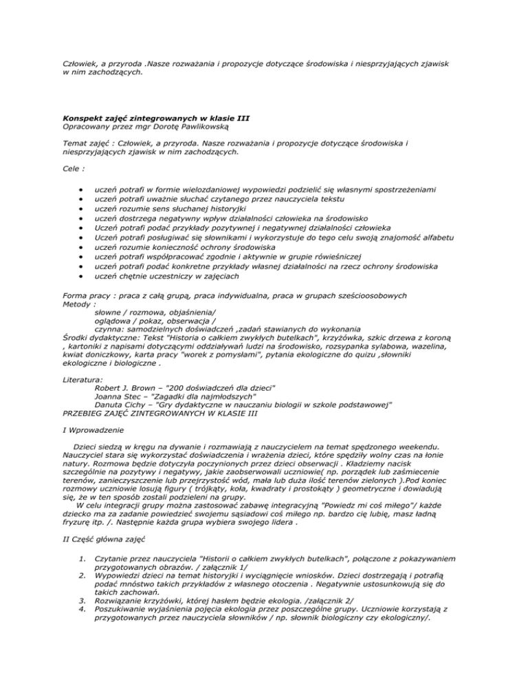 Człowiek, a przyroda .Nasze rozważania i propozycje dotyczące środowiska i niesprzyjających zjawisk w nim zachodzących. Konspekt zajęć zintegrowanych w klasie III Opracowany przez mgr Dorotę Pawlikowską Temat zajęć : Człowiek, a przyroda. Nasze rozważania i propozycje dotyczące środowiska i niesprzyjających zjawisk w nim zachodzących. Cele : • • • • • • • • • • uczeń potrafi w formie wielozdaniowej wypowiedzi podzielić się własnymi spostrzeżeniami uczeń potrafi uważnie słuchać czytanego przez nauczyciela tekstu uczeń rozumie sens słuchanej historyjki uczeń dostrzega negatywny wpływ działalności człowieka na środowisko Uczeń potrafi podać przykłady pozytywnej i negatywnej działalności człowieka Uczeń potrafi posługiwać się słownikami i wykorzystuje do tego celu swoją znajomość alfabetu uczeń rozumie konieczność ochrony środowiska uczeń potrafi współpracować zgodnie i aktywnie w grupie rówieśniczej uczeń potrafi podać konkretne przykłady własnej działalności na rzecz ochrony środowiska uczeń chętnie uczestniczy w zajęciach Forma pracy : praca z całą grupą, praca indywidualna, praca w grupach sześcioosobowych Metody : słowne / rozmowa, objaśnienia/ oglądowa / pokaz, obserwacja / czynna: samodzielnych doświadczeń ,zadań stawianych do wykonania Środki dydaktyczne: Tekst "Historia o całkiem zwykłych butelkach", krzyżówka, szkic drzewa z koroną , kartoniki z napisami dotyczącymi oddziaływań ludzi na środowisko, rozsypanka sylabowa, wazelina, kwiat doniczkowy, karta pracy "worek z pomysłami", pytania ekologiczne do quizu ,słowniki ekologiczne i biologiczne . Literatura: Robert J. Brown – "200 doświadczeń dla dzieci" Joanna Stec – "Zagadki dla najmłodszych" Danuta Cichy – "Gry dydaktyczne w nauczaniu biologii w szkole podstawowej" PRZEBIEG ZAJĘĆ ZINTEGROWANYCH W KLASIE III I Wprowadzenie Dzieci siedzą w kręgu na dywanie i rozmawiają z nauczycielem na temat spędzonego weekendu. Nauczyciel stara się wykorzystać doświadczenia i wrażenia dzieci, które spędziły wolny czas na łonie natury. Rozmowa będzie dotyczyła poczynionych przez dzieci obserwacji . Kładziemy nacisk szczególnie na pozytywy i negatywy, jakie zaobserwowali uczniowie( np. porządek lub zaśmiecenie terenów, zanieczyszczenie lub przejrzystość wód, mała lub duża ilość terenów zielonych ).Pod koniec rozmowy uczniowie losują figury ( trójkąty, koła, kwadraty i prostokąty ) geometryczne i dowiadują się, że w ten sposób zostali podzieleni na grupy. W celu integracji grupy można zastosować zabawę integracyjną "Powiedz mi coś miłego"/ każde dziecko ma za zadanie powiedzieć swojemu sąsiadowi coś miłego np. bardzo cię lubię, masz ładną fryzurę itp. /. Następnie każda grupa wybiera swojego lidera . II Część główna zajęć 1. 2. 3. 4. Czytanie przez nauczyciela "Historii o całkiem zwykłych butelkach", połączone z pokazywaniem przygotowanych obrazów. / załącznik 1/ Wypowiedzi dzieci na temat historyjki i wyciągnięcie wniosków. Dzieci dostrzegają i potrafią podać mnóstwo takich przykładów z własnego otoczenia . Negatywnie ustosunkowują się do takich zachowań. Rozwiązanie krzyżówki, której hasłem będzie ekologia. /załącznik 2/ Poszukiwanie wyjaśnienia pojęcia ekologia przez poszczególne grupy. Uczniowie korzystają z przygotowanych przez nauczyciela słowników / np. słownik biologiczny czy ekologiczny/. 5. 6. 7. 8. 9. 10. 11. 12. 13. 14. Odczytanie przez lidera grupy przygotowanych wyjaśnień i wskazanie na konieczność istnienia takiej nauki. Losowanie przez liderów grup pytania./ załącznik 3 / Czego przyroda potrzebuje do życia ? Co utrudnia przyrodzie życie ? Wyklejanie korony drzew kartonikami zgodnymi z wylosowanym przez lidera pytaniem. Uporządkowanie przez każdego ucznia rozsypanki sylabowej od największego wyniku do najmniejszego. Kontrola wykonanych prac./ załącznik 4/ Zbiorowe wykonanie doświadczenia "Jak rośliny pobierają dwutlenek węgla"/ załącznik 5/ Co mogę zrobić dla ochrony przyrody? Każdy uczeń otrzymuje kartę pracy na której znajduje się worek z pomysłami . Wpisuje do niego swoje propozycje służące ochronie przyrody. Omówienie przygotowanej przez nauczyciela propozycji : przyczyna – skutek ; pokaz na foliogramie. Wyciągnięcie wniosku. Zapisanie własnego pomysłu i wyciągnięcie wniosku. Analiza pomysłów każdej grupy. Nauka piosenki "Ekologiczny świat"./ śpiewamy 3 razy ,coraz szybciej za każdym razem/ Ekologiczny świat, bez trujących śmieci Może dodać lat dzieciom naszych dzieci Podsumowanie zajęć . o Czy dzieci mogą przyczynić się do ochrony otaczającego środowiska ? o Czy w naszym mieście istnieje konieczność rozwiązywania problemów związanych z ochroną środowiska ? III Zakończenie Uczniowie uczestniczą w mini quizie ekologicznym./załącznik 6/ Załącznik 1 Każdy z was zna pewnie bajkę O pięciu grochu ziarenkach. Ja wam opowiem historię O całkiem zwykłych butelkach. Pełne słodkiego napoju były te butle z plastiku, Lecz szybko je opróżniono podczas szkolnego pikniku. Nie warto było zabierać tych pustych naczyń do domu. Zostały w lasku przy rzece już niepotrzebne nikomu. Pierwsza , rzucona pod krzaczek, przygniotła młode rośliny. W tym miejscu już nie wyrosną ni trawy, ni koniczyny. Druga , leżąca przy ścieżce, od dna po korek pęknięta, Bardzo poważnie zraniła biegnące tedy zwierzęta. Butelki; trzecia i czwarta też czynią ogromną szkodę Rzucone w piach i w nurt rzeki zatrują glebę i wodę. Na temat piątej spalonej- zdanie mam wcale nie lepsze. Szkodliwe gazy , dym, sadzę zmieszała z czystym powietrzem. Ja wprost nie umiem wyrazić ,jak mnie oburza to wszystko! Pięć plastikowych butelek zatruło nam środowisko ! Bo któż zanieczyścił rzekę, zniszczył przyrodę , naśmiecił ?! Mówicie , że nie butelki ? Więc kt