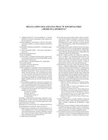 REGULAMIN OG£ASZANIA PRAC W KWARTALNIKU MEDICINA SPORTIVA 1. Medicina Sportiva jest kwartalnikiem, w którym publikowane s¹ prace obejmuj¹ce ró¿ne aspekty medycyny sportowej: a) prace pogl¹dowe, zamawiane u autorów, lub wyg³oszone jako wyk³ady w ramach sympozjów Medicina Sportiva, b) przedruki wybranych artyku³ów z czasopism zagranicznych, c) prace oryginalne (jedna dwie prace oryginalne w numerze), d) obserwacje kazuistyczne, e) listy do Redakcji, f) streszczenia z czasopism zagranicznych i sprawozdania ze zjazdów naukowych, posiedzeñ PTMS i innych towarzystw medycznych, g) komunikaty o zjazdach naukowych, sympozjach, h) recenzje ksi¹¿ek, i) felietony na tematy medyczne, j) artyku³y sponsorowane. 2. Prace pogl¹dowe, oryginalne i obserwacje kazuistyczne, podlegaj¹ recenzji przez dwóch wybranych przez Redakcjê recenzentów. Nasz¹ zasad¹ jest nie ujawnianie nazwisk autorów prac wysy³anych do recenzji. Nie ujawniamy tak¿e nazwisk recenzentów autorom prac. Autorzy prac powinni zaznaczyæ w pimie przewodnim do Redakcji, ¿e nades³ana praca nie by³a nigdzie publikowana, ani nie jest wys³ana do innej Redakcji. 3. W przypadku przedruków, t³umaczeñ z jêzyków obcych oraz artyku³ów sponsorowanych Redakcja nie bierze odpowiedzialnoci za treæ naukow¹ tekstów. 4. Prace nale¿y przesy³aæ w trzech jednobrzmi¹cych egzemplarzach maszynopisu (30 wierszy na stronie, margines 4 cm) na adres: Dr Zbigniew Szygu³a Medicina Sportiva Ul. Wo³odyjowskiego 16 31-980 Kraków Dyskietkê z elektroniczn¹ form¹ pracy zapisanej w programie Word 7.0, lub w formacie ASCII nale¿y przys³aæ do Redakcji po naniesieniu wszystkich poprawek i zaakceptowaniu pracy do druku. Materia³ów nie zamówionych i nie zaakceptowanych do druku Redakcja nie odsy³a do Autora (Autorów). 5. Objêtoæ prac oryginalnych nie mo¿e przekraczaæ 12 stron, pogl¹dowych 15 stron, kazuistycznych 6 stron wraz z pimiennictwem, rycinami i tabelami, a innych prac 2 strony. Do pracy nale¿y do³¹czyæ tylko najbardziej niezbêdne pozycje pimiennictwa. 6. Organizacja manuskryptu: a) Na pierwszej stronie nale¿y podaæ: pe³ny oraz skrócony (do 60 znaków) tytu³ pracy w jêzyku polskim i angielskim, imiê i nazwisko (nazwiska) Autora (Wspó³autorów), adres instytucji, w której pracuje Autor (Wspó³autorzy), adres do korespondencji, telefon, fax, e-mail. b) Na drugiej stronie nale¿y zamieciæ streszczenie pracy i s³owa kluczowe (4-5) w jêzyku polskim i angielskim. c) Tekst pracy powinien byæ podzielony na: Wstêp, Materia³ i Metody, Wyniki (podawane w jednostkach SI) i Dyskusjê zakoñczon¹ Wnioskami. d) Ryciny i tabele powinny byæ do³¹czone oddzielnie wraz z tytu³ami i ich angielskim t³umaczeniem. Na odwrocie zdjêæ (tylko czarno-bia³e) i rycin nale¿y wpisaæ tytu³ pracy i nazwisko pierwszego Autora. W tekcie pracy nale¿y zaznaczyæ miejsce, w którym powinien byæ umieszczony materia³ ilustracyjny. e) Pimiennictwo cytowane w pracy powinno byæ sporz¹dzone w uk³adzie alfabetycznym. Odniesienie do pimiennictwa powinno byæ ka¿dorazowo zaznaczone w tekcie pracy liczb¹ ujêt¹ w nawiasy pó³okr¹g³e. W wykazie nale¿y podaæ kolejno: nazwisko Autora (Autorów nie wiêcej ni¿ czterech), inicja³y imion, pe³ny tytu³ pracy lub ksi¹¿ki, skrót czasopisma zgodnie z konwencj¹ miêdzynarodow¹ (Index Medicus) oraz kolejno tom, strony, rok, a w przypadku ksi¹¿ek nazwê firmy wydawniczej, miejsce i rok wydania oraz cytowane strony, wzoruj¹c siê na podanych przyk³adach: 1. Bar-Or O., Dotan R., Inbar O. et al. Voluntary hypohydration in 10 to 12 year old boys. J. Appl. Physiol. 48: 104-108, 1980. 2. Kaciuba-Uci³ko H., Kruk B. Cold adaptation in men. Medicina Sportiva 3: 9-20, 1999. 3. Terjung R.L., McAllister R.M., Mackie-Enbregston B. The influence of exercise training on muscle blood flow. Nazar K., Kaciuba-Uci³ko H., Budohoski L. (Eds.) International perspectives in exercise physiology. Human Kinetics Books, Champaign, Ill, 1990: 19-25. 4. Brouns F. Nutritional Needs of Athletes. Wiley & Sons, Chichester, 1993. 7. Próbny wydruk pracy (szczotka) bêdzie wys³any do pierwszego autora, celem dokonania ostatecznej korekty, z prob¹ o odes³anie go do Redakcji w ci¹gu kilku dni. 8. Pierwszy Autor musi do³¹czyæ odpowiedni¹ zgodê na przedruk uzyskan¹ od wydawcy, jeli w swojej pracy u¿ywa rycin, tabel lub innych ilustracji (swoich lub cudzych) gdzie ju¿ wczeniej opublikowanych. 9. Za wydrukowane prace nie przewiduje siê honorariów autorskich. Autorzy otrzymuj¹ bezp³atnie po jednym egzemplarzu numeru, w którym wydrukowano pracê. INSTRUCTION FOR AUTHORS 1. Medicina Sportiva, issued quarterly, publishes articles of a high standard on various aspects of sports medicine. a) review papers, b) reprints of chosen articles from foreign journals, c) original research papers, d) case reports, e) letters to the Editor f) reports from scientific medical meetings g) communication about forthcoming meetings and congresses, h) book reviews, i) essays on medical topics j) articles from sponsors 2. Original research papers, case reports and non-invited papers are peer reviewed by two referees. Our policy is to blind reviewers to the origin of the manuscript. The names of the reviewers are not disclosed to authors. If rejected, papers and illustrations will not be returned. Authors should state that papers were not or will not be, published elsewhere. 3. The Editor is not responsible for the scientific content of reprints from foreign journals or sponsored articles. 4. Three hard copies and paper prepared on IBM-compatible disk in Word 7.0, Text or ASCII file format as well as all correspondence should be directed to: Dr. Zbigniew Szygula Medicina Sportiva ul. Wolodyjowskiego 16 31-980 Krakow, Poland 5. Original papers should not exceed 12 standard pages (the entire manuscript together with all illustrations and references should not exceed 20 pages), case reports - 6 pages, reports, lett