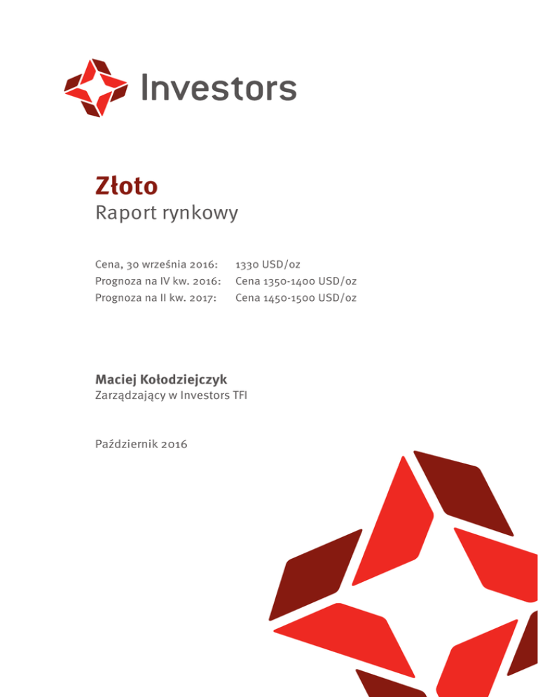 Złoto Raport rynkowy Cena, 30 września 2016: 1330 USD/oz Prognoza na IV kw. 2016: Cena 1350-1400 USD/oz Prognoza na II kw. 2017: Cena 1450-1500 USD/oz Maciej Kołodziejczyk Zarządzający w Investors TFI Październik 2016 „Hossa rodzi się w pesymizmie, wzrasta w sceptycyzmie, dojrzewa w optymizmie i umiera w euforii” Sir John Templeton założyciel grupy funduszy inwestycyjnych Templeton Główne wnioski ▪▪ ▪▪ ▪▪ ▪▪ ▪▪ Wiele wskazuje na to, że od początku roku na rynku metali szlachetnych obserwujemy kształtowanie się trendu wzrostowego. Inwestor, który kupił złoto w minionych dwunastu miesiącach, notuje obecnie przeciętnie ok. 9% zysku. Reakcja rynków finansowych na wyniki referendum w Wielkiej Brytanii potwierdza tezę o istotności złota jako stałego składnika portfela inwestycyjnego. W ostatnich trzech kwartałach widoczny był silny napływ środków do funduszy ETF lokujących w złoto fizyczne. Co więcej, korekty ceny kruszcu nie skutkują umorzeniami, co wskazuje na przekonanie inwestorów o trwałości trendu średnioterminowego. Na rynek kontraktów terminowych futures napłynął kapitał spekulacyjny. Bazując na historycznych zależnościach można oczekiwać jego odpływu w najbliższych miesiącach skutkującego pogłębieniem korekty i nerwowymi reakcjami inwestorów. Przykładem takiej sytuacji była sesja 4 października, na której kurs złota zniżkował o ponad 3%. Analiza techniczna kursu złota w USD wskazuje na wybicie z trzyletniego trendu spadkowego i zakończony sukcesem testujący ruch powrotny pod koniec maja 2016 roku. str. 2 Spis treści Główne wnioski 2 Kształtowanie się trendu wzrostowego na rynku złota 4 Złoto jako ubezpieczenie – przypadek referendum brytyjskiego 6 Analiza bieżących wydarzeń 7 Popyt na złoto fizyczne 7 Fundusze typu ETF 8 Rynek futures 8 Sentyment inwestorów 9 Analiza techniczna 10 Podsumowanie i prognoza 11 str. 3 Wrześniowe posiedzenie Zarządu Rezerwy Federalnej nie przyniosło zmiany stóp procentowych w USA. Kolejne odbędzie się w tygodniu poprzedzającym wybory prezydenckie, co oznacza, że prawdopodobieństwo podjęcia wtedy decyzji o podwyżce jest bardzo niskie. W 2016 roku Fed pozostałoby więc jedynie posiedzenie grudniowe, co oznacza, że w przypadku podniesienia wtedy stóp procentowych, upłynąłby rok pomiędzy decyzjami o zacieśnianiu polityki pieniężnej. Dla porównania, w poprzednim cyklu (w latach 2004-06) podwyżki o 0,25pp były wprowadzane na siedemnastu kolejnych posiedzeniach amerykańskiego banku centralnego. Dla ceny złota kluczowe są nie nominalne, lecz realne stopy procentowe. Niskie oprocentowanie depozytów byłoby do zaakceptowania dla oszczędzających w przypadku zerowej inflacji lub deflacji. Gdy pieniądze realnie tracą na wartości, część oszczędzających i inwestorów zwraca się ku złotu, które ma długą historię utrzymywania, a w ostatnich kilku dekadach nawet pewnego wzrostu wartości realnej. Tabela 1 przedstawia obecny poziom krótkoterminowych stóp procentowych najważniejszych walut świata na tle inflacji w ostatnich 12 miesiącach. Tabela 1. Stopy procentowe pięciu największych walut krajów rozwiniętych na tle wskaźnika inflacji konsumenckiej. Stopa procentowa banku centralnego 12-miesięczny wskaźnik inflacji Realne stopy procentowe Dolar USA 0,5% 1,1% -0,6% Euro 0,0% 0,4% -0,4% Jen japoński -0,1% -0,5% +0,4% Funt brytyjski 0,25% 0,6% -0,35% Kanada 0,5% 1,1% -0,6% Źródło: tradingeconomics.com Realne stopy procentowe pozostają ujemne w czterech z pięciu najważniejszych krajów lub stref walutowych. Jedynie w Japonii, która boryka się z deflacją, są dodatnie. Warto w tym miejscu przypomnieć o efektach bazy związanych z wahaniami cen surowców. W styczniu i lutym 2016 roku średnia cena ropy naftowej wynosiła około 31-32 dolarów za baryłkę, co oznacza, że w przypadku utrzymania się obecnego kursu (ok. 48 dolarów za baryłkę), za kilka miesięcy na wskaźnik inflacji wpływać będzie około 50-proc. wzrost ceny surowca w stosunku rocznym. W USA może to zwiększyć inflację o ok. 0,6-0,7 pp. W przypadku stabilizacji cen żywności, realne stopy procentowe stałyby się wtedy mocno ujemne, z czego amerykański bank centralny doskonale zdaje sobie sprawę. Na wrześniowym posiedzeniu Fed aż trzech gubernatorów złożyło zdanie odrębne, optując za podwyżką stóp procentowych. Rynek kontraktów terminowych Fed Funds szacuje prawdopodobieństwo podwyżki grudniowej na ok. 60%. Co prawda po jednorazowej podwyżce stóp procentowych w USA o 0,25 pp realne stopy procentowe pozostaną ujemne, jednak taki ruch Fed kontrastowałby z polityką realizowaną przez inne znaczące banki centralne (m.in. ECB oraz Banku Japonii), co z kolei mogłoby przełożyć się na umocnienie dolara amerykańskiego. Jako że złoto jest na rynkach wyceniane w walucie amerykańskiej, jej umocnienie mogłoby wywrzeć presję na notowania kruszcu. Kształtowanie się trendu wzrostowego na rynku złota Siła oraz długotrwałość tegorocznych wzrostów ceny złota może coraz szersze rzesze inwestorów utwierdzać w przekonaniu, że na rynku metali szlachetnych rodzi się nowy trend wzrostowy. Jednym ze sposobów sprawdzenia czy dany rynek można określić mianem rynku byka jest badanie, czy przeciętny inwestor osiągnął zysk podczas ostatnich 12 miesięcy (roczny horyzont jest jednym z częściej stosowanych kresów sprawdzania rentowności inwestycji). Metoda ta została zobrazowana na wykresie 1. Przedstawia on kurs złota (linia niebieska) wraz ze średnią cenę zakupu w roku poprzedzającym dane notowanie (linia zielona). W przypadku, gdy linia niebieska jest ponad linią zieloną większość inwestorów notuje zyski, więc w myśl przyjętego założenia mamy do czynienia z hossą. Pokrewnym sposobem określania, czy dana klasa aktywów znajduje się w cyklu hossy, jest sprawdzenie czy średnia cena zakupu