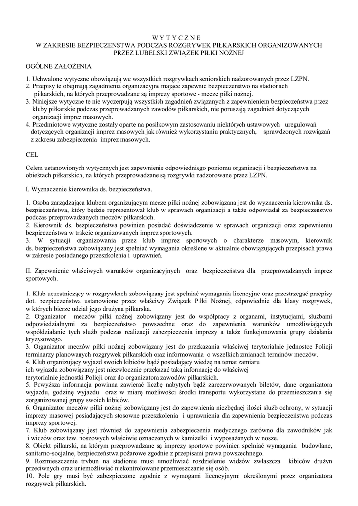WYTYCZNE W ZAKRESIE BEZPIECZEŃSTWA PODCZAS ROZGRYWEK PIŁKARSKICH ORGANIZOWANYCH PRZEZ LUBELSKI ZWIĄZEK PIŁKI NOŻNEJ OGÓLNE ZAŁOŻENIA 1. Uchwalone wytyczne obowiązują we wszystkich rozgrywkach seniorskich nadzorowanych przez LZPN. 2. Przepisy te obejmują zagadnienia organizacyjne mające zapewnić bezpieczeństwo na stadionach piłkarskich, na których przeprowadzane są imprezy sportowe - mecze piłki nożnej. 3. Niniejsze wytyczne te nie wyczerpują wszystkich zagadnień związanych z zapewnieniem bezpieczeństwa przez kluby piłkarskie podczas przeprowadzanych zawodów piłkarskich, nie poruszają zagadnień dotyczących organizacji imprez masowych. 4. Przedmiotowe wytyczne zostały oparte na posiłkowym zastosowaniu niektórych ustawowych uregulowań dotyczących organizacji imprez masowych jak również wykorzystaniu praktycznych, sprawdzonych rozwiązań z zakresu zabezpieczenia imprez masowych. CEL Celem ustanowionych wytycznych jest zapewnienie odpowiedniego poziomu organizacji i bezpieczeństwa na obiektach piłkarskich, na których przeprowadzane są rozgrywki nadzorowane przez LZPN. I. Wyznaczenie kierownika ds. bezpieczeństwa. 1. Osoba zarządzająca klubem organizującym mecze piłki nożnej zobowiązana jest do wyznaczenia kierownika ds. bezpieczeństwa, który będzie reprezentował klub w sprawach organizacji a także odpowiadał za bezpieczeństwo podczas przeprowadzanych meczów piłkarskich. 2. Kierownik ds. bezpieczeństwa powinien posiadać doświadczenie w sprawach organizacji oraz zapewnieniu bezpieczeństwa w trakcie organizowanych imprez sportowych. 3. W sytuacji organizowania przez klub imprez sportowych o charakterze masowym, kierownik ds. bezpieczeństwa zobowiązany jest spełniać wymagania określone w aktualnie obowiązujących przepisach prawa w zakresie posiadanego przeszkolenia i uprawnień. II. Zapewnienie właściwych warunków organizacyjnych oraz bezpieczeństwa dla przeprowadzanych imprez sportowych. 1. Klub uczestniczący w rozgrywkach zobowiązany jest spełniać wymagania licencyjne oraz przestrzegać przepisy dot. bezpieczeństwa ustanowione przez właściwy Związek Piłki Nożnej, odpowiednie dla klasy rozgrywek, w których bierze udział jego drużyna piłkarska. 2. Organizator meczów piłki nożnej zobowiązany jest do współpracy z organami, instytucjami, służbami odpowiedzialnymi za bezpieczeństwo powszechne oraz do zapewnienia warunków umożliwiających współdziałanie tych służb podczas realizacji zabezpieczenia imprezy a także funkcjonowania grupy działania kryzysowego. 3. Organizator meczów piłki nożnej zobowiązany jest do przekazania właściwej terytorialnie jednostce Policji terminarzy planowanych rozgrywek piłkarskich oraz informowania o wszelkich zmianach terminów meczów. 4. Klub organizujący wyjazd swoich kibiców bądź posiadający wiedzę na temat zamiaru ich wyjazdu zobowiązany jest niezwłocznie przekazać taką informację do właściwej terytorialnie jednostki Policji oraz do organizatora zawodów piłkarskich. 5. Powyższa informacja powinna zawierać liczbę nabytych bądź zarezerwowanych biletów, dane organizatora wyjazdu, godzinę wyjazdu oraz w miarę możliwości środki transportu wykorzystane do przemieszczania się zorganizowanej grupy swoich kibiców. 6. Organizator meczów piłki nożnej zobowiązany jest do zapewnienia niezbędnej ilości służb ochrony, w sytuacji imprezy masowej posiadających stosowne przeszkolenia i uprawnienia dla zapewnienia bezpieczeństwa podczas imprezy sportowej. 7. Klub zobowiązany jest również do zapewnienia zabezpieczenia medycznego zarówno dla zawodników jak i widzów oraz tzw. noszowych właściwie oznaczonych w kamizelki i wyposażonych w nosze. 8. Obiekt piłkarski, na którym przeprowadzane są imprezy sportowe powinien spełniać wymagania budowlane, sanitarno-socjalne, bezpieczeństwa pożarowe zgodnie z przepisami prawa powszechnego. 9. Rozmieszczenie trybun na stadionie musi umożliwiać rozdzielenie widzów zwłaszcza kibiców drużyn przeciwnych oraz uniemożliwiać niekontrolowane przemieszczanie się osób. 10. Pole gry musi być zabezpieczone zgodnie z wymogami licencyjnymi określonymi przez organizatora rozgrywek piłkarskich. 11. Obiekt sportowy powinien posiadać w dostępnym dla widzów miejscu plan stadionu, regulamin stadionu. 12. Osoba zarządzająca klubem sportowym zobowiązana jest wyznaczyć spikera zawodów, który powinien posiadać doświadczenie w wykonywaniu w/w zawodu i ewentualnie w zależności od klasy rozgrywek stosowne przeszkolenie. 13. Stadion powinien być wyposażony w system nagłośnienia umożliwiający pracę spikerowi zawodów, tablicę informacyjną z zegarem lub telebim. III. Organizacja imprez sportowych – meczów piłki nożnej. 1. Informacje o planowanym meczu muszą być udostępnione w formie plakatów bądź w inny publiczny sposób. Dane informacyjne muszą zawierać nazwę klasy rozgrywek, nazwę drużyn piłkarskich, datę i godzinę rozpoczęcia spotkania piłkarskiego, godzinę udostępnienia stadionu dla widzów, ewentualnie jeżeli udział w imprezie jest odpłatny ceny biletów wstępu. 2. Sprzedaży biletów powinna odbywać się w przystosowanych do tego celu punktach kasowych, w których również znajdować się powinny punkty informacyjne. 3. Organizator imprezy sportowej zobowiązany jest zapewnić bilety wstępu dla kibiców drużyny przyjezdnej w ilości minimum 5% ogólnej ilości udostępnionych miejsc na stadionie. 4. Organizator meczu powinien zapewnić dla kibiców w tym również drużyny przyjezdnej toalety i bufet. 5. Sprzedaż biletów wstępu na mecz piłki nożnej dla kibiców przyjezdnych powinna być umożliwiona za pośrednictwem klubu macierzystego i w kasach sprzedaży na obiekcie gospodarza zawodów w dniu meczu. 6. Bilety wstępu powinny zostać przekazane dla zorganizowanych kibiców drużyn przyjezdnych na podstawie zamówienie z Klubu macierzystego w