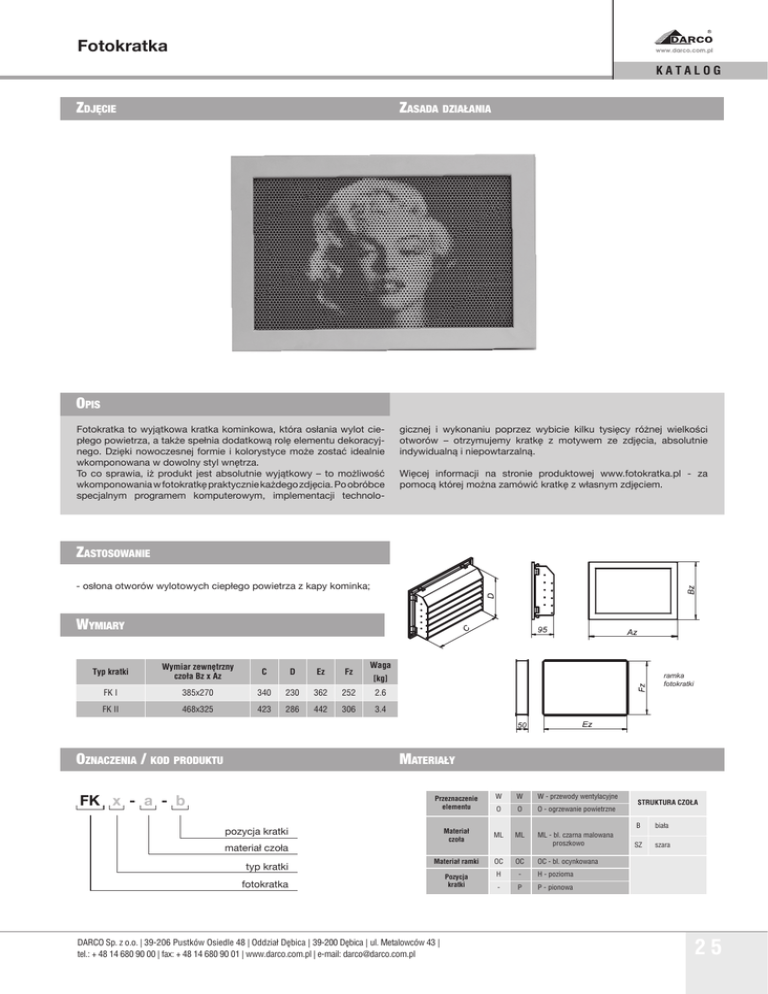 Fotokratka KATALOG Zdjęcie Zasada działania Opis Fotokratka to wyjątkowa kratka kominkowa, która osłania wylot ciepłego powietrza, a także spełnia dodatkową rolę elementu dekoracyjnego. Dzięki nowoczesnej formie i kolorystyce może zostać idealnie wkomponowana w dowolny styl wnętrza. To co sprawia, iż produkt jest absolutnie wyjątkowy – to możliwość wkomponowania w fotokratkę praktycznie każdego zdjęcia. Po obróbce specjalnym programem komputerowym, implementacji technolo- gicznej i wykonaniu poprzez wybicie kilku tysięcy różnej wielkości otworów – otrzymujemy kratkę z motywem ze zdjęcia, absolutnie indywidualną i niepowtarzalną. Więcej informacji na stronie produktowej www.fotokratka.pl - za pomocą której można zamówić kratkę z własnym zdjęciem. Zastosowanie - osłona otworów wylotowych ciepłego powietrza z kapy kominka; Wymiary Waga Typ kratki Wymiar zewnętrzny czoła Bz x Az C D Ez Fz FK I 385x270 340 230 362 252 2.6 FK II 468x325 423 286 442 306 3.4 Oznaczenia / kod produktu ramka fotokratki [kg] Materiały FK x - a - b W W W - przewody wentylacyjne O O O - ogrzewanie powietrzne Materiał czoła ML ML ML - bl. czarna malowana proszkowo Materiał ramki OC OC OC - bl. ocynkowana Pozycja kratki H - H - pozioma - P P - pionowa Przeznaczenie elementu pozycja kratki materiał czoła typ kratki fotokratka DARCO Sp. z o.o. | 39-206 Pustków Osiedle 48 | Oddział Dębica | 39-200 Dębica | ul. Metalowców 43 | tel.: + 48 14 680 90 00 | fax: + 48 14 680 90 01 | www.darco.com.pl | e-mail: [email protected] STRUKTURA CZOŁA B biała SZ szara 25
