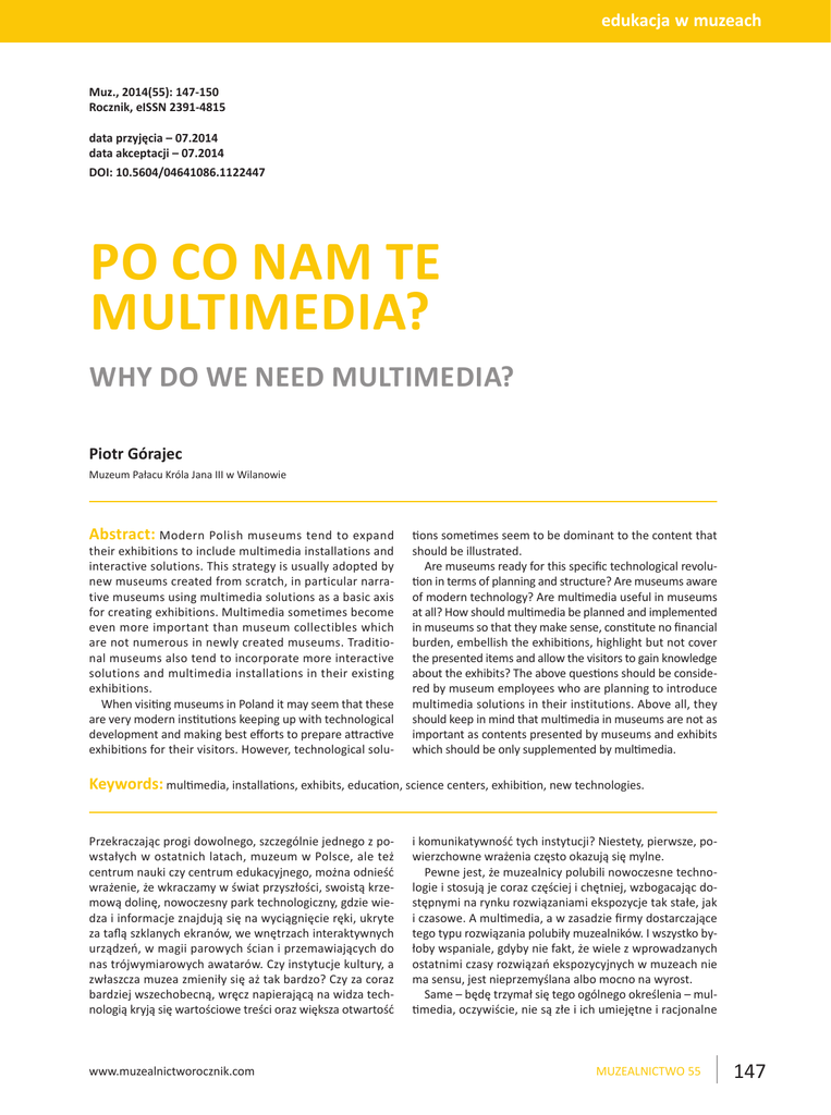 edukacja w muzeach Muz., 2014(55): 147-150 Rocznik, eISSN 2391-4815 data przyjęcia – 07.2014 data akceptacji – 07.2014 DOI: 10.5604/04641086.1122447 PO CO NAM TE MULTIMEDIA? WHY DO WE NEED MULTIMEDIA? Piotr Górajec Muzeum Pałacu Króla Jana III w Wilanowie Abstract: Modern Polish museums tend to expand their exhibitions to include multimedia installations and interactive solutions. This strategy is usually adopted by new museums created from scratch, in particular narrative museums using multimedia solutions as a basic axis for creating exhibitions. Multimedia sometimes become even more important than museum collectibles which are not numerous in newly created museums. Traditional museums also tend to incorporate more interactive solutions and multimedia installations in their existing exhibitions. When visiting museums in Poland it may seem that these are very modern institutions keeping up with technological development and making best efforts to prepare attractive exhibitions for their visitors. However, technological solu- tions sometimes seem to be dominant to the content that should be illustrated. Are museums ready for this specific technological revolution in terms of planning and structure? Are museums aware of modern technology? Are multimedia useful in museums at all? How should multimedia be planned and implemented in museums so that they make sense, constitute no financial burden, embellish the exhibitions, highlight but not cover the presented items and allow the visitors to gain knowledge about the exhibits? The above questions should be considered by museum employees who are planning to introduce multimedia solutions in their institutions. Above all, they should keep in mind that multimedia in museums are not as important as contents presented by museums and exhibits which should be only supplemented by multimedia. Keywords: multimedia, installations, exhibits, education, science centers, exhibition, new technologies. Przekraczając progi dowolnego, szczególnie jednego z powstałych w ostatnich latach, muzeum w Polsce, ale też centrum nauki czy centrum edukacyjnego, można odnieść wrażenie, że wkraczamy w świat przyszłości, swoistą krzemową dolinę, nowoczesny park technologiczny, gdzie wiedza i informacje znajdują się na wyciągnięcie ręki, ukryte za taflą szklanych ekranów, we wnętrzach interaktywnych urządzeń, w magii parowych ścian i przemawiających do nas trójwymiarowych awatarów. Czy instytucje kultury, a zwłaszcza muzea zmieniły się aż tak bardzo? Czy za coraz bardziej wszechobecną, wręcz napierającą na widza technologią kryją się wartościowe treści oraz większa otwartość www.muzealnictworocznik.com i komunikatywność tych instytucji? Niestety, pierwsze, powierzchowne wrażenia często okazują się mylne. Pewne jest, że muzealnicy polubili nowoczesne technologie i stosują je coraz częściej i chętniej, wzbogacając dostępnymi na rynku rozwiązaniami ekspozycje tak stałe, jak i czasowe. A multimedia, a w zasadzie firmy dostarczające tego typu rozwiązania polubiły muzealników. I wszystko byłoby wspaniale, gdyby nie fakt, że wiele z wprowadzanych ostatnimi czasy rozwiązań ekspozycyjnych w muzeach nie ma sensu, jest nieprzemyślana albo mocno na wyrost. Same – będę trzymał się tego ogólnego określenia – multimedia, oczywiście, nie są złe i ich umiejętne i racjonalne MUZEALNICTWO 55 147 zastosowanie pomaga wzbogacić ekspozycję, uzupełnić narrację i poprawić zasoby wiedzy przekazywanej zwiedzającym, przez co ich wizyta w muzeum może stać się bardziej wartościowa dla nich samych. Aby to jednak zadziałało, do całego problemu trzeba podejść w sposób kompleksowy, ostrożny i starannie przemyślany, łatwo bowiem zamiast zamierzonych celów osiągnąć efekt zgoła odmienny i stworzyć coś niepotrzebnego, często śmiesznego, a co najgorsze, obciążającego muzeum organizacyjnie i finansowo przez wiele kolejnych lat. Planując wystawę multimedialną lub wzbogacenie muzealnej ekspozycji multimediami, należy pamiętać o kilku podstawowych elementach. Po pierwsze musimy sami sobie odpowiedzieć na pytanie, co chcemy w ten sposób przekazać publiczności, czyli musimy mieć świadomość treści oraz strategii ich prezentacji. Po drugie, co właściwie nierozerwalnie związane jest z pierwszym, musimy mieć świadomość naszej publiczności. Musimy więc rozpoznać, kto będzie odbiorcą tych treści, jakie ma wobec muzeum czy wystawy oczekiwania i co możemy mu naszymi działaniami zaoferować, a także co w ten sposób zyskamy dla siebie. Równie ważna jest także nasza świadomość ekspozycji, którą planujemy i którą będziemy przygotowywać. Należy bardzo uważać, żeby przygotowywane rozwiązania nie zatarły jej głównego wątku, nie przyćmiły zabytków, które będą na niej eksponowane. Po czwarte wreszcie, należy mieć świadomość i plan, jak zastosowane rozwiązania będą w przyszłości rozwijane i utrzymywane, tak aby one same w krótkim czasie nie stały się eksponatami kwalifikującymi się do muzeum, tym razem techniki. Być może wymienione zasady wydają się oczywiste, ale w rzeczywistości tak nie jest. Muzea, choć chętnie sięgają po nowoczesne technologie, to nadal często funkcjonują według niezmiennego od lat wzorca. Oddzielnie traktowana jest warstwa merytoryczna planowanych przedsięwzięć, a oddzielnie cała reszta – udostępnienie, edukacja, a także towarzyszące wystawom multimedia. Dlatego też zamiast ciekawego i przyjaznego dla publiczności rozwiązania nierzadko efektem finalnym zastosowania multimedialnych rozwiązań przy projektowaniu ekspozycji jest bezużyteczny i pozbawiony wartościowej zawartości przerost formy nad treścią. Niestety, wszystko to powoduje, że rozwiązania multimedialne stosowane obecnie w polskich muzeach są często pozbawione sensu. Multimedia niejednokrotnie stosowane są jako dodatek lub, co 