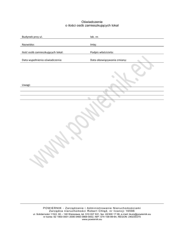 Oświadczenie o ilości osób zamieszkujących lokal Budynek przy ul. lok. nr. Nazwisko: Imię: Ilość osób zamieszkujących lokal: Podpis właściciela: Data wypełnienia oświadczenia: Data obowiązywania zmiany: Uwagi: P OW I E R N I K - Z a r zą d za n i e i A d m i n i s t r o wa n i e N i e r u c h o m o ś c i a m i Z a r zą d c a n i e r u c h o m o ś c i R o b e r t C h ł ą d , n r l i c e n c j i 1 6 5 9 6 ul. Solidarności 115/2, 00 – 140 Warszawa, tel. 510 037 531, fax: 22/300 17 08, e-mail: [email protected] nr konta: 62 1950 0001 2006 0460 0969 0002, NIP: 574-108-99-64, REGON: 240230375 www.powiernik.eu