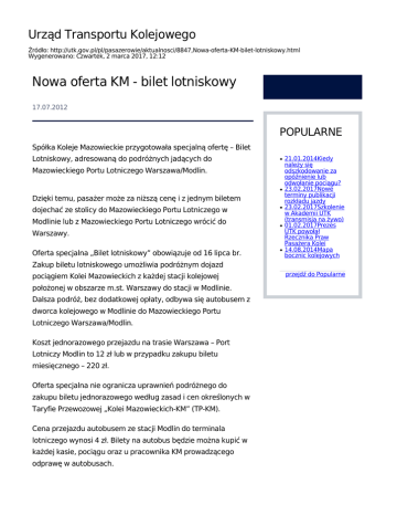 Urząd Transportu Kolejowego Źródło: http://utk.gov.pl/pl/pasazerowie/aktualnosci/8847,Nowa-oferta-KM-bilet-lotniskowy.html Wygenerowano: Czwartek, 2 marca 2017, 12:12 Nowa oferta KM - bilet lotniskowy 17.07.2012 POPULARNE Spółka Koleje Mazowieckie przygotowała specjalną ofertę – Bilet Lotniskowy, adresowaną do podróżnych jadących do ● Mazowieckiego Portu Lotniczego Warszawa/Modlin. ● Dzięki temu, pasażer może za niższą cenę i z jednym biletem dojechać ze stolicy do Mazowieckiego Portu Lotniczego w Modlinie lub z Mazowieckiego Portu Lotniczego wrócić do ● ● Warszawy. Oferta specjalna „Bilet lotniskowy” obowiązuje od 16 lipca br. ● 21.01.2014Kiedy należy się odszkodowanie za opóźnienie lub odwołanie pociągu? 23.02.2017Nowe terminy publikacji rozkładu jazdy 23.02.2017Szkolenie w Akademii UTK (transmisja na żywo) 01.02.2017Prezes UTK powołał Rzecznika Praw Pasażera Kolei 14.08.2014Mapa bocznic kolejowych Zakup biletu lotniskowego umożliwia podróżnym dojazd pociągiem Kolei Mazowieckich z każdej stacji kolejowej położonej w obszarze m.st. Warszawy do stacji w Modlinie. Dalsza podróż, bez dodatkowej opłaty, odbywa się autobusem z dworca kolejowego w Modlinie do Mazowieckiego Portu Lotniczego Warszawa/Modlin. Koszt jednorazowego przejazdu na trasie Warszawa – Port Lotniczy Modlin to 12 zł lub w przypadku zakupu biletu miesięcznego – 220 zł. Oferta specjalna nie ogranicza uprawnień podróżnego do zakupu biletu jednorazowego według zasad i cen określonych w Taryfie Przewozowej „Kolei Mazowieckich-KM” (TP-KM). Cena przejazdu autobusem ze stacji Modlin do terminala lotniczego wynosi 4 zł. Bilety na autobus będzie można kupić w każdej kasie, pociągu oraz u pracownika KM prowadzącego odprawę w autobusach. przejdź do Popularne ● Warunki taryfowe Bilet Lotniskowy.pdf Źródło: Koleje Mazowieckie