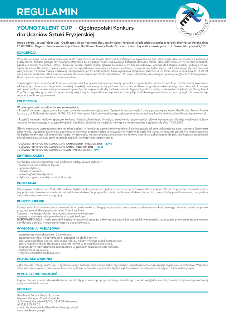REGULAMIN YOUNG TALENT CUP – Ogólnopolski Konkurs dla Uczniów Sztuki Fryzjerskiej Druga edycja „Young Talent Cup - Ogólnopolskiego Konkursu dla Uczniów Sztuki Fryzjerskiej odbędzie się podczas targów Hair Forum Poland dnia 26.09.2015 r. Organizatorem konkursu jest firma Health and Beauty Media Sp. z o.o. z siedzibą w Warszawie przy ul. Królowej Marysieńki 9/10. KONCEPCJA W konkursie mogą wziąć udział uczniowie szkół fryzjerskich oraz innych placówek kształcących w zawodzie fryzjer, którym przyjdzie się zmierzyć z zadaniem praktycznym. Zadanie polega na wykonaniu strzyżenia ze stylizacją włosów (obowiązują kategorie damska i męska, które odbywają się w tym samym czasie), zgodnie z zadanym tematem „Street - Focus on Trends”. Każda szkoła zgłasza do konkursu dwóch zawodników, jednego do kategorii męskiej i jednego do kategorii damskiej. Uczestnicy powinni wziąć pod uwagę aktualnie panujące we fryzjerstwie trendy, zarówno pod kątem cięcia, jak i koloryzacji, fryzura powinna wpisywać się w kanony fryzury użytkowej, akceptowanej przez modę uliczną. Czas wykonania strzyżenia i stylizacji to 90 minut. Wiek uczestników to 16-21 lat (liczy się rok urodzenia). Do konkursu zostanie dopuszczonych łącznie 30 uczestników (15 szkół). Uczestnicy obu kategorii pracują na główkach treningowych, które zapewnia sponsor konkursu firma Schoolline. Szkoła zgłaszająca uczniów do konkursu weźmie udział w rywalizacji międzyszkolnej i powalczy o przechodni puchar School Cup. Szkoła, której zawodnicy zdobędą łącznie w obu kategoriach (damskiej i męskiej) największą liczbę punktów otrzyma tę prestiżową nagrodę na okres jednego roku. Aby szkoła mogła zatrzymać puchar na stałe, musi ponownie otrzymać łącznie najwyższą liczbę punktów w obu kategoriach podczas jednej z kolejnych edycji konkursu Young Talent Cup. W przypadku, gdy dwie szkoły otrzymają taką samą liczbę punktów o zwycięstwie zadecyduje dodatkowe głosowanie jury, przy czym głos Przewodniczącego jury jest liczony podwójnie. ZGŁOSZENIA W celu zgłoszenia uczniów do konkursu należy: - Przesłać na adres organizatora konkursu czytelnie wypełnione zgłoszenie. Zgłoszenie można wysłać drogą pocztową na adres Health and Beauty Media Sp. z o.o., ul. Królowej Marysieńki 9/10, 02–954 Warszawa lub skan wypełnionego zgłoszenia na adres mailowy [email protected]. - Przesłać na adres mailowy sponsora konkursu ([email protected]) formularz zamówienia odpowiednich główek treningowych (istnieje możliwość wyboru wariantu kolorystycznego w przypadku główki damskiej). Zamówienie na główki treningowe należy przesłać najpóźniej do dnia 17.08.2015. Główki treningowe zostaną przesłane na adres podany w formularzu zamówienia w terminie 5 dni roboczych od dnia wpłynięcia na adres sponsora formularza zamówienia. Uczestnicy powinni na otrzymanych główkach przeprowadzić koloryzację we własnym zakresie (nie wolno wykonywać cięcia). Na terenie konkursu nie będzie możliwości wykonania koloryzacji. W przypadku niestawienia się zawodników na konkurs, szkoła jest zobowiązana do pokrycia kosztów przesłanych główek treningowych przy czym koszt jednej główki treningowej to odpowiednio: - GŁÓWKA TRENINGOWA, SCHOOLLINE ANNA BLOND - PREMIUM LINE – 229 zł - GŁÓWKA TRENINGOWA, SCHOOLLINE ANNA - PREMIUM LINE – 189 zł - GŁÓWKA TRENINGOWA, SCHOOLLINE MEN - PREMIUM LINE – 159 zł KRYTERIA OCENY Jury będzie oceniać uczestników na podstawie następujących kryteriów: - Koloryzacja podkreślająca fryzurę, - Spójność stylizacji, - Precyzja wykonania, - Innowacyjność/kreatywność, - Stylizacja ogólna – makijaż/strój/rekwizyty. PUNKTACJA Obowiązuje punktacja od 21 do 30 punktów. Sędzia maksymalnie tylko jeden raz może przyznać zawodnikom noty od 28 do 30 punktów. Pozostałe punkty jury przyznaje dowolnie w zależności od ilości zawodników. W przypadku, kiedy dwóch zawodników otrzyma taką samą liczbę punktów o miejscu na podium decyduje nota przewodniczącego jury. PUNKTY UJEMNE Komisja kontroli – kontroluje prace zawodników w czasie konkursu. Reaguje w przypadku naruszenia zasad regulaminu konkursowego. Komisja kontroli ma prawo przyznać zawodnikowi punkty karne od 3 do 4 punktów. 3 punkty – stylizacja włosów niezgodna z regulaminem konkursu. 4 punkty – zbyt małe skrócenie włosów w czasie konkursu. DYSKWALIFIKACJA - kiedy zawodnik będzie kontynuował pracę po zakończonym czasie konkurencji lub w przypadku rozpoczęcia pracy przed startem a także gdy dokona zamiany numeru startowego na stanowisku pracy. WYMAGANIA I WSKAZÓWKI - uczestnicy powinni obciąć min. 5 cm włosów, - przed startem włosy należy zmoczyć i zaczesać na gładko do tyłu, - koloryzacja podlega ocenie, koloryzację włosów należy wykonać przed mistrzostwami, - kolory neonowe należy stosować z umiarem jedynie w celu podkreślenia cięcia, - awangardowe rozwiązania są dopuszczalne w granicach realizacji tematu konkursu, - niedozwolone są upięcia, - wszystkie narzędzia są dozwolone, POZOSTAŁE WARUNKI Zgłoszenie do „Young Talent Cup – Ogólnopolskiego Konkursu dla Uczniów Sztuki Fryzjerskiej” jest jednoznaczne z akceptacją regulaminu uczestnictwa. Wszystkie materiały zdjęciowe oraz filmowe realizowane podczas mistrzostw, organizator będzie wykorzystywać do celów promocyjnych a także redakcyjnych. WYKLUCZENIE ROSZCZEŃ Organizator nie ponosi odpowiedzialności za szkody powstałe z przyczyn od niego niezależnych, w tym względem modelki/ modela z tytułu nieprawidłowej pracy uczestnika konkursu. KONTAKT Health and Beauty Media Sp. z o.o. Program Manager: Kamila Jadwicka ul. Królowej Marysieńki 9/10, 02–954 Warszawa tel. (22) 858 79 55 e-mail: [email protected] www.hair-forum.com.pl Zgłoszenie do udziału w YOUNG TALENT CUP – Ogólnopolskiego Konkursu dla Uczniów Sztuki