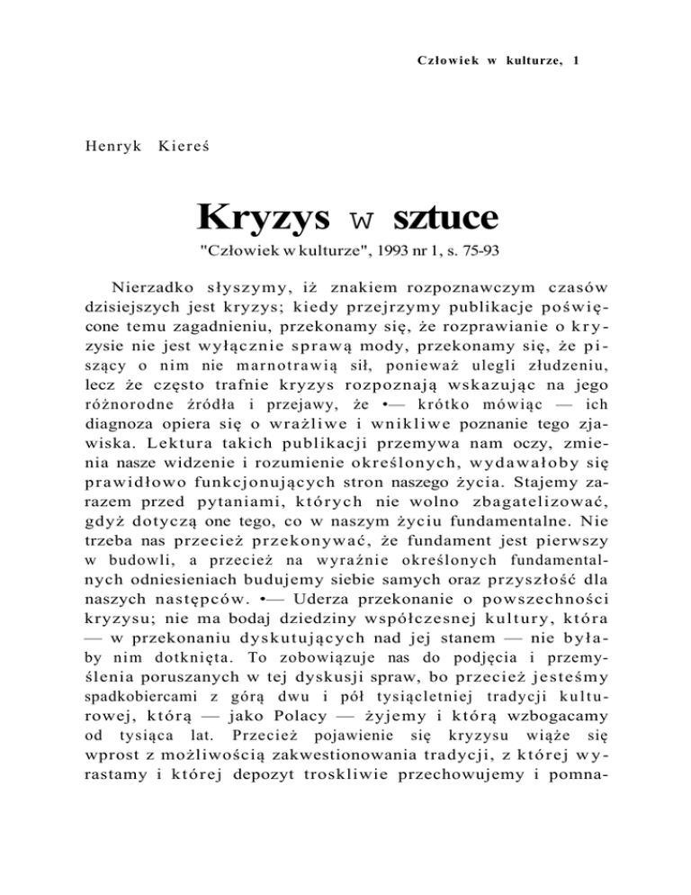 C z ł o w i e k w kulturze, 1 Henryk Kiereś Kryzys w sztuce "Człowiek w kulturze", 1993 nr 1, s. 75-93 Nierzadko słyszymy, iż znakiem rozpoznawczym czasów dzisiejszych jest kryzys; kiedy przejrzymy publikacje p o ś w i ę cone temu zagadnieniu, przekonamy się, że rozprawianie o k r y zysie nie jest wyłącznie s p r a w ą mody, przekonamy się, że p i szący o nim nie m a r n o t r a w i ą sił, ponieważ ulegli złudzeniu, lecz że często trafnie kryzys rozpoznają wskazując na jego różnorodne źródła i przejawy, że •— k r ó t k o mówiąc — ich diagnoza opiera się o w r a ż l i w e i w n i k l i w e poznanie tego zja wiska. Lektura takich publikacji przemywa nam oczy, zmie nia nasze widzenie i rozumienie określonych, w y d a w a ł o b y się p r a w i d ł o w o funkcjonujących stron naszego życia. Stajemy za razem przed pytaniami, k t ó r y c h nie wolno zbagatelizować, gdyż dotyczą one tego, co w naszym życiu fundamentalne. Nie trzeba nas przecież p r z e k o n y w a ć , że fundament jest pierwszy w budowli, a przecież na w y r a ź n i e określonych fundamental nych odniesieniach budujemy siebie samych oraz przyszłość dla naszych następców. •— Uderza przekonanie o powszechności kryzysu; nie ma bodaj dziedziny współczesnej k u l t u r y , k t ó r a — w przekonaniu d y s k u t u j ą c y c h nad jej stanem — nie b y ł a by nim dotknięta. To zobowiązuje nas do podjęcia i przemy ślenia poruszanych w tej dyskusji spraw, bo przecież j e s t e ś m y spadkobiercami z górą dwu i pół tysiącletniej tradycji k u l t u rowej, k t ó r ą — jako Polacy — żyjemy i k t ó r ą wzbogacamy od tysiąca lat. Przecież pojawienie się kryzysu wiąże się wprost z możliwością zakwestionowania tradycji, z k t ó r e j w y rastamy i k t ó r e j depozyt troskliwie przechowujemy i pomna- 76 Henryk Kiereś żamy. J e s t e ś m y również świadomi, że nie jest to tradycja typu plemiennego, w k t ó r e j wszystkie aspekty ludzkich poczynań są „związane" w jedność jakąś mitologią czy ideologią, lecz że jest to tradycja stojąca na mocnych filarach greckiej metafi zyki, rzymskiego prawa oraz religii chrześcijańskiej, które prze nikają się nawzajem i w a r u n k u j ą tworząc nierozerwalną ca łość nazwaną k u l t u r ą i — jeśli dodamy wyrosłą z nich nowo żytną n a u k ę — cywilizację Zachodu. Wiemy także, że Wschód i Południe (w ich rozumieniu politycznym) strają się zasymi lować z naszej k u l t u r y to, co jest w niej dla nich żywotne, że — nierzadko wbrew deklaracjom ś w i a t o p o g l ą d o w y m — naśladują ją. Jeśli zatem zbierzemy wszystko to, z czego m o ż e m y być dumni, a zbierze się tego niemało, musi dziwić i zastanawiać mówienie o kryzysie k u l t u r y europejskiej. Ale to zdziwienie może się stać okazją do tego, aby kwestii tej stawić czoła i rozważyć, na czym ów kryzys polega, jakie są jego źródła i skutki. Aby proponowaną analizę filozoficzną „ u k o n k r e t n i ć " spojrzymy na problem kryzysu k u l t u r y Zachodu poprzez kwe stię kryzysu sztuki, ponieważ o jej kryzysie rozprawia się od szeregu lat oraz dlatego, że jest ona jednym z kluczowych aspektów tej k u l t u r y . J e d n a k ż e przedtem z a s t a n ó w m y się nad t y m , co to jest kryzys? Słowo „ k r y z y s " pojawia się w wielu dziedzinach k u l t u r y jako termin techniczny, w filozofii (np. w kosmologii Stoików) czy w medycynie, oraz w mowie potocznej. Kryzys to dla nas stan załamania się czegoś w jego p r a w i d ł o w y m funkcjonowa niu, stan, k t ó r y niesie z sobą zagrożenie istnienia tego czegoś, np. życia. Stan kryzysu wymaga szybkiej interwencji, albo •— przy braku środków i możliwości — skazuje nas na oczeki wanie na tzw. przesilenie, k t ó r e przyniesie ze sobą określony, p o m y ś l n y lub niepomyślny zwrot. W medycznym modelu k r y zysu organizm zmaga się z chorobą — sytuację tę m o ż e m y mutatis mutandis odnieść do problemu kryzysu sztuki. Co i jak pisze się na temat kryzysu w sztuce? Po rozpozna niu jego s y m p t o m ó w i potraktowaniu go jako choroby t r a w i ą - KRYZYS W SZTUCE 77 cej dziedzinę sztuki (niektórzy uważają, że kryzys ma charak ter nieprzerwany i jest po prostu sposobem istnienia sztuki!) na ogół wskazuje się na jego źródła, k t ó r y c h upatruje się w bezkrytycznym odejściu od sprawdzonych historycznie p r y n c y p i ó w kulturowych. Postuluje się p o w r ó t do tych zasad, bo w przeciwnym wypadku — twierdzi się — skutki k r y z y su będą tak głębokie i dalekosiężne, że postawi to pod zna kiem zapytania przyszłość całej k u l t u r y Zachodu. Z rozważań nad pojęciem kryzysu i z diagnozy postawio nej pod adresem sztuki nowoczesnej przez jej z n a w c ó w jedno znacznie wynika, ż e k r y z y s j e s t z ł e m . N a czym po lega jego zło? Jeśli zgodzimy się na to, że k u l t u r a ludzka, w i dziana z pewnego punktu, to sfera „składająca s i ę " z czynności i związanych z n i m i różnorodnie w y t w o r ó w , kryzys nie może być niczym i n n y m jak b r a k i e m r o z u m i e n i a tych czyn ności i w y t w o r ó w , ta zaś sytuacja jest ostatecznie znakiem, iż c z ł o w i e k n i e r o z u m i e s a m e g o s i e b i e ! Spójrz my na tę s p r a w ę nieco bliżej. Celem dynamizmu ludzkiego wyrażającego się w poznaniu, p o s t ę p o w a n i u i wytwarzaniu jest sam człowiek, inaczej m ó w i ą c : b u d u j ą c k u l t u r ę budujemy samych siebie, k u l t u r a jest tylko w nas, zaś nasze w y t w o r y są znakami tej k u l t u r y . Jeśli człowiek działa zgodnie ze swą osobową n a t u r ą , a więc pozna je po to, aby wiedzieć, jakie są przyczyny rzeczy, postępuje tak, aby realizować rozpoznane dobro i wytwarza po to, aby usunąć braki i „ k o n k u r o w a ć " z p r z y r o d ą w zakres