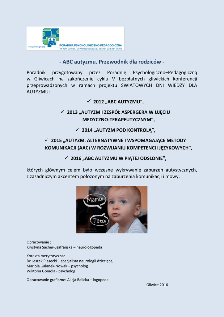 - ABC autyzmu. Przewodnik dla rodziców Poradnik przygotowany przez Poradnię Psychologiczno–Pedagogiczną w Gliwicach na zakończenie cyklu V bezpłatnych gliwickich konferencji przeprowadzonych w ramach projektu ŚWIATOWYCH DNI WIEDZY DLA AUTYZMU: 2012 „ABC AUTYZMU”, 2013 „AUTYZM I ZESPÓŁ ASPERGERA W UJĘCIU MEDYCZNO-TERAPEUTYCZNYM”, 2014 „AUTYZM POD KONTROLĄ”, 2015 „AUTYZM. ALTERNATYWNE I WSPOMAGAJĄCE METODY KOMUNIKACJI (AAC) W ROZWIJANIU KOMPETENCJI JĘZYKOWYCH”, 2016 „ABC AUTYZMU W PIĄTEJ ODSŁONIE”, których głównym celem było wczesne wykrywanie zaburzeń autystycznych, z zasadniczym akcentem położonym na zaburzenia komunikacji i mowy. Opracowanie : Krystyna Sacher-Szafrańska – neurologopeda Korekta merytoryczna: Dr Leszek Piasecki – specjalista neurologii dziecięcej Mariola Galanek-Nowak – psycholog Wiktoria Gomola - psycholog Opracowanie graficzne: Alicja Balicka – logopeda Gliwice 2016 Historia AUTYZM - nazwa pochodząca od greckiego słowa autós oznaczającego „sam”. Pionierami zajmującymi się zagadkowym zaburzeniem autystycznym są Leo Kaner i Hans Asperger, którzy w latach 40. ubiegłego stulecia niezależnie od siebie opublikowali pierwsze opisy tego zaburzenia. Kaner swój główny wniosek formułuje w postaci śmiałego stwierdzenia – należy złożyć, że dzieci te przyszły na świat z wrodzoną nieumiejętnością tworzenia podstawowych, biologicznie uwarunkowanych kontaktów z ludźmi, podobnie jak dzieci, które przychodzą na świat z wrodzonym upośledzeniem fizycznym lub intelektualnym. Asperger opisywał nieumiejętność zintegrowania się z grupą społeczną jako najbardziej dobitną cechę zaburzenia. Intrygowała go kompensacja deficytu komunikacyjnego szczególnymi zdolnościami i oryginalnością myślenia. Zarówno Kaner jak i Asperger byli zgodni co do osobliwego charakteru komunikowania się dzieci z autyzmem i trudności w adaptacji społecznej. Zwracali szczególną uwagę na stereotypie ruchowe, niejednolity wzorzec osiągnięć intelektualnych, byli zaintrygowani sporadycznymi przejawami sprawności intelektualnej w wąskich dziedzinach. Dziś naukowcy są zgodni, że autyzm nie jest - jak początkowo sądzono zaburzeniem jednolitym co do etiologii i obrazu klinicznego. Autyzm zawiera szerokie spektrum przypadków o różnej głębokości zaburzeń i bardzo zróżnicowanym nasileniu poszczególnych objawów. Czym jest autyzm? Autyzm – to głębokie całościowe zaburzenie rozwojowe pojawiające się przed 36 miesiącem życia, obejmujące wszystkie sfery rozwoju i życia dziecka. Skąd się bierze autyzm? Etiologia zaburzeń Próby jednoznacznego wyjaśnienia przyczyn autyzmu nie powiodły się, ponieważ autyzm nie jest jednolitą chorobą, a zróżnicowanym zaburzeniem, które może być wywołane przez wiele czynników. Przyczyn powstawania tego zaburzenia należy dopatrywać się w: a) czynnikach ciążowo-okołoporodowych (m.in. niedotlenienie okołoporodowe, cukrzyca ciężarnych, przedwczesny poród, hipotrofia płodu, ciężkie infekcje wirusowe lub bakteryjne matki w czasie ciąży, przyjmowanie leków w czasie ciąży); b) czynnikach środowiskowych (np. późny wiek rodziców, status ekonomiczny rodziny); c) predyspozycjach genetycznych (dzieci, które posiadają rodzeństwo chore na autyzm obarczone większym ryzykiem). Jakie są objawy autyzmu? Objawy charakterystyczne dla dzieci z zaburzeniami autystycznego spektrum dotyczą trzech sfer rozwojowych: umiejętności społecznych, komunikowania się z otoczeniem, sztywnych wzorców zachowań. Umiejętności społeczne. Dzieci mają zaburzony kontakt wzrokowy (nie patrzą na osobę, która do nich mówi - nawet, kiedy same się czegoś domagają). Nie przynoszą interesujących ich rzeczy, żeby się nimi pochwalić, nie wskazują atrakcyjnych dla nich obiektów i przedmiotów, nie patrzą w kierunku wskazywanym przez inne osoby. Nie okazują emocji lub wyrażają je bardzo słabo (np. poprzez delikatny uśmiech), bywają opisywane jako „poważne”. Wydają się nie zainteresowane pochwałami od bliskich im osób. Dzieci z autyzmem częściej obserwują przedmioty niż ludzi. Nie naśladują nawet opiekunów, zwykle nie są zainteresowane codziennymi czynnościami domowymi. Zabawa tych dzieci jest mało zróżnicowana i schematyczna (np. układanie samochodzików jeden za drugim). Nie potrzebują nikogo do zabawy - najczęściej maluchy bawią się same. Nie uczestniczą w zabawach opartych na społecznych interakcjach, takich jak zabawa w „a kuku” oraz w zabawach naprzemiennych (rzucanie do siebie piłki, berek). U dzieci z autyzmem nie rozwija się lub bardzo słabo rozwija zabawa „na niby” (np. karmienie misia, lulanie lali). Komunikowanie się. Najbardziej niepokojącym objawem w tym obszarze jest nieumiejętność komunikowania się z innymi (brak potrzeby komunikowania się). Dzieci te nieczęsto nie mówią (występuje znacznie opóźniony rozwój mowy). Ponadto charakterystycznym objawem jest brak kompensacji mowy za pomocą gestów (np. nie poklepują się po brzuszku po zjedzeniu czegoś pysznego, nie wyciągają rączek do góry, żeby pokazać, jakie są duże, nie wskazują palcem, żeby nam pokazać, czego potrzebują). Jeśli czegoś potrzebują: same sięgają po dany przedmiot, ciągną osobę dorosłą w stronę miejsca, w którym mają być zaspokojone ich potrzeby, używają ręki dorosłego (chwytają za rękę i kierują nią w stronę pożądanego przedmiotu). W trakcie tych czynności nie patrzą na osobę, od której się czegoś domagają, preferowanym sposobem komunikacji u tych dzieci jest płacz, krzyk, pisk, ucieczka. Najczęściej w taki właśnie sposób reagują na stawiane im wymagania lub odmowę. Jest grupa dzieci z zaburzeniami autystycznego spektrum, u których mowa się rozwinęła, ale nawet te dzieci nie używają mowy w celach komunikacji. Mowa tych dzieci nie jest kierowana do odbior