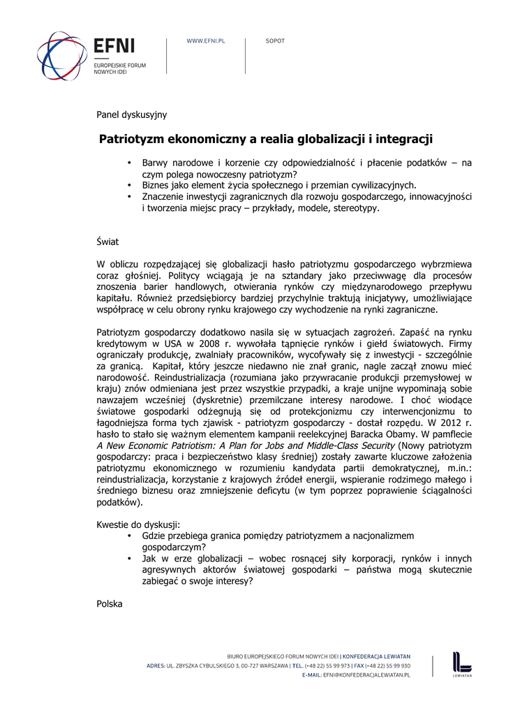 Panel dyskusyjny Patriotyzm ekonomiczny a realia globalizacji i integracji • • • Barwy narodowe i korzenie czy odpowiedzialność i płacenie podatków – na czym polega nowoczesny patriotyzm? Biznes jako element życia społecznego i przemian cywilizacyjnych. Znaczenie inwestycji zagranicznych dla rozwoju gospodarczego, innowacyjności i tworzenia miejsc pracy – przykłady, modele, stereotypy. Świat W obliczu rozpędzającej się globalizacji hasło patriotyzmu gospodarczego wybrzmiewa coraz głośniej. Politycy wciągają je na sztandary jako przeciwwagę dla procesów znoszenia barier handlowych, otwierania rynków czy międzynarodowego przepływu kapitału. Również przedsiębiorcy bardziej przychylnie traktują inicjatywy, umożliwiające współpracę w celu obrony rynku krajowego czy wychodzenie na rynki zagraniczne. Patriotyzm gospodarczy dodatkowo nasila się w sytuacjach zagrożeń. Zapaść na rynku kredytowym w USA w 2008 r. wywołała tąpnięcie rynków i giełd światowych. Firmy ograniczały produkcję, zwalniały pracowników, wycofywały się z inwestycji - szczególnie za granicą. Kapitał, który jeszcze niedawno nie znał granic, nagle zaczął znowu mieć narodowość. Reindustrializacja (rozumiana jako przywracanie produkcji przemysłowej w kraju) znów odmieniana jest przez wszystkie przypadki, a kraje unijne wypominają sobie nawzajem wcześniej (dyskretnie) przemilczane interesy narodowe. I choć wiodące światowe gospodarki odżegnują się od protekcjonizmu czy interwencjonizmu to łagodniejsza forma tych zjawisk - patriotyzm gospodarczy - dostał rozpędu. W 2012 r. hasło to stało się ważnym elementem kampanii reelekcyjnej Baracka Obamy. W pamflecie A New Economic Patriotism: A Plan for Jobs and Middle-Class Security (Nowy patriotyzm gospodarczy: praca i bezpieczeństwo klasy średniej) zostały zawarte kluczowe założenia patriotyzmu ekonomicznego w rozumieniu kandydata partii demokratycznej, m.in.: reindustrializacja, korzystanie z krajowych źródeł energii, wspieranie rodzimego małego i średniego biznesu oraz zmniejszenie deficytu (w tym poprzez poprawienie ściągalności podatków). Kwestie do dyskusji: • Gdzie przebiega granica pomiędzy patriotyzmem a nacjonalizmem gospodarczym? • Jak w erze globalizacji – wobec rosnącej siły korporacji, rynków i innych agresywnych aktorów światowej gospodarki – państwa mogą skutecznie zabiegać o swoje interesy? Polska W tym samym czasie hasło patriotyzmu gospodarczego zaczęło funkcjonować w polskiej debacie publicznej. W 2012 r. Instytut Obywatelski wydał dedykowany mu zeszyt, w którym znalazła się rozmowa z profesorem Andrzejem Koźmińskim. Zdefiniował on patriotyzm gospodarczy jako dążenie społeczeństw do bogacenia się, ale też dbanie o „swoją małą ojczyznę w dobie globalizacji”. Wymienił płacenie podatków jako jego podstawową składową. Rozróżnił też patriotyzm od nacjonalizmu gospodarczego – ten pierwszy jest „za czymś”, drugi - przeciwko. Patriotyzm gospodarczy stał się jednym z podstawowych haseł PiS, a jego największymi orędownikami stali się wicepremierzy w rządzie Beaty Szydło: Mateusz Morawiecki i Jarosław Gowin. Definiują oni patriotyzm gospodarczy jako wszechstronne dbanie o rozwój, gospodarki i przemysłu, czyli tworzenie takich warunków dla przedsiębiorców, by mogli jak najlepiej się rozwijać. Istotne jest też promowanie małych i średnich firm. W ten trend wpisuje się „unarodowienie” instytucji i przedsiębiorstw. Równolegle, wraz z uruchomieniem przez Klub Jagiellońskiego aplikacji Pola (pozwalającej na szybkie zdobycie informacji o pochodzeniu produktów poprzez elektroniczne sczytanie kodu kreskowego) nasiliła się moda na etnocentryzm konsumencki. Ten element patriotyzmu gospodarczego został opisany w końcówce lat 80-tych ubiegłego wiekui i oznacza „przekonanie podzielane przez konsumentów na temat powinności i moralności kupowania towarów pochodzenia krajowego”. Kupowanie polskich produktów stało się modne w środowiskach kojarzonych z partiami prawicowymi, ale na razie nie ma empirycznych dowodów na wzrost sprzedaży polskich firm. Wedle wielu wykładni elementy patriotyzmu gospodarczego to także godziwa płaca, przekładająca się na wyższe wpływy podatkowe czy na większą spoistość społeczność. W doktrynie patriotyzmu gospodarczego rzadko poruszany jest temat inwestycji zagranicznych. Z jednej strony podkreślana jest przewaga kapitału krajowego nad zagranicznym – ten pierwszy ma być pewniejszy (bo rzadziej służy spekulacji), trwalszy (bo nie ma kraju pochodzenia, do którego mógłby uciec) i według niektórych wykładni tańszy (a jeśli nie tańszy, to przynajmniej zarabia na nim firma krajowa). Jednak z drugiej strony, trudno znaleźć rząd lub polityka, który nie chciałby przyciągnąć inwestycji do kraju –przekładają się one przecież na nowe miejsca pracy czy wpływy podatkowe. Do połowy 2016 r. udało się przyciągnąć do Polski inwestycje o wartości około 250 mln euro. Dzięki temu utworzono ok. 5 tysięcy miejsc pracy, oraz kilkanaście tysięcy w otoczeniu tych inwestycji. Szczególnie cenione są miejsca pracy, które przynoszą ze sobą wysokojakościowe inwestycje, a także napędzają wydatki na badania i rozwój. Dzięki takim inwestycjom może rosnąć liczba patentów. Wytwarzane jest też więcej własności intelektualnej. Kwestie do dyskusji: • Jak promować rodzime produkty w kraju, licząc zarazem na to, że na rynkach eksportowych konsumenci będą chcieli kupować polskie? • Jak przyciągać inwestycje zagraniczne do kraju, który chce uniezależniać się od zagranicznego kapitału? Wspólny rynek Elementem poprawności politycznej w debacie publicznej w Unii było unikanie tematu interesów narodowych państw członkowskich. Miejscem ich ścierania się była Rada, Komisja czy Parlament Europejski. Ale paradygmatem,
