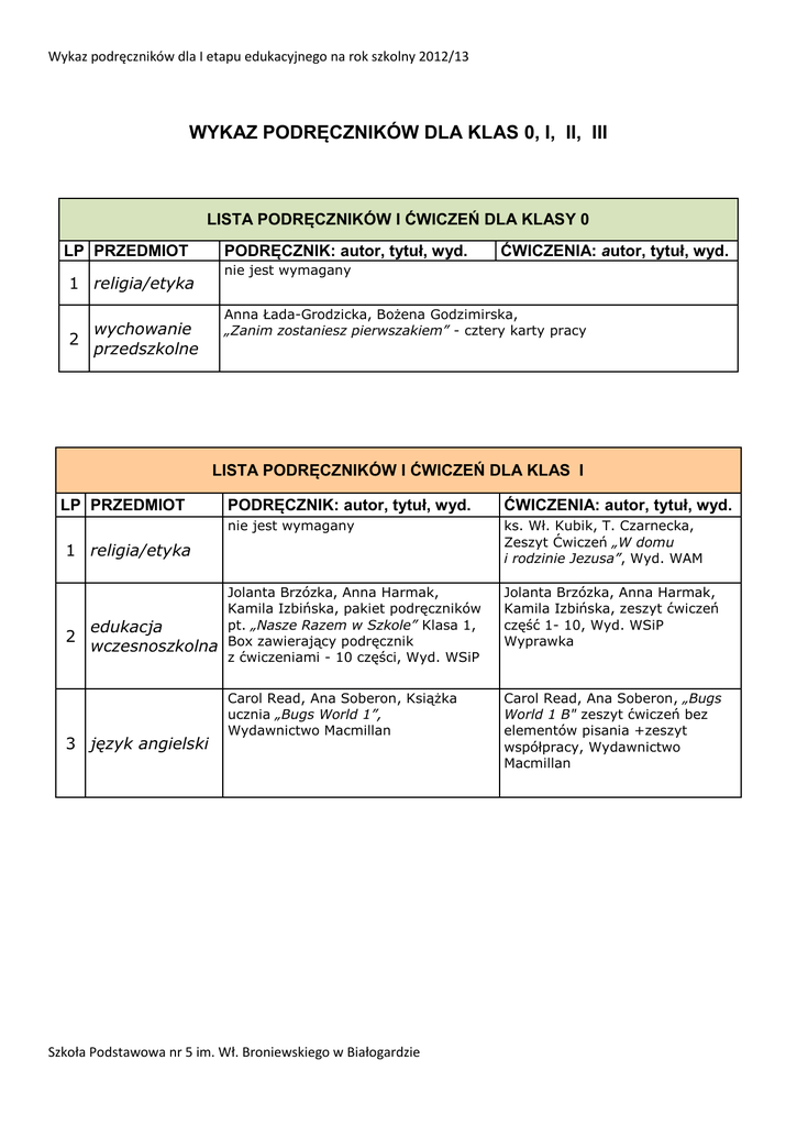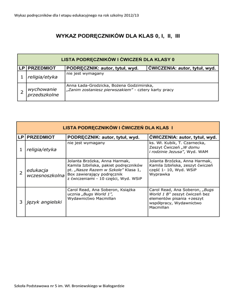 Wykaz podręczników dla I etapu edukacyjnego na rok szkolny 2012/13 WYKAZ PODRĘCZNIKÓW DLA KLAS 0, I, II, III LISTA PODRĘCZNIKÓW I ĆWICZEŃ DLA KLASY 0 PODRĘCZNIK: autor, tytuł, wyd. LP PRZEDMIOT ĆWICZENIA: autor, tytuł, wyd. nie jest wymagany 1 religia/etyka Anna Łada-Grodzicka, Bożena Godzimirska, „Zanim zostaniesz pierwszakiem” - cztery karty pracy wychowanie 2 przedszkolne LISTA PODRĘCZNIKÓW I ĆWICZEŃ DLA KLAS I LP PRZEDMIOT PODRĘCZNIK: autor, tytuł, wyd. ĆWICZENIA: autor, tytuł, wyd. nie jest wymagany ks. Wł. Kubik, T. Czarnecka, Zeszyt Ćwiczeń „W domu i rodzinie Jezusa”, Wyd. WAM Jolanta Brzózka, Anna Harmak, Kamila Izbińska, pakiet podręczników pt. „Nasze Razem w Szkole” Klasa 1, Box zawierający podręcznik z ćwiczeniami - 10 części, Wyd. WSiP Jolanta Brzózka, Anna Harmak, Kamila Izbińska, zeszyt ćwiczeń część 1- 10, Wyd. WSiP Wyprawka Carol Read, Ana Soberon, Książka ucznia „Bugs World 1”, Wydawnictwo Macmillan Carol Read, Ana Soberon, „Bugs World 1 B" zeszyt ćwiczeń bez elementów pisania +zeszyt współpracy, Wydawnictwo Macmillan 1 religia/etyka 2 edukacja wczesnoszkolna 3 język angielski Szkoła Podstawowa nr 5 im. Wł. Broniewskiego w Białogardzie Wykaz podręczników dla I etapu edukacyjnego na rok szkolny 2012/13 LISTA PODRĘCZNIKÓW I ĆWICZEŃ DLA KLAS II LP PRZEDMIOT 1 religia/etyka 2 edukacja wczesnoszkolna 3 język angielski PODRĘCZNIK: autor, tytuł, wyd. ĆWICZENIA: autor, tytuł, wyd. ks. Wł. Kubik, T. Czarnecka, „Bliscy sercu Jezusa”, Wyd. WAM ks. Wł. Kubik, T. Czarnecka, Zeszyt Ćwiczeń „Bliscy sercu Jezusa”, Wyd. WAM J. Brzózka, K. Glinka, K. Harmak, K. Izbińska, A. Jasiocha, W. Went, „Razem w szkole” Edukacja wczesnoszkolna w klasie 2. Box dla ucznia zawierający podręcznik z ćwiczeniami, części 1-10, zeszyt, części 1-10, wyprawka, płyta CD „Bawię się i uczę w klasie 2”, podręcznik do zajęć komputerowych z ćwiczeniami i płytą CD, okulary trójwymiarowe, Wyd. WSiP Carol Read, Ana Soberon, Książka ucznia „Bugs World 2”, Wydawnictwo Macmillan Carol Read, Ana Soberon, „Bugs World 2 B" zeszyt ćwiczeń, Wydawnictwo Macmillan LISTA PODRĘCZNIKÓW I ĆWICZEŃ DLA KLAS III LP PRZEDMIOT 1 religia/etyka 2 edukacja wczesnoszkolna 3 język angielski PODRĘCZNIK: autor, tytuł, wyd. ĆWICZENIA: autor, tytuł, wyd. ks. Wł. Kubik, T. Czarnecka, ks. Wł. Kubik, T. Czarnecka, „Jezusowa wspólnota serc”, Wyd. WAM Zeszyt Ćwiczeń „Jezusowa wspólnota serc”, Wyd. WAM Praca zbiorowa: Klimkowska, Sieńczewska, Waszkiewicz, PAKIET „Raz dwa trzy, teraz my!”: Podręcznik (cz. 1-2), Ćwiczenia zintegrowane (cz. 1-4), Matematyka (cz. 1-4), Wycinanki (cz. 1-2), Wyd. NOWA ERA Michał Kęsy, „Zajęcia komputerowe. Podręcznik z ćwiczeniami klasa 3”, NOWA ERA Elisenda Papiol, Maria Toth, Magdalena Kondro, „Bugs World 3", Wydawnictwo Macmillan Elisenda Papiol, Maria Toth, Magdalena Kondro, zeszyt ćwiczeń „Bugs World 3", Wydawnictwo Macmillan Szkoła Podstawowa nr 5 im. Wł. Broniewskiego w Białogardzie