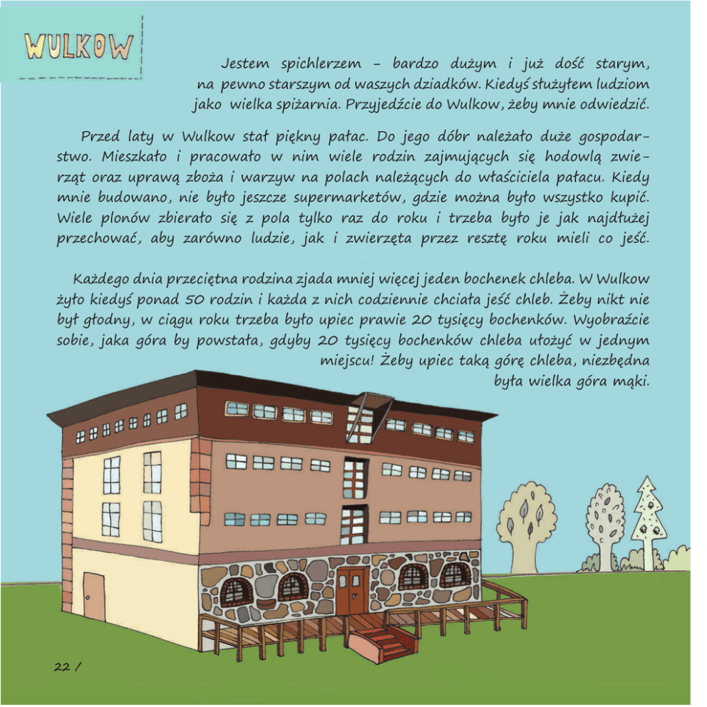 Jestem spichlerzem − bardzo dużym i już dość starym, na pewno starszym od waszych dziadków. Kiedyś służyłem ludziom jako wielka spiżarnia. Przyjedźcie do Wulkow, żeby mnie odwiedzić. Przed laty w Wulkow stał piękny pałac. Do jego dóbr należało duże gospodarstwo. Mieszkało i pracowało w nim wiele rodzin zajmujących się hodowlą zwierząt oraz uprawą zboża i warzyw na polach należących do właściciela pałacu. Kiedy mnie budowano, nie było jeszcze supermarketów, gdzie można było wszystko kupić. Wiele plonów zbierało się z pola tylko raz do roku i trzeba było je jak najdłużej przechować, aby zarówno ludzie, jak i zwierzęta przez resztę roku mieli co jeść. Każdego dnia przeciętna rodzina zjada mniej więcej jeden bochenek chleba. W Wulkow żyło kiedyś ponad 50 rodzin i każda z nich codziennie chciała jeść chleb. Żeby nikt nie był głodny, w ciągu roku trzeba było upiec prawie 20 tysięcy bochenków. Wyobraźcie sobie, jaka góra by powstała, gdyby 20 tysięcy bochenków chleba ułożyć w jednym miejscu! Żeby upiec taką górę chleba, niezbędna była wielka góra mąki. 22 / Zboże na tę mąkę trzeba było przechowywać w suchym miejscu. Do tego właśnie konieczny był duży spichlerz. Wybudowano więc mnie! Przez wiele lat wozy zaprzężone w konie przywoziły do mnie ziarno, z którego usypywano wielkie stosy. Gdy potrzebna była mąka, ziarno zawożono do pobliskiego młyna, gdzie młynarz je mielił. Jeśli plony były obite, trochę mąki zostawało i można było ją sprzedać. Byłem bardzo użyteczny. Po jakimś czasie ludzie zaczęli się przeprowadzać do miasta, a ich domy pustoszały. Także pałac opustoszał i powoli popadał w ruinę. Zboże przechowywano w innych miejscach i nie byłem już potrzebny. W moich ścianach pojawiły się rysy, dach zaczął przeciekać, a jedynymi lokatorami były myszy. Na szczęście znalazło się kilkunastu mieszkańców Wulkow, którzy pragnęli, aby wieś znowu stała się ładna i ciekawa. Szukali dla mnie nowego zastosowania – przecież wciąż byłem ogromnym budynkiem w samym środku wsi! Wyremontowano mnie z zewnątrz i przebudowano w środku. W dużych magazynach pod dachem urządzono małe przytulne pokoje, w których mogą teraz nocować goście. W innych pomieszczeniach, gdzie kiedyś składowano zboże, świętuje się różne wydarzenia, a artyści wystawiają swoje prace. Na samym dole jest nawet sklep i kawiarnia, gdzie można kupić różne smakołyki. Czasem mamy gości, którzy specjalnie przyjeżdżają z daleka, by spędzić dzień w naszej pięknej wsi. Od niedawna mam nowe imię: Ekospichlerz. Mam też nowych lokatorów – stowarzyszenie, które zajmuje się ochroną środowiska. Ludzie coraz częściej chcą żyć w harmonii ze zwierzętami i z całą naturą. Chcą sami wytwarzać jak najwięcej produktów spożywczych i własnoręcznie wykonywać niezbędne przedmioty. Ważne jest też, by prąd i ciepło były produkowane bez szkody dla otoczenia. Dzięki różnym działaniom chroniącym przyrodę nasza wieś dostała już nawet różne nagrody, a ja znowu jestem ważny. No, a teraz możecie mnie sobie dokładnie obejrzeć i wyruszyć na wyprawę po całym Wulkow – wyobraźcie sobie, że mamy tu nawet UFO! / 23 4/ Spróbuj znaleźć w Wulkow to okno ! Dowiedz się, dlaczego budynek na skraju wsi ma kształt UFO. Wybierz jedną roślinę, która rośnie w ogrodzie ziołowym. Dowiedz się, jak się nazywa, jak się jej używa i narysuj ją tutaj. Tak kiedyś wyglądała wieża pałacu w Wulkow. Dziś już jej nie ma. Czy znasz jakiś budynek w swojej miejscowości, którego wygląd się zmienił albo który przestał istnieć ? / 25