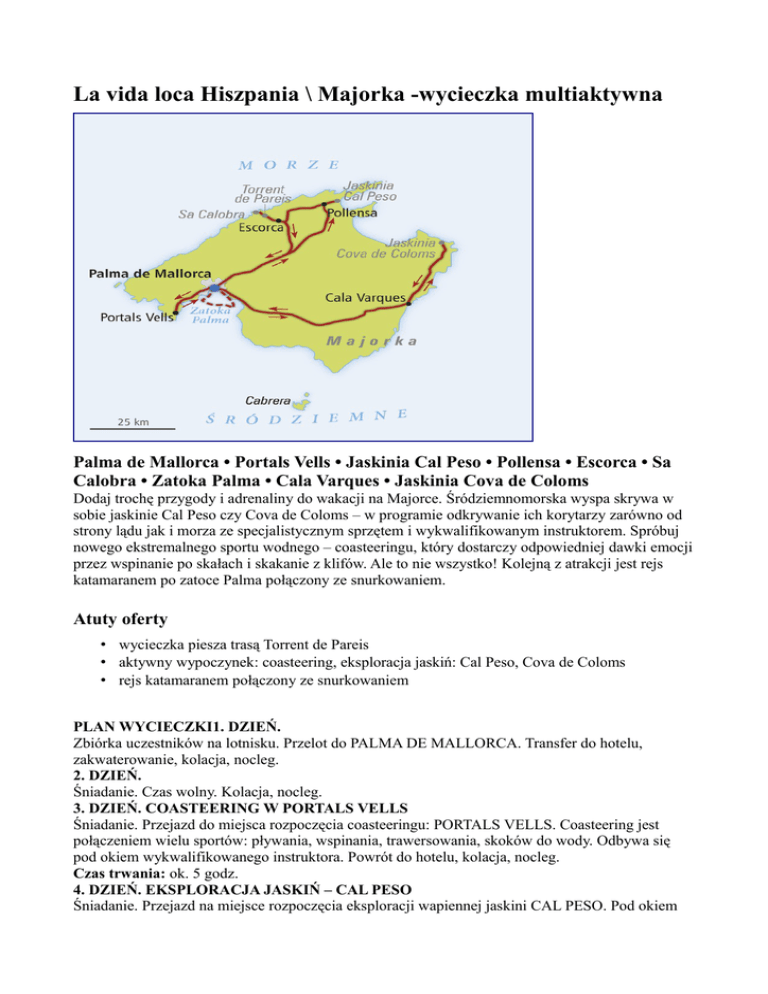 La vida loca Hiszpania \ Majorka -wycieczka multiaktywna Palma de Mallorca • Portals Vells • Jaskinia Cal Peso • Pollensa • Escorca • Sa Calobra • Zatoka Palma • Cala Varques • Jaskinia Cova de Coloms Dodaj trochę przygody i adrenaliny do wakacji na Majorce. Śródziemnomorska wyspa skrywa w sobie jaskinie Cal Peso czy Cova de Coloms – w programie odkrywanie ich korytarzy zarówno od strony lądu jak i morza ze specjalistycznym sprzętem i wykwalifikowanym instruktorem. Spróbuj nowego ekstremalnego sportu wodnego – coasteeringu, który dostarczy odpowiedniej dawki emocji przez wspinanie po skałach i skakanie z klifów. Ale to nie wszystko! Kolejną z atrakcji jest rejs katamaranem po zatoce Palma połączony ze snurkowaniem. Atuty oferty • wycieczka piesza trasą Torrent de Pareis • aktywny wypoczynek: coasteering, eksploracja jaskiń: Cal Peso, Cova de Coloms • rejs katamaranem połączony ze snurkowaniem PLAN WYCIECZKI1. DZIEŃ. Zbiórka uczestników na lotnisku. Przelot do PALMA DE MALLORCA. Transfer do hotelu, zakwaterowanie, kolacja, nocleg. 2. DZIEŃ. Śniadanie. Czas wolny. Kolacja, nocleg. 3. DZIEŃ. COASTEERING W PORTALS VELLS Śniadanie. Przejazd do miejsca rozpoczęcia coasteeringu: PORTALS VELLS. Coasteering jest połączeniem wielu sportów: pływania, wspinania, trawersowania, skoków do wody. Odbywa się pod okiem wykwalifikowanego instruktora. Powrót do hotelu, kolacja, nocleg. Czas trwania: ok. 5 godz. 4. DZIEŃ. EKSPLORACJA JASKIŃ – CAL PESO Śniadanie. Przejazd na miejsce rozpoczęcia eksploracji wapiennej jaskini CAL PESO. Pod okiem profesjonalnego instruktora zostanie przemierzona sieć korytarzy jaskiń. Podziwianie bogactw form rzeźby naciekowej: stalagmitów, stalaktytów, draperii. Przejazd do POLLENSY. Czas wolny na spacer po urokliwych uliczkach miasteczka. Powrót do hotelu, kolacja, nocleg. Czas trwania: ok. 5 godz. 5. DZIEŃ. TORRENT DE PAREIS (ESCORCA – SA CALobra) Śniadanie. Przejazd do ESCORCA (ok. 880 m n.p.m.). Wycieczka piesza do SA CALobra. Trasa prowadzi przez 6-kilometrowy wąwóz - Torrent de Pareis, którego dnem płynie potok. Szlak kończy się piaszczystą plażą. Powrót do hotelu. Czas wolny. Kolacja, nocleg. Trasa piesza: ok. 6 km, czas trwania: ok. 4-6 godz. 6. DZIEŃ. REJS KATAMARANEM PO ZATOCE PALMA – SNURKOWANIE Śniadanie. Przejazd do portu w Palma de Mallorca. Rejs katamaranem połączony ze snurkowaniem w ZATOCE PALMA. Na pokładzie BBQ z napojami wliczone w cenę. Powrót do hotelu, kolacja, nocleg. 7. DZIEŃ. MORSKA JASKINIA COVA DE COLOMS Śniadanie. Przejazd do CALA VARQUES. Odkrywanie morskiej JASKINI COVA DE COLOMS pod okiem instruktora. Przepłynięcie do środka jaskini, przejście przez komnaty, podziemne jeziora. Powrót do hotelu, kolacja, nocleg. Czas trwania: ok. 5 godz. 8. DZIEŃ. Zależnie od godziny wylotu: śniadanie, czas wolny, transfer na lotnisko i wylot do Polski. Dla osób, które przedłużają pobyt o tygodniowy wypoczynek: śniadanie, wykwaterowanie, transfer do wybranego hotelu. ŚWIADCZENIA 7 noclegów w hotelu*** ; 2-os. pokoje (możliwość 1 dostawki) z łazienkami • wyżywienie: 7 śniadań, 7 kolacji, BBQ z napojami (5. dzień) • przelot • transfery minibusem wg programu • lokalny instruktor (j. angielski) • opieka rezydenta • aktywności wymienione w programie wraz z niezbędnym sprzętem • ubezpieczenie KL i NW Itaka Complex rozszerzone o następstwa uprawiania sportów wysokiego ryzyka UWAGI: 1. Program przeznaczony dla osób pełnoletnich, zdrowych, sprawnych fizycznie, przygotowanych kondycyjnie do aktywności zawartych w programie. 2. Program może ulec zmianie zależnie od warunków atmosferycznych.