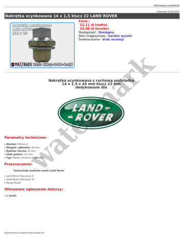 Informacje o produkcie Utworzono 02-03-2017 Nakrętka ocynkowana 14 x 1,5 klucz 22 LAND ROVER Cena : 12,11 zł (netto) 14,90 zł (brutto) er m ar k Dostępność : Dostępny Stan magazynowy : bardzo wysoki Średnia ocena : brak recenzji Nakrętka ocynkowana z ruchomą podkładka 14 x 1.5 x 44 mm klucz 22 mm dedykowane dla ● ● ● ● Wymiar: M14x1,5 Długość całkowita: 44 mm Rozmiar klucza: 22 mm Skok gwintu: 1,5 mm Typ: Płaska ruchoma podkładka w ● at Parametry techniczne: Przeznaczenie: Samochody osobowe marki Land Rover ● ● ● Land Rover Discovery II Land Rover Discovery III Range Rover Oferowane ogłoszenie dotyczy: ● 1 sztuki Wygenerowano w programie www.oscGold.com er m ar k at w w at er m ar k Informacje o produkcie Wygenerowano w programie www.oscGold.com