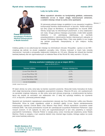 Rynek wina - komentarz miesięczny marzec 2015 Luty na rynku wina Mimo wysokich obrotów na londyńskiej giełdzie, notowania indeksów Liv-ex w lutym uległy nieznacznym zmianom, a ostatni miesiąc minął na rynku wina spokojnie. Paweł Morozowicz Zarządzający Portfelami Alkoholi Inwestycyjnych w Wealth Solutions W pierwszej połowie lutego na giełdzie Liv-ex zauważyć mogliśmy kontynuację trendów obserwowanych w styczniu. Nadal widoczny był silny popyt na Bordeaux, w szczególności na rocznik 2005. Obroty wciąż były na rekordowych poziomach, a ceny większości win rosły. Druga połowa miesiąca przyniosła z kolei lekki spadek indeksów i ich późniejszą stabilizację, co wynikało prawdopodobnie z zakończenia bardzo intensywnych zakupów w okresie Chińskiego Nowego Roku. Cały czas giełda Liv-ex mogła się jednak pochwalić niespotykaną w tym miejscu liczbą transakcji. Indeksy giełdy Liv-ex zakończyły ten miesiąc na minimalnym minusie. Wszystkie - oprócz Liv-ex 500 znajdują się jednak na plusie względem początku roku. Zmiany notowań w lutym były zresztą nieznaczne i wynosiły w przypadku większości indeksów ok. 0,5 proc. Miesiąc ten okazał się również bardziej łaskawy dla win zgormadzonych w indeksie Rest of the World 50, który wzrósł o 1,8 proc. Zmiany wartości indeksów Liv-ex w lutym 2015 r. (stan na 28.02.2015 r.) Nazwa indeksu Zmiana miesięczna Liv-ex Fine Wine 50 -0,7% Liv-ex Fine Wine 100 -0,4% Liv-ex Bordeaux 500 -0,6% Liv-ex Fine Wine 1000 -0,4% Liv-ex Investables -0,4% źródło: www.liv-ex.com W lutym obroty na rynku wina były na bardzo wysokim poziomie. Stosunek liczby transakcji do liczby ofert uległ nieznacznej zmianie względem poprzednich miesięcy. Obecnie 50 proc. win wystawionych na sprzedaż znajduje nabywcę, co dla rynku wina jest zdrową proporcją, a przekroczenie tej bariery łączy się zwykle ze wzrostem cen większości win. Z taką też sytuacją mieliśmy do czynienia m.in. w styczniu i pierwszej połowie lutego. Spośród win bordoskich największym powodzeniem cieszyły się Cos d’Estournel, Lafite oraz Mouton Rothschild. Wina te miały największy udział w obrotach giełdy Liv-ex. Spore zainteresowanie towarzyszyło również Cheval Blanc oraz Mission Haut Brion. Wśród bordoskich roczników nadal królował 2005. Tak duże powodzenie rocznik ten zawdzięczał oczywiście Robertowi Parkerowi i jego nowym ocenom. O ich wpływie na ceny win wyprodukowanych w tym roku pisaliśmy w naszym poprzednim komentarzu. Obecnie Parker w swojej pracy coraz mocniej jest wspierany przez Neala Martina. Warto w związku z tym uważnie śledzić noty również tego krytyka, którego wpływ na rynek jest coraz bardziej widoczny. Wealth Solutions S.A. ul. Chmielna 19, 00-021 Warszawa tel. 22/ 378 99 50, fax: 22/ 378 99 51 www.wealth.pl Strona | 1 Rynek wina - komentarz miesięczny marzec 2015 Luty był dobrym miesiącem dla win włoskich, które zgromadziły pod swoimi skrzydłami 6,3 proc. rynku. Szczególnym powodzeniem cieszyły się Argiano, Brunello Montalcino. Wśród win włoskich królował rocznik 2010, który odpowiadał aż za 25 proc. obrotów winem z Półwyspu Apenińskiego. Opisywana sytuacja znalazła swoje odzwierciedlanie w zestawieniu pięciu najszybciej drożejących win w lutym. W rankingu tym znalazły się bowiem wina toskańskie oraz te pochodzące z Pauliac. Ciekawską jest również obecność rzadko spotykanego w tym w tym gronie Porto. Strona | 2 Pięć najszybciej drożejących win na giełdzie Liv-ex w lutym 2015 r. Wino Rocznik Średnia cena w lutym 2015 r. (GBP)* Grand Puy Lacoste 2005 724 11,4% Masseto 2009 3 720 11,2% Taylor 2011 545 9,0% Tignanello 2011 489 7,2% Lynch Bages 2012 568 6,4% źródło: www.liv-ex.com Wzrost ceny *za 12-butelkową skrzynkę Dolar i wino Wpływ na rynek wina ma i w najbliższym czasie mieć będzie umacniający się dolar. Oczywiście wzrost wartości amerykańskiej waluty oznacza większą aktywność kupujących z rynków azjatyckich oraz z Stanów Zjednoczonych. Wino po przeliczeniu jego ceny na dolary jest obecnie tańsze niż rok, czy nawet kilka miesięcy temu. Taka sytuacja zachęca nabywców, którzy na co dzień operują amerykańską walutą, do większych zakupów. Mocny dolar w najbliższym roku powinien mieć w związku z tym pozytywny wpływ na rynek wina i będzie się z pewnością przekładał na wyższe obroty. Pavie 2012 Z ciekawych informacji z ostatniego miesiąca warto wspomnieć, że Chateau Pavie postanowiło wypuścić na rynek rocznik 2012 w czarnych butelkach, ozdobionych srebrnymi literami. W ten sposób świętować będzie pojawienie się pierwszego rocznika Pavie w Grand Cru Classe „A” klasyfikacji dla Saint-Emilion. W 2012 r. razem z Pavie zaszczytu zmiany miejsca w klasyfikacji doświadczył również Angelus. Fakt ten oczywiście odbił się na wycenach obu win. Wiadomość o zmianie opakowania również zaowocowała zwiększonym popytem na Pavie i wzrostem jego ceny. Nowy rocznik po ogłoszeniu tej informacji zdrożał u negocjantów z 180 do 250 funtów za butelkę. Parker i en primeur Ostatni miesiąc obfitował w wiele informacji prasowych oraz spekulacji dotyczących zbliżającej się kampanii. Rocznik 2014 jest wstępnie uznawany za pierwszy, ogólnie dobry rocznik dla całego Bordeaux od 2010 roku. Rynek dodatkowo rozgrzała informacja o wycofaniu się Roberta Parkera z oceny win w kampanii en primeur. W imieniu stworzonego przez Parkera The Wine Advocate, próbami beczkowymi ma się od tego roku zajmować Neal Martin. Oznajmiając tę zmianę, Parker stwierdził, że nie zaprzestanie oceny roczników starszych i zamierza wystawić pierwsze noty dla debiutującego rocznika 2012 oraz niedocenionego przez krytyka dekadę temu rocznika 2005. Komunikat ten ma na celu wywarcie presji na producentach, by wrócili do racjonalnego poziomu wyceny dla win sprzedawanych w beczkach. Czy odniesie on zamierzony efekt? To poka