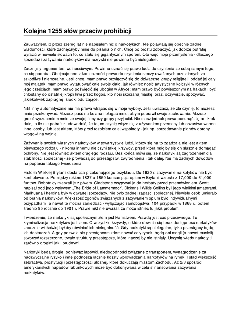 Kolejne 1255 słów przeciw prohibicji Zauważyłem, iż przez szereg lat nie napisałem nic o narkotykach. Nie pojawiają się obecnie żadne wiadomości, które zachęcałyby mnie do pisania o nich. Chcę po prostu zobaczyć, jak dobrze potrafię wyrazić w niewielu słowach to, co stało się gigantycznym sporem. Oto więc moje przemyślenia - dlaczego sprzedaż i zażywanie narkotyków dla rozrywki nie powinno być nielegalne. Zacznijmy argumentem wolnościowym. Powinno uznać się prawo ludzi do czynienia ze sobą samym tego, co się podoba. Obejmuje ono z konieczności prawo do czynienia rzeczy uważanych przez innych za szkodliwe i niemoralne. Jeśli chcę, mam prawo przyłączyć się do dziwacznej grupy religijnej i oddać jej cały mój majątek; mam prawo wytatuować całe swoje ciało, jak również nosić artystyczne kolczyki w różnych jego częściach; mam prawo poświęcić się ubogim w Afryce; mam prawo być powieszonym na hakach i być chłostany do ostatniej kropli krwi przez kogoś, kto nosi skórzaną maskę; oraz, oczywiście, spożywać, jakiekolwiek zapragnę, środki odurzające. Nikt inny automatycznie nie ma prawa wtrącać się w moje wybory. Jeśli uważasz, że źle czynię, to możesz mnie przekonywać. Możesz paść na kolana i błagać mnie, abym poprawił swoje zachowanie. Możesz grozić wyrzuceniem mnie ze swojej firmy czy grupy przyjaciół. Nie masz jednak prawa posunąć się ani krok dalej, o ile nie potrafisz udowodnić, że to, co czynię wiąże się z używaniem przemocy lub oszustwa wobec innej osoby, lub jest aktem, który grozi rozbiciem całej wspólnoty - jak np. sprzedawanie planów obrony wrogowi na wojnie. Zażywanie swoich własnych narkotyków w towarzystwie ludzi, którzy się na to zgadzają nie jest aktem pierwszego rodzaju - nikomu innemu nie czyni takiej krzywdy, przed którą mógłby się on słusznie domagać ochrony. Nie jest również aktem drugiego rodzaju. Bez końca mówi się, że narkotyki są zagrożeniem dla stabilności społecznej - że prowadzą do przestępstw, zwyrodnienia i tak dalej. Nie ma żadnych dowodów na poparcie takiego twierdzenia. Historia Wielkiej Brytanii dostarcza przekonującego przykładu. Do 1920 r. zażywanie narkotyków nie było kontrolowane. Pomiędzy rokiem 1827 a 1859 konsumpcja opium w Brytanii wzrosła z 17,000 do 61,000 funtów. Robotnicy mieszali je z piwem. Gladstone wsypywał je do herbaty przed przemówieniem. Scott napisał pod jego wpływem „The Bride of Lammermoor”. Dickens i Wilkie Collins byli jego wielkimi amatorami. Marihuana i heroina były w otwartej sprzedaży. Nie było żadnej zapaści społecznej. Niewiele osób umierało od brania narkotyków. Większość zgonów związanych z zażywaniem opium było indywidualnymi przypadkami, a nawet te można zaniedbać - wyłączając samobójstwa: 104 przypadki w 1868 r., potem średnio 95 rocznie do 1901 r. Prawie nikt nie uważał, że może istnieć tu jakiś problem. Twierdzenie, że narkotyki są społecznym złem jest kłamstwem. Prawdą jest coś przeciwnego. To kryminalizacja narkotyków jest złem. O wszystkie krzywdy, o które obwinia się teraz dostępność narkotyków znacznie właściwiej byłoby obwiniać ich nielegalność. Gdy narkotyki są nielegalne, tylko przestępcy będą ich dostarczać. A gdy pozwala się przestępcom zdominować cały rynek, będą oni mogli (a nawet musieli) stworzyć rozszerzone, trwałe struktury przestępcze, które inaczej by nie istniały. Uczynią wtedy narkotyki zarówno drogimi jak i brudnymi. Narkotyki będą drogie, ponieważ łapówki, niedogodności związane z transportem, wynagrodzenie za nadzwyczajne ryzyko i inne podnoszą łącznie koszty wprowadzania narkotyków na rynek. I stąd większość żebractwa, prostytucji i przestępczości ulicznej, które dokuczają miastom Zachodu. Aż 2/3 spośród amerykańskich napadów rabunkowych może być dokonywana w celu sfinansowania zażywania narkotyków. Narkotyki będą skażone, ponieważ na nielegalnych rynkach brak jest gwarancji jakości. Jeśli na butelce piwa napisane jest „8 procent objętości stanowi alkohol”, to nie oznacza to jakiejś tam wartości pomiędzy 0,5 a 30 procent. Nie będzie się również wywoływać musowania piwa przy pomocy sody kaustycznej. Browarnicy mają zbyt wiele do stracenia, by pozwolić sobie na zatruwanie lub oszukiwanie klientów. Dealerzy narkotykowi mogą sobie na to pozwolić. I stąd częste przedawkowania. I stąd trujące dodatki. I stąd rozprzestrzenianie się AIDS - nawet dziś - poprzez skażone igły. Od kosztów przestępczości spowodowanych nielegalnością przejdźmy do kosztów egzekwowania prawa. Są one również ogromne. Po pierwsze, policja, jeżeli chce egzekwować prawa, które nie wskazują ofiary składającej zażalenie lub pomagającej w śledztwie, musi przekształcić się w niemalże gestapo. Potrzebuje uprawnień do zatrzymywania i przeszukiwania ludzi oraz do przeszukiwania prywatnych domów - co nigdy nie byłoby potrzebne dla powstrzymywania takich rzeczy, jak włamania czy morderstwa. Potrzebuje zaangażować się w prowokacje. Jest wystawiona na oferty łapówek - często zbyt dużych by odmówić. W ten czy inny sposób, „wojna z narkotykami” prowadzi do skorumpowania wszelkich służb zaangażowanych w tę bitwę. A ta wojna nie może być wygrana. Brytyjskie Cła i Akcyza (urząd zajmujący się w Wielkiej Brytanii poborem ceł i podatków pośrednich - przyp. tłum) nie muszą się martwić o żadne granice. Mogą śledzić każdą łódź i każdy samolot, który wkracza na terytorium brytyjskie. Mają znacznie szersze uprawnienia śledcze niż zwyczajna policja. Mimo tego, sami szacują, iż zatrzymują mniej niż trzy procent narkotyków przemycanych każdego roku do Zjednoczonego Królestwa. Po drugie mamy wojnę z praniem pieniędzy. Ponieważ powstrzymanie importu i sprzedaży narkotyków jest niemożliwe, w ostatnich latach prz